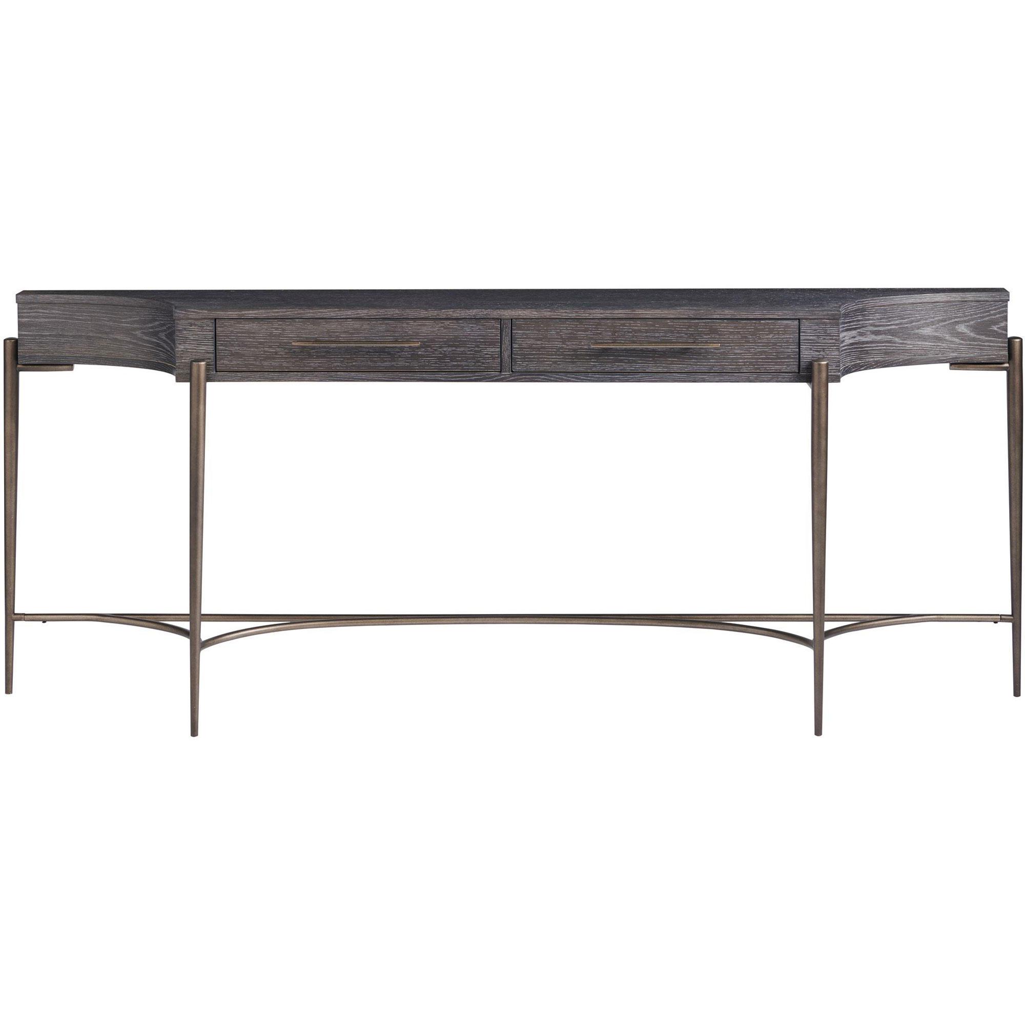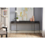 The Oslo Console Table introduces an airy, mid-century aesthetic into spaces, featuring a long, narrow body supported by tall, stately bronzed legs.