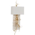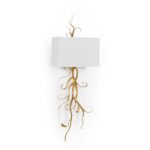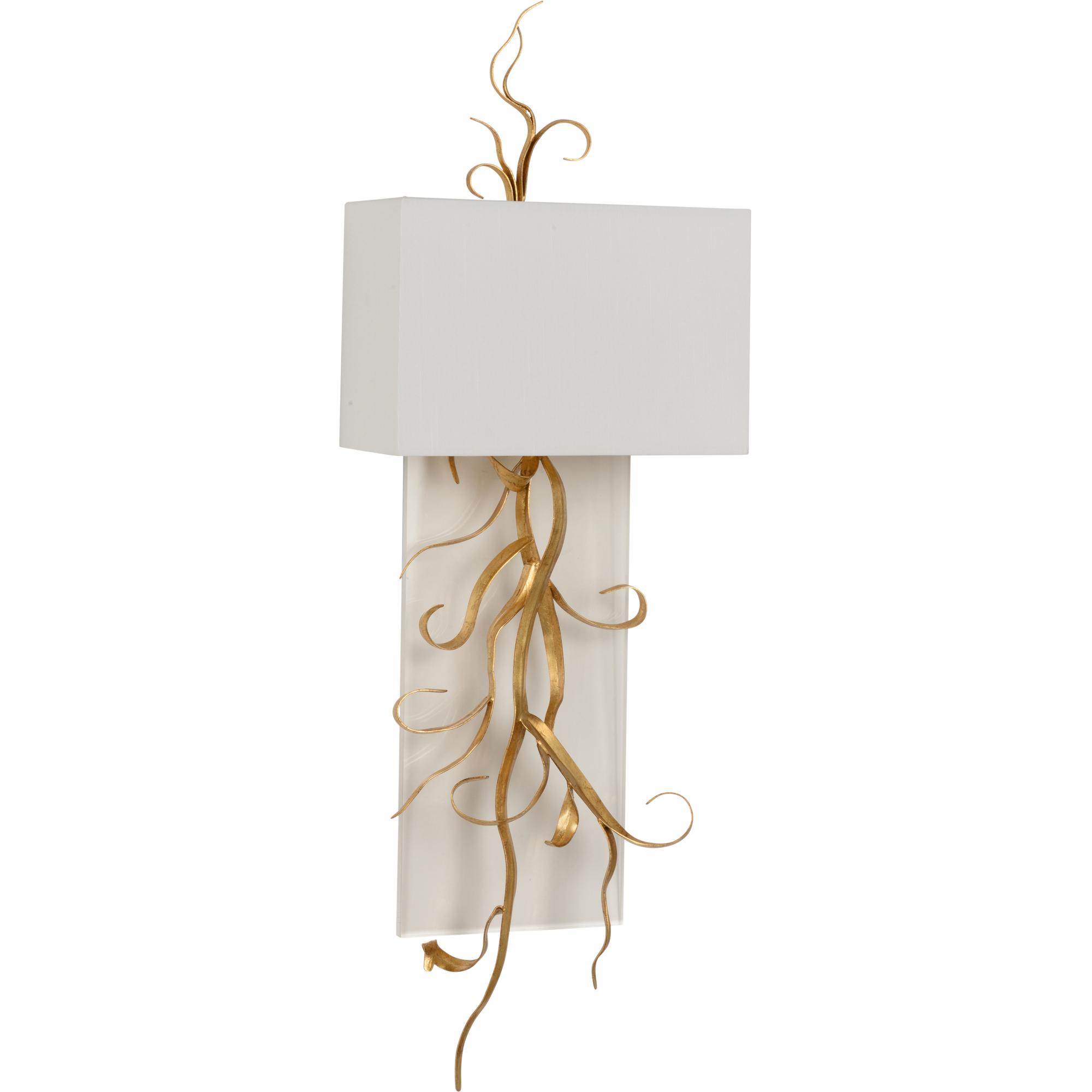 The Curling Leaves Sconce features delicate iron leaves, elegantly curled and finished in gold, resting against a sleek acrylic panel. Topped with a crisp white square shade, this sophisticated design combines natural elements with modern materials.
