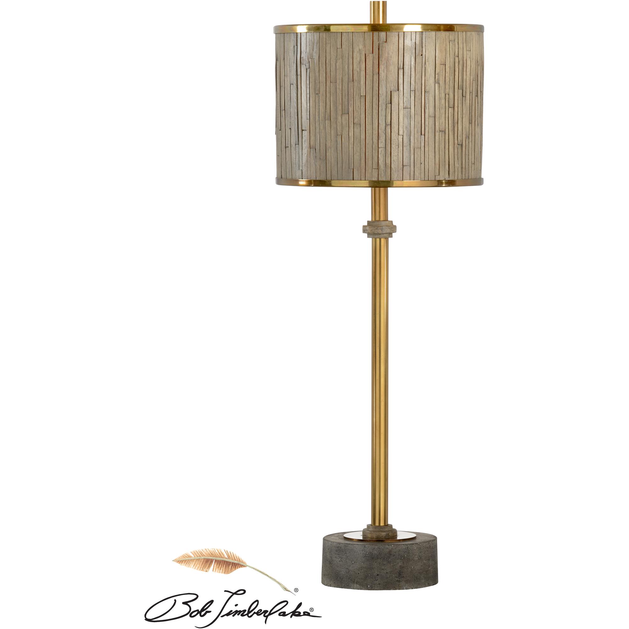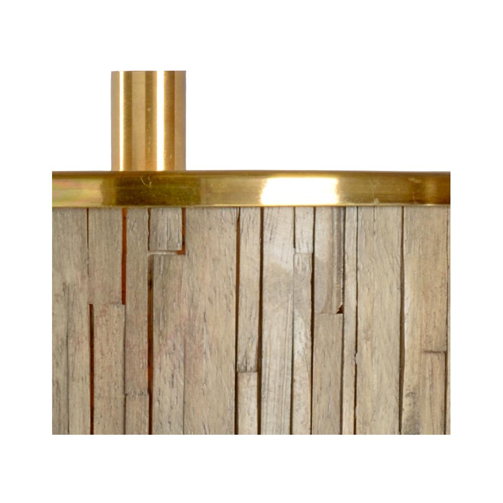 Antique brass on iron, concrete mounting, driftwood finished wood strips on shade with antique brass trim.