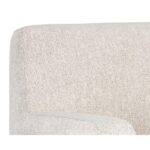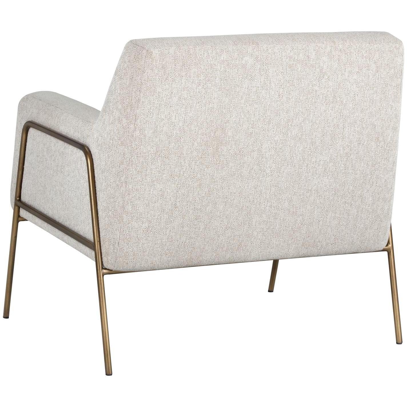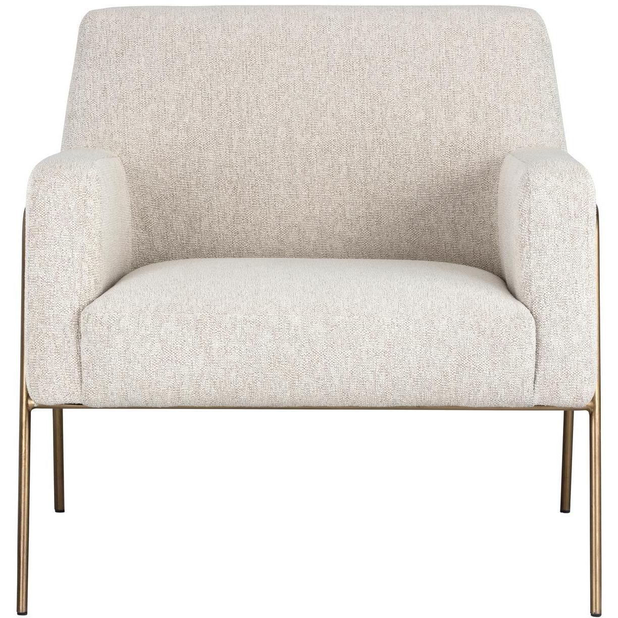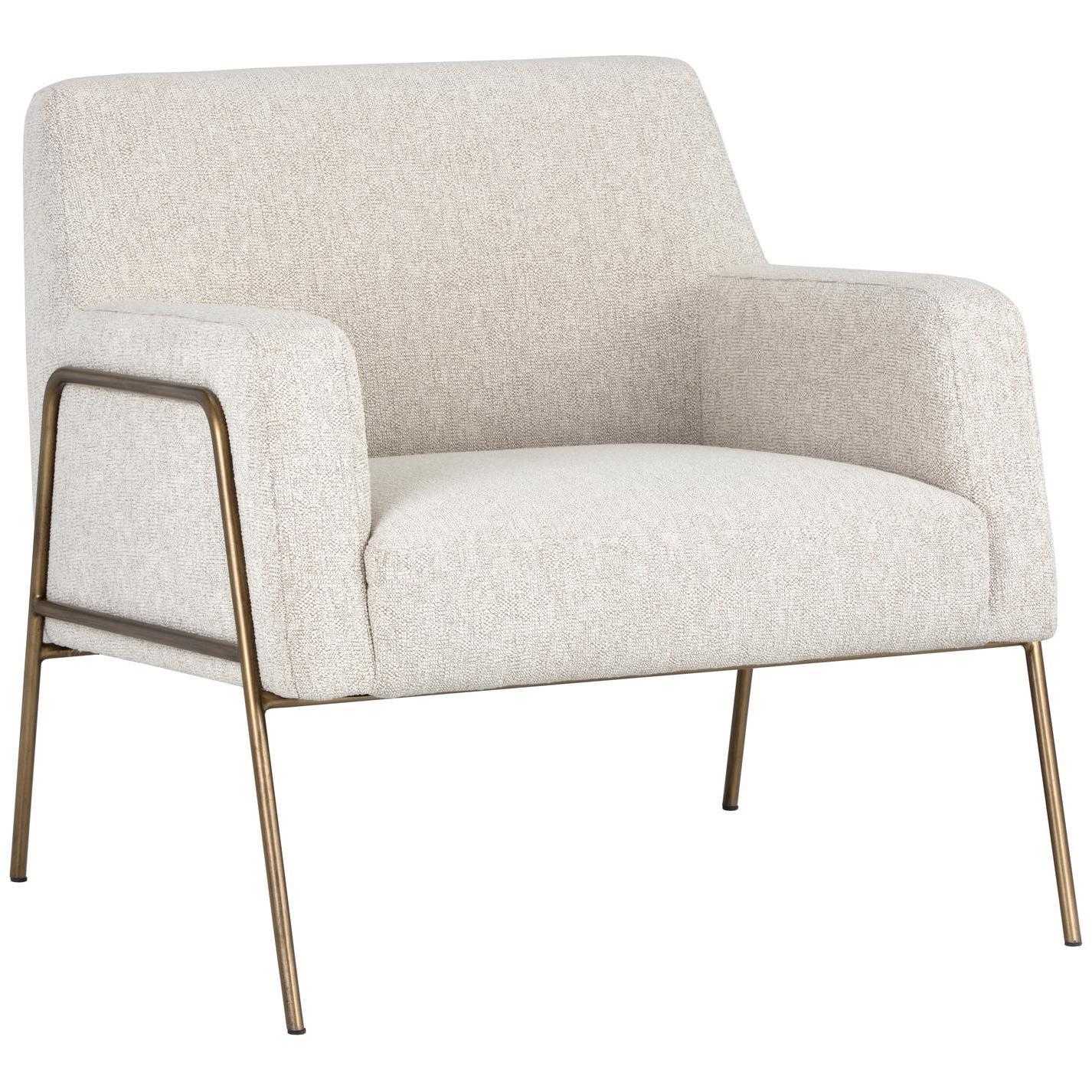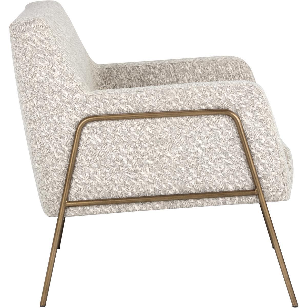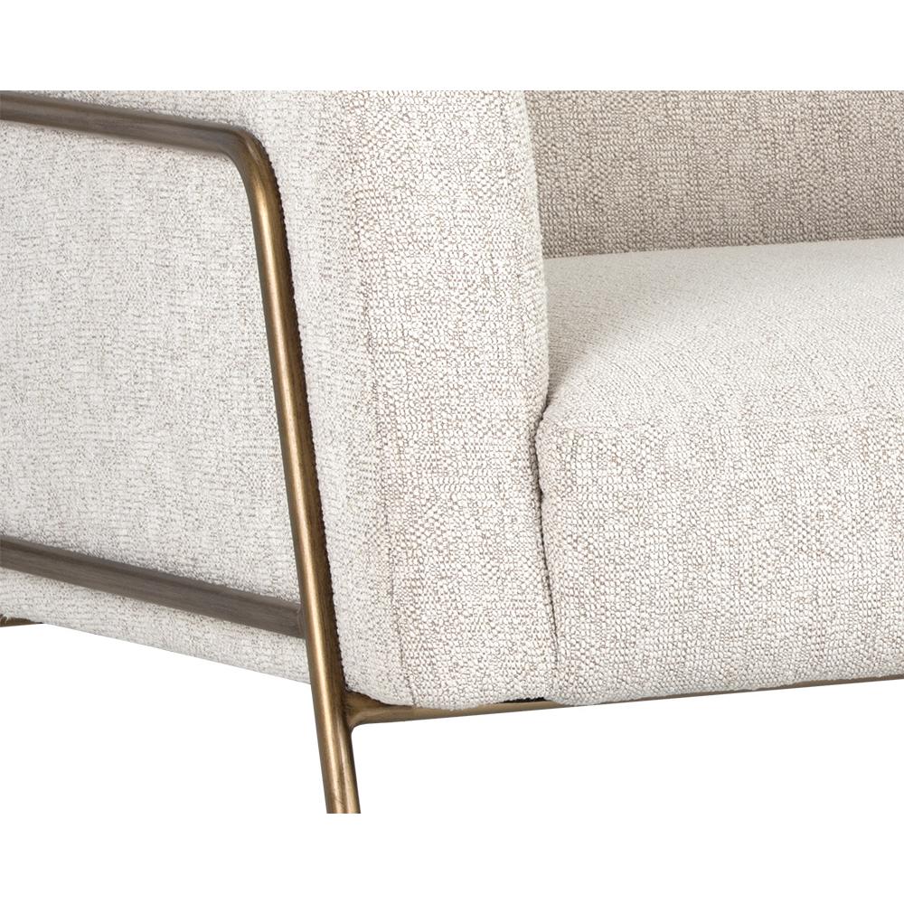 A stylish and comfortable armchair. Designed with a modern frame featuring exposed antique brass legs. Available in dove cream fabric or polo club kohl grey performance fabric.