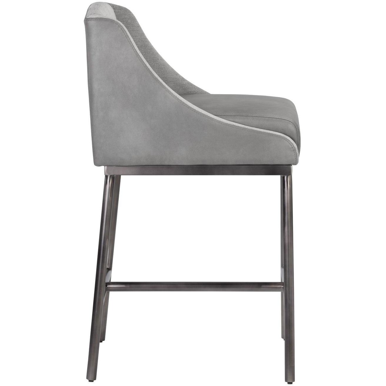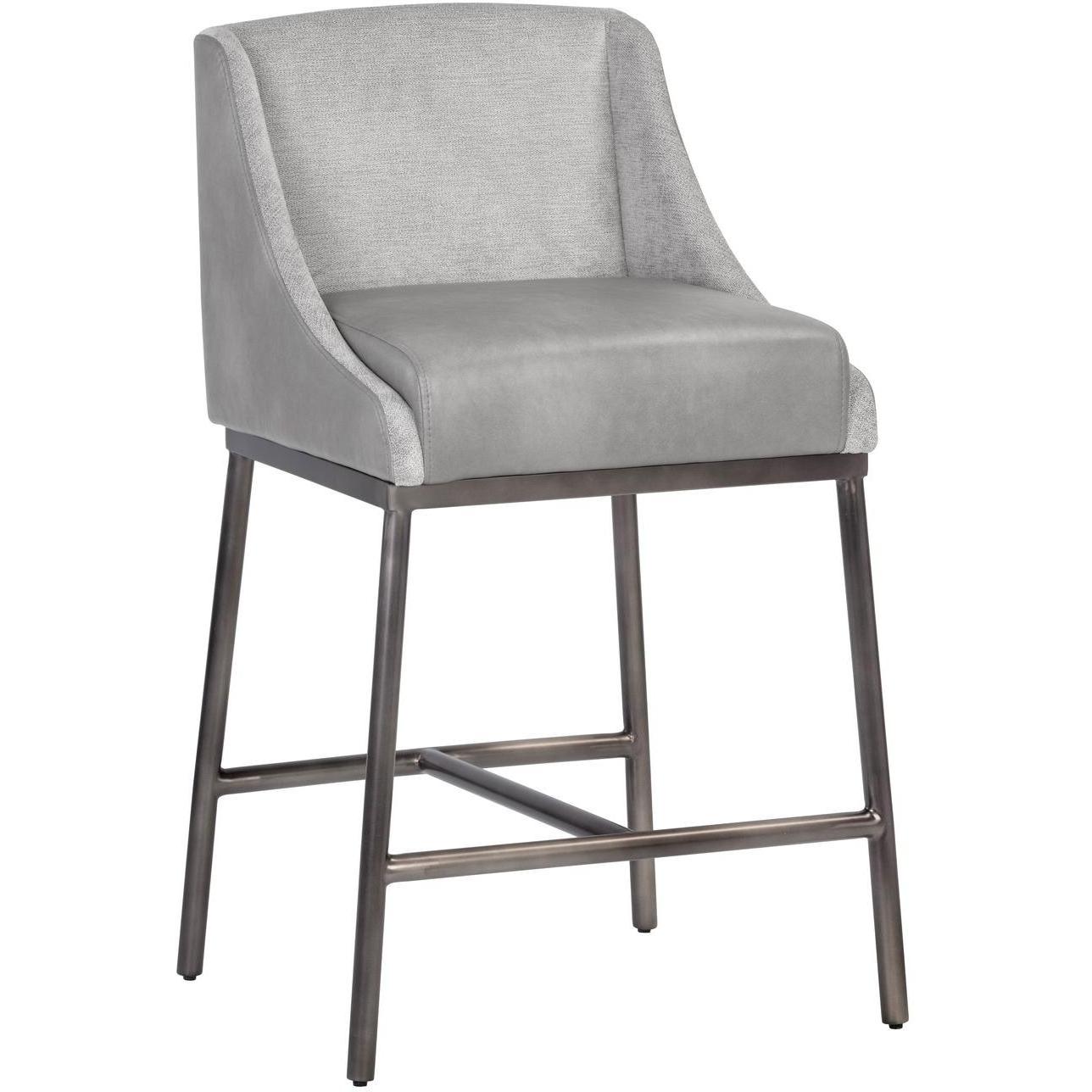 This counter stool from our Ikon collection features a classic silhouette with contemporary flair. Features contrasting seat, seatback and exterior upholstery in bravo metal faux leather and polo club stone fabric. Brushed metal finish legs complete the look. Suitable for various dining, kitchen and bar spaces of all sizes. Handle With Care: This design has been crafted with faux leather. Faux leather is manufactured to reflect the natural characteristics of leather; as such, colour variations, markings, wrinkles, grooves, and light scratches are appreciated characteristics. No two pieces will be alike.