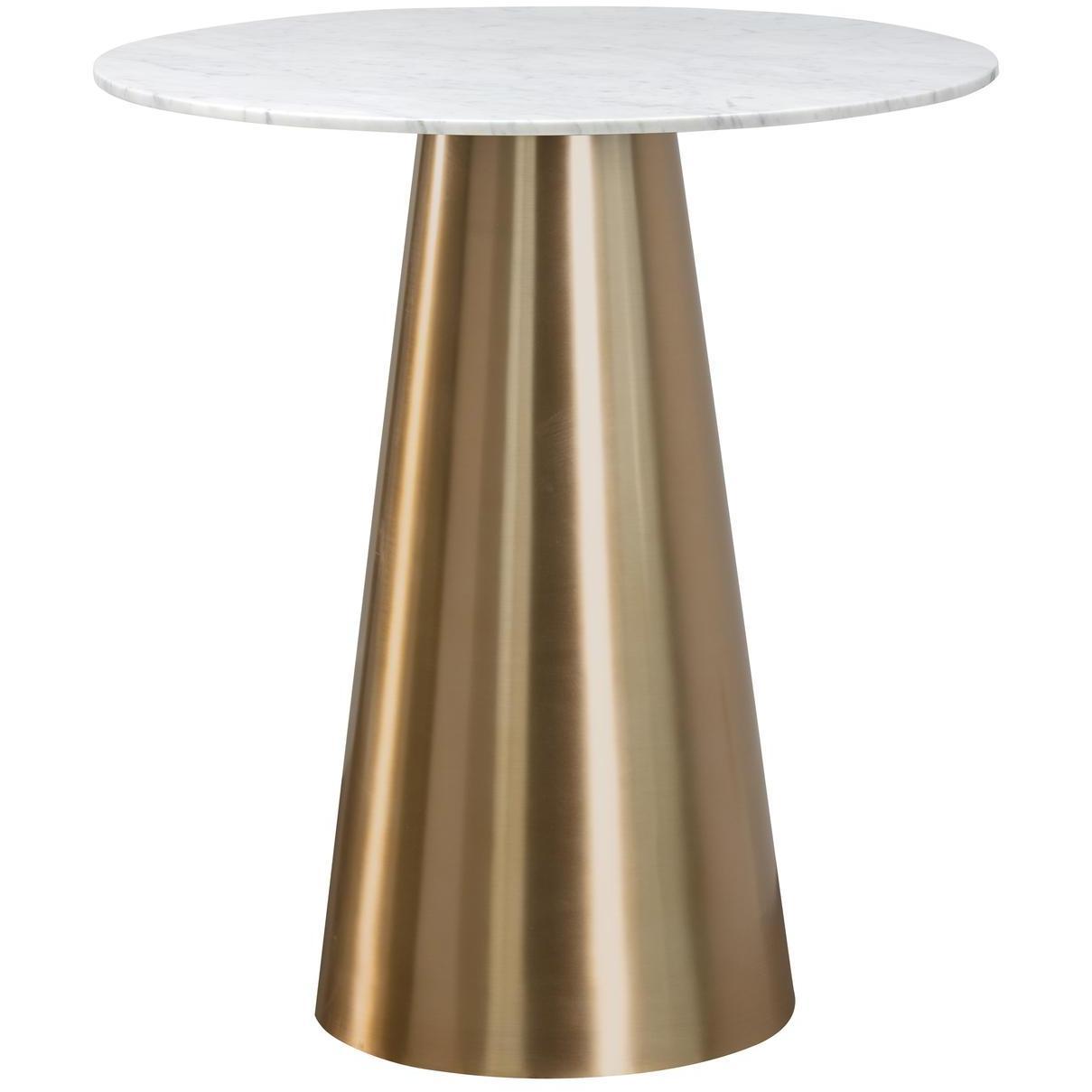 An absolutely stunning tapered bar table. Crafted with a brushed gold finish and a stunning white marble top to elevate any contemporary dining or lounge space. Suitable for residential and commercial environments. As marble is a natural material, unique veining, pitting, fissures, micro-cracks and colour variations are all characteristics that add to the uniqueness and beauty of each piece.