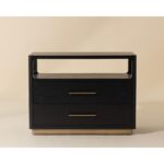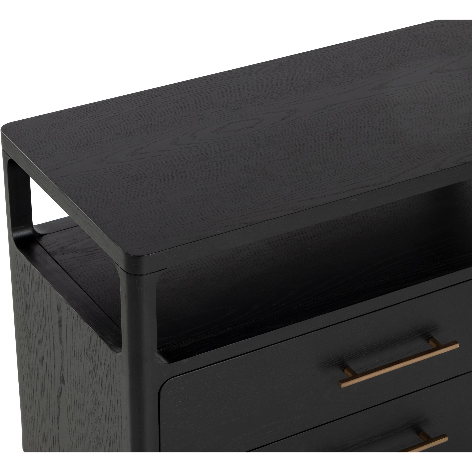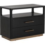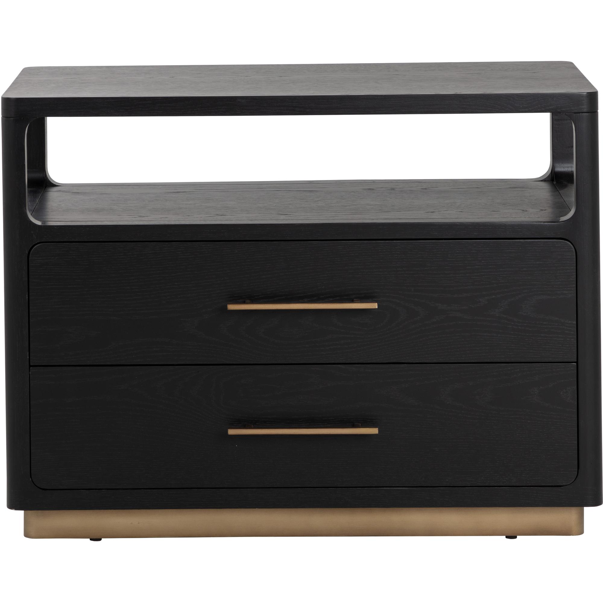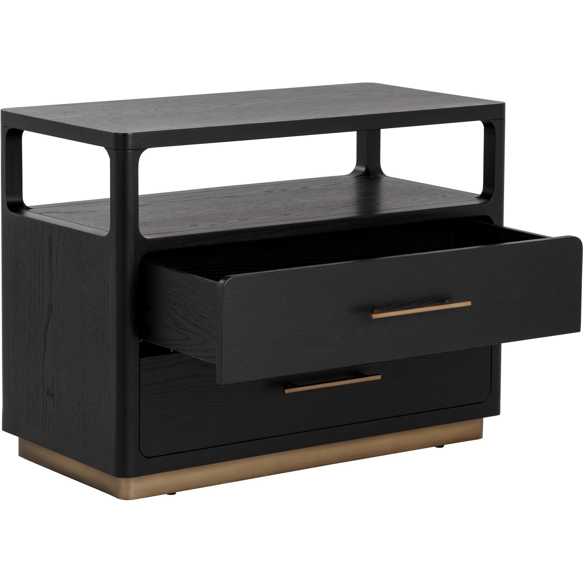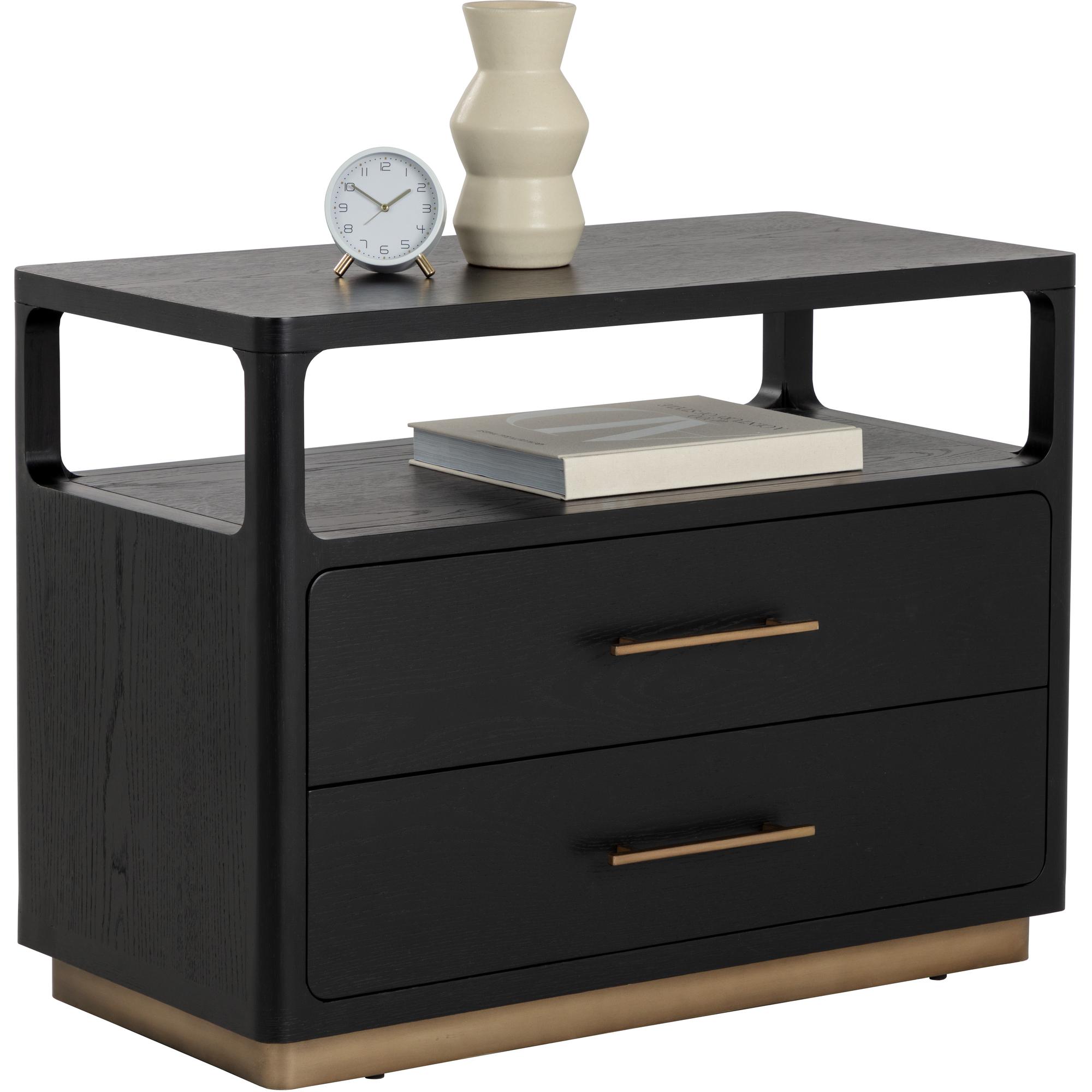 Clean lines lend the Danette Nightstand its minimalist silhouette. Crafted with black solid oak wood and oak veneer that draws attention to the warm brass hardware. An open top shelf provides extra space for added decor.