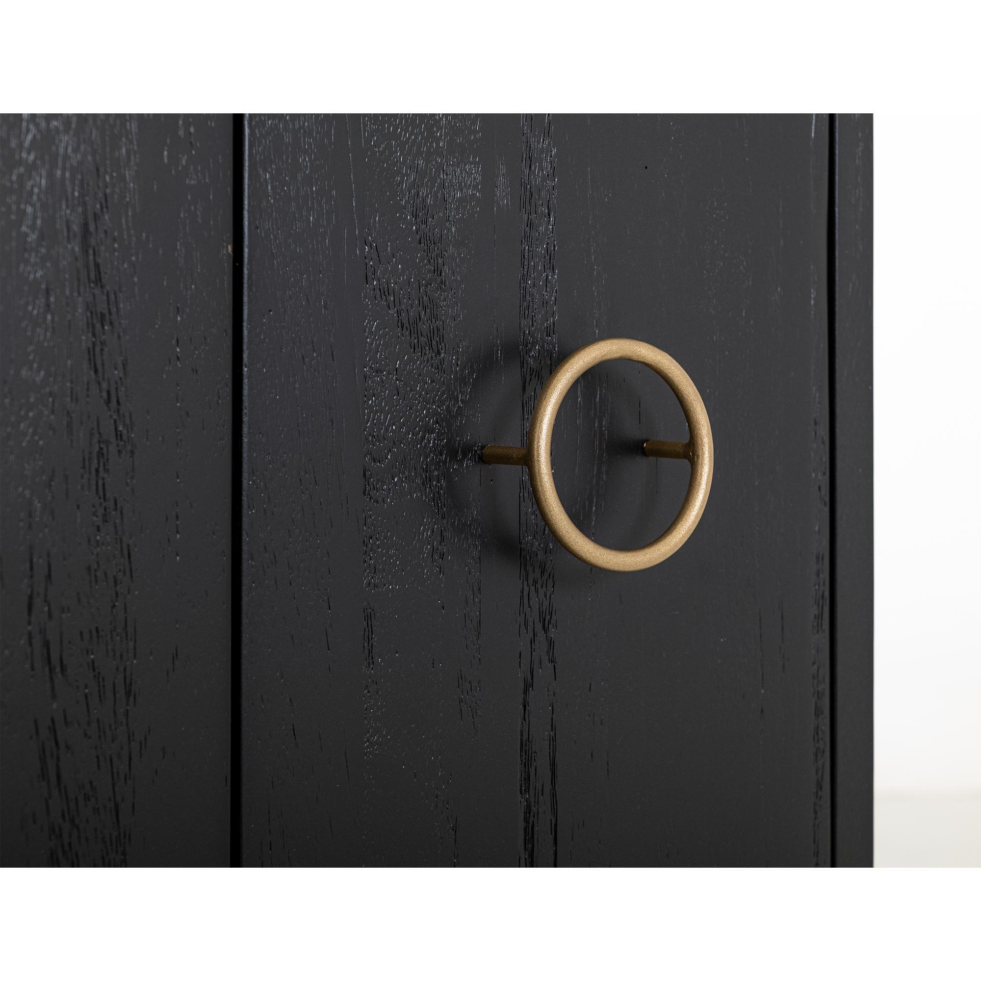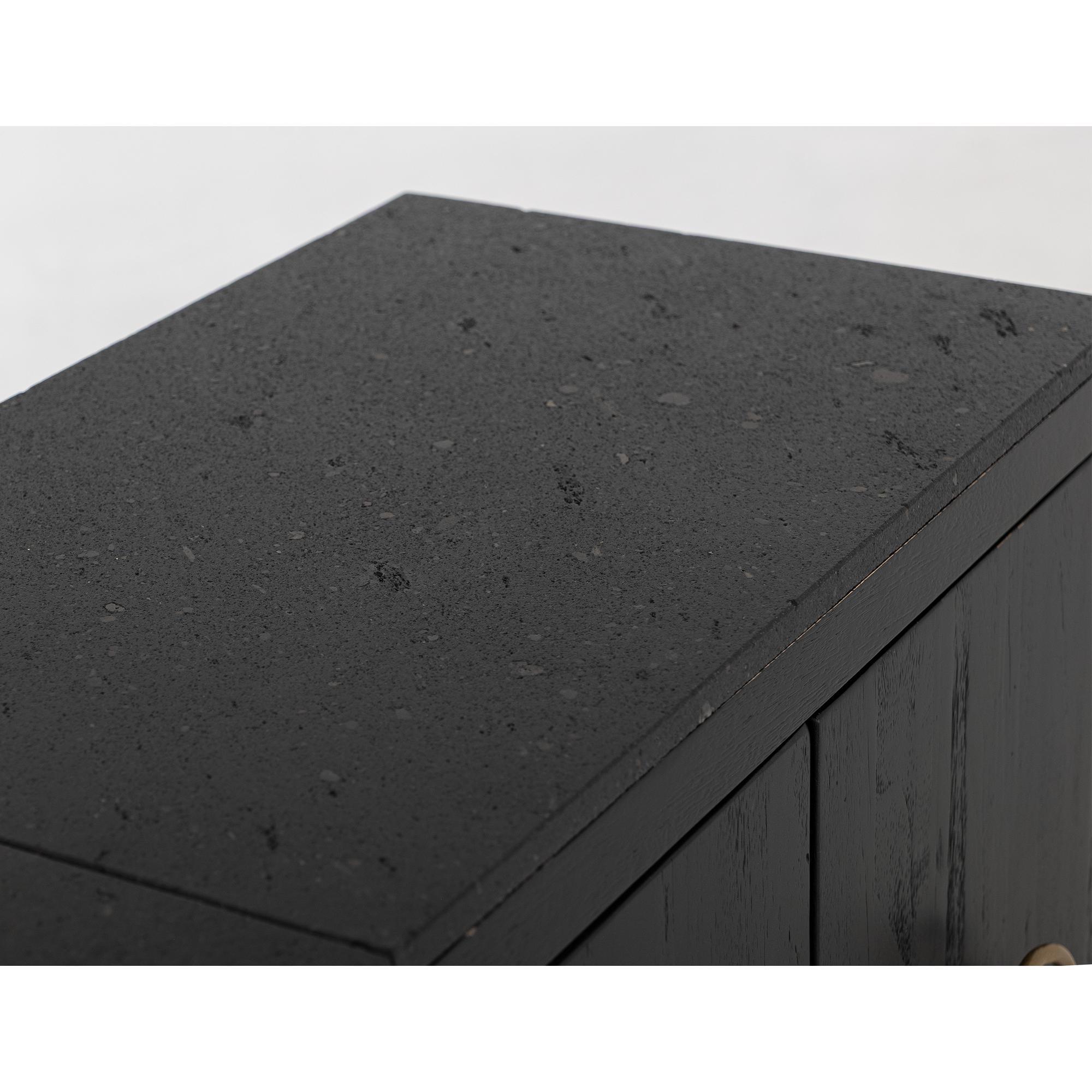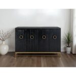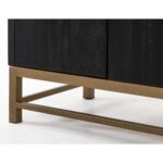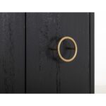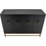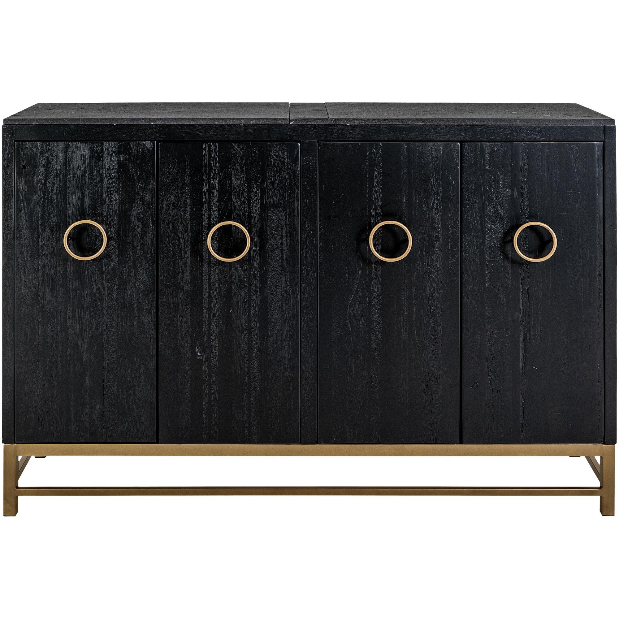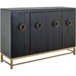 The Ebano Console, features a breathtaking top made from natural stone, ethically sourced from a quarry. This stunning piece brings an air of elegant sophistication to any room. Its metal base provides reliable support and creates a striking contrast with the stone’s organic texture. The custom metal pulls adorn the doors in a luxurious golden finish, enhancing the captivating black-and-gold contrast. The sleek black finish of the Ebano Console reflects a modern deco design and makes it a truly eye-catching addition to your decor. Using multiple species of wood in its construction showcases different grains, adding uniqueness. Transform your living area with this inspiring black furniture console that seamlessly combines functionality with aesthetic appeal.