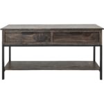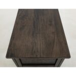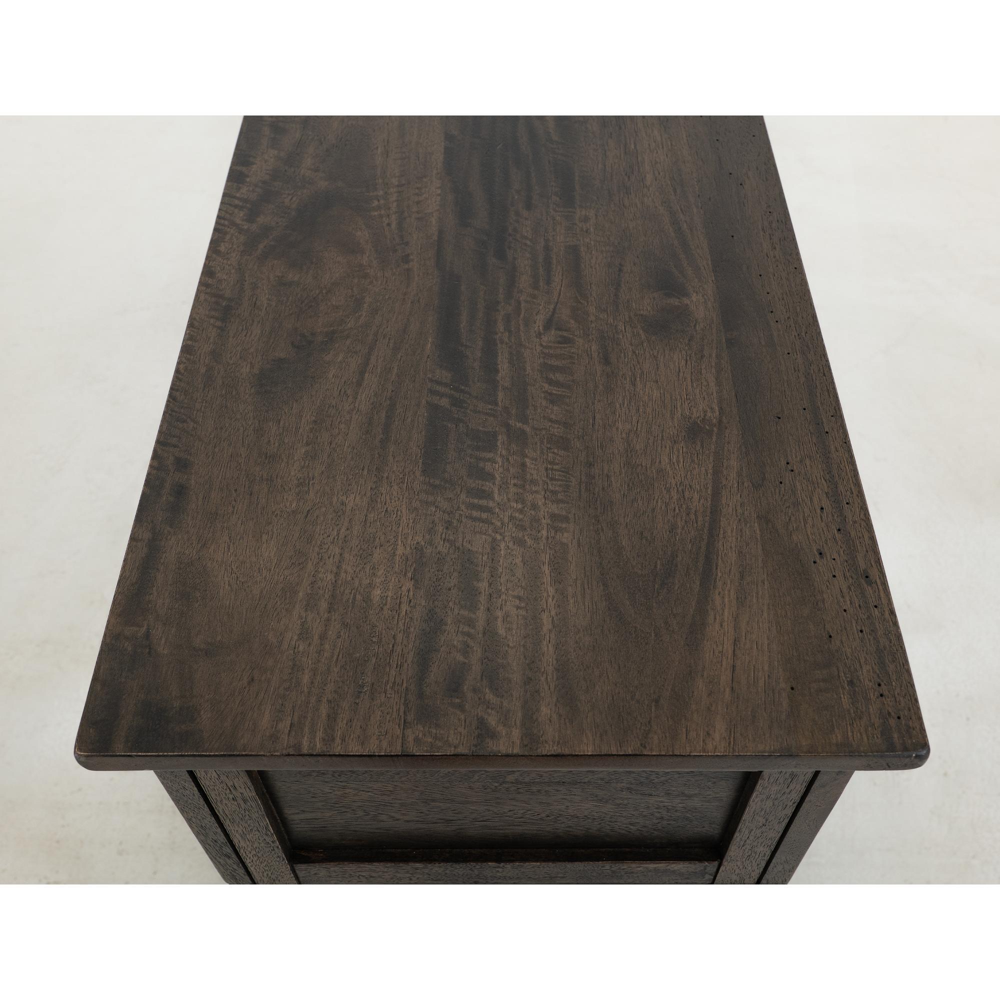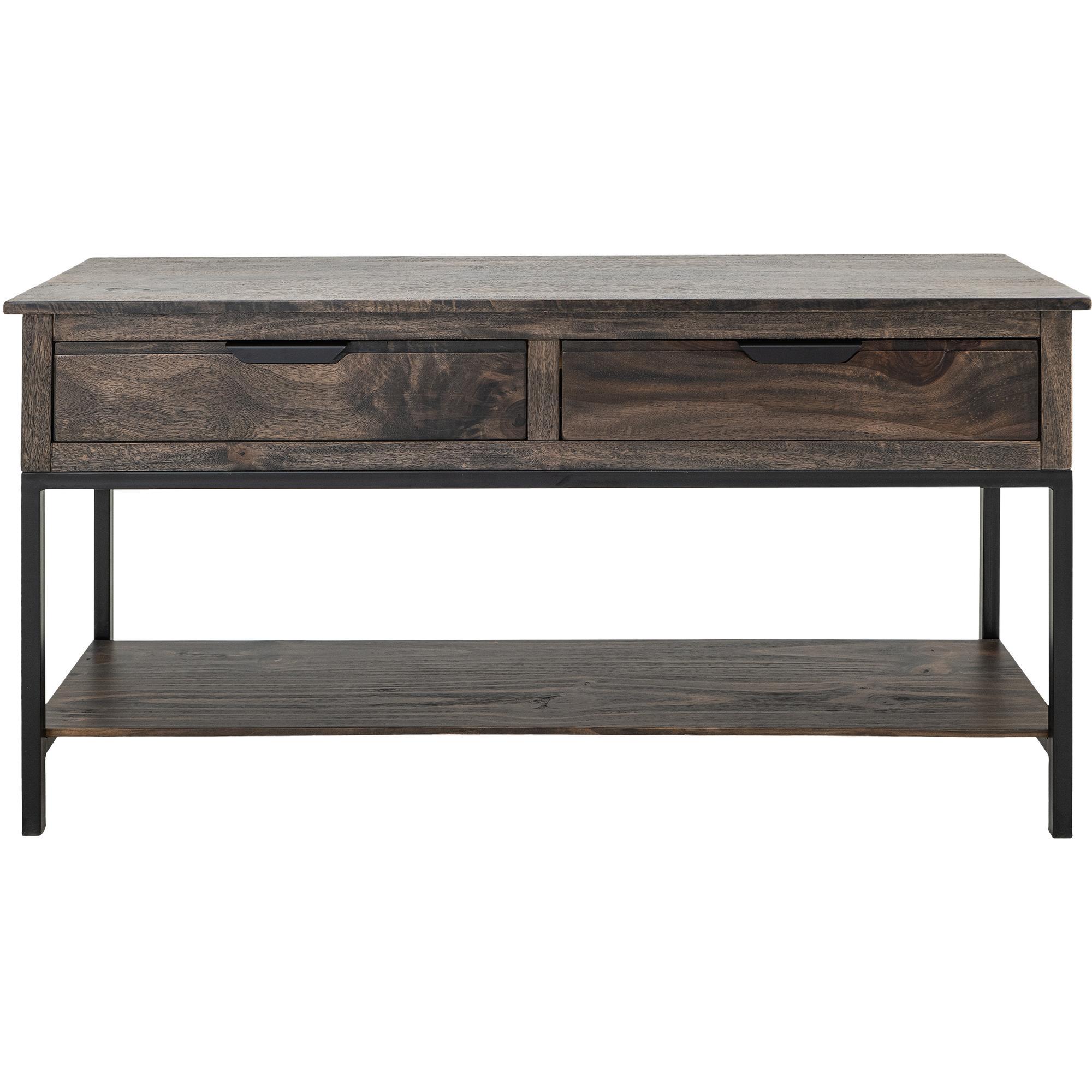 Inspired by transitional design, the Dark Mita occasional tables elegantly combine the warmth of wood with the sleek industrial style of metal elements. Each piece in this collection is expertly crafted from sustainable mango and melina wood, hand-distressed to create a captivating finish that showcases its natural grain patterns. In addition to its attractive design, the Dark Mita collection offers practical features. The sofa table includes a sturdy metal base for support, a spacious tabletop for everyday use, two drawers with sleek black handles for storage, and a lower shelf ideal for displaying decorative items or organizing books and magazines. This combination of style and utility ensures the Dark Mita collection is a beautiful and functional addition to any living space.