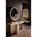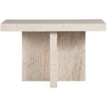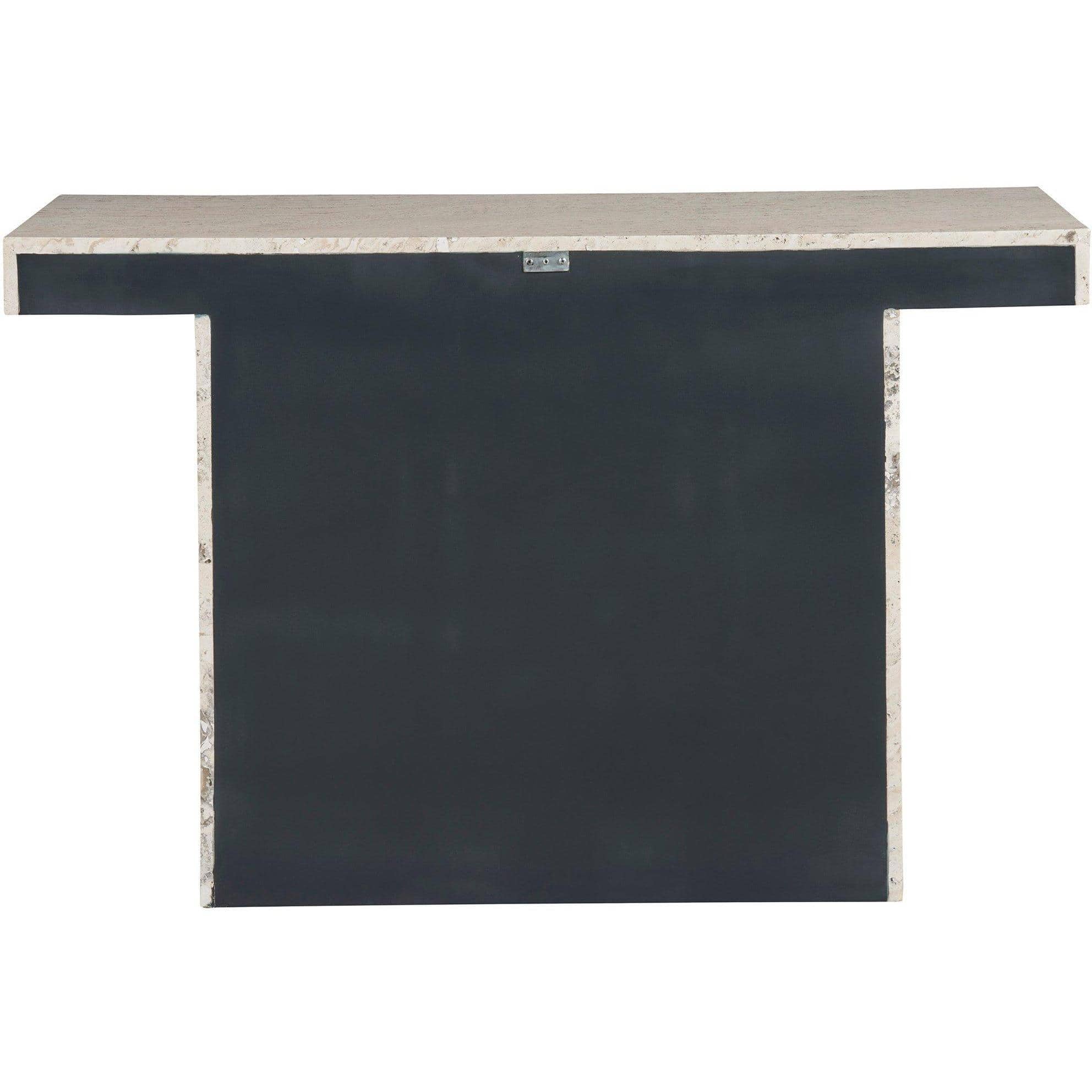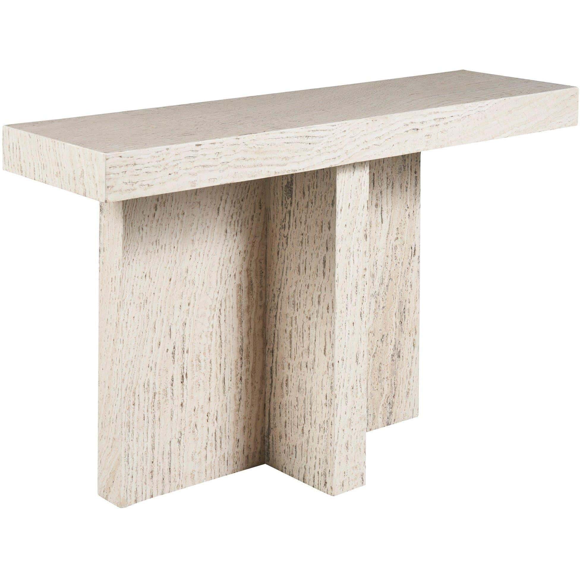 The Daxton Console Table stands out with its T-shaped silhouette, carved entirely from White Travertine. Its design is characterized by angular lines and sharp, cool edges, presenting a piece that exudes a minimalist yet bold aesthetic, perfectly suited for contemporary spaces that embrace clean, architectural forms.