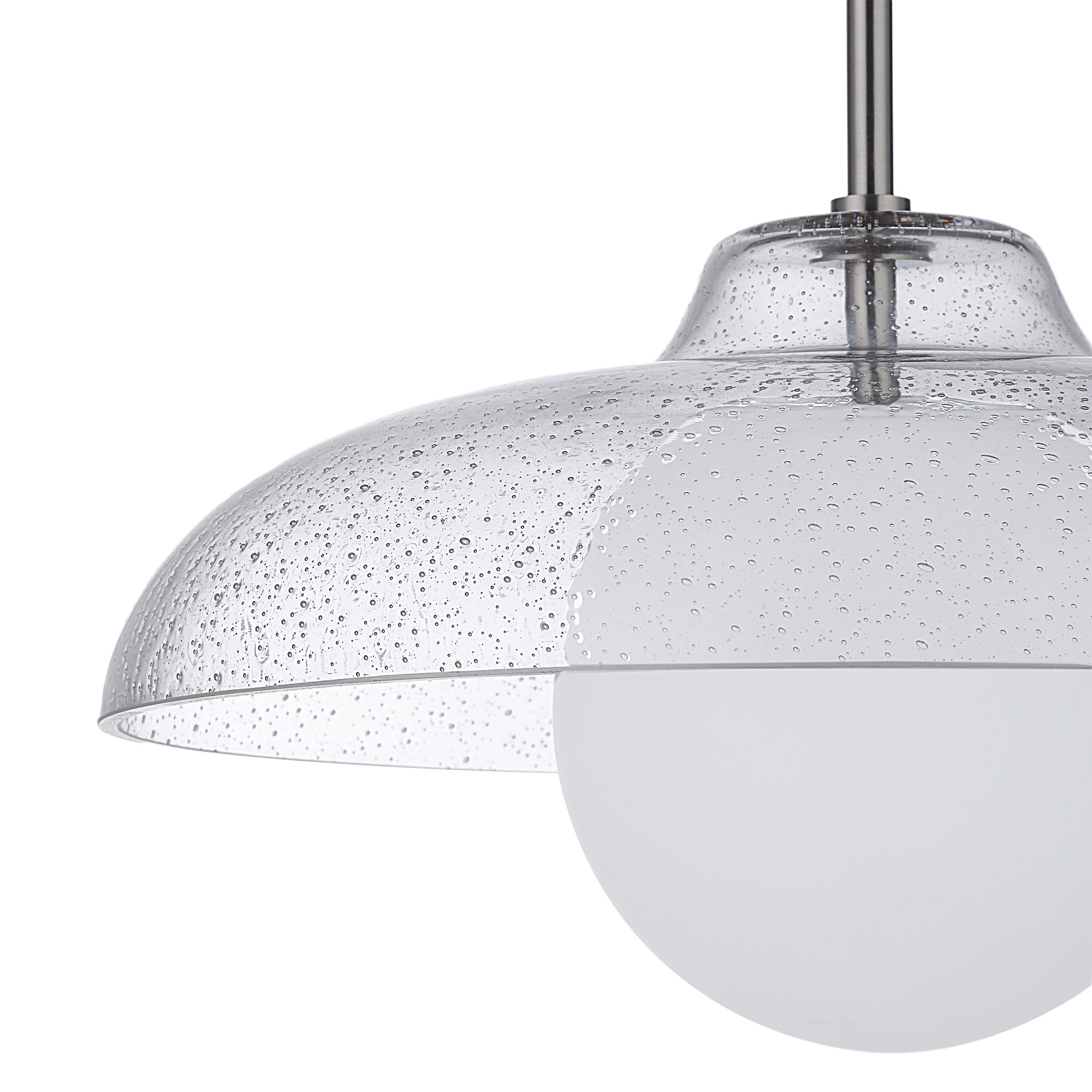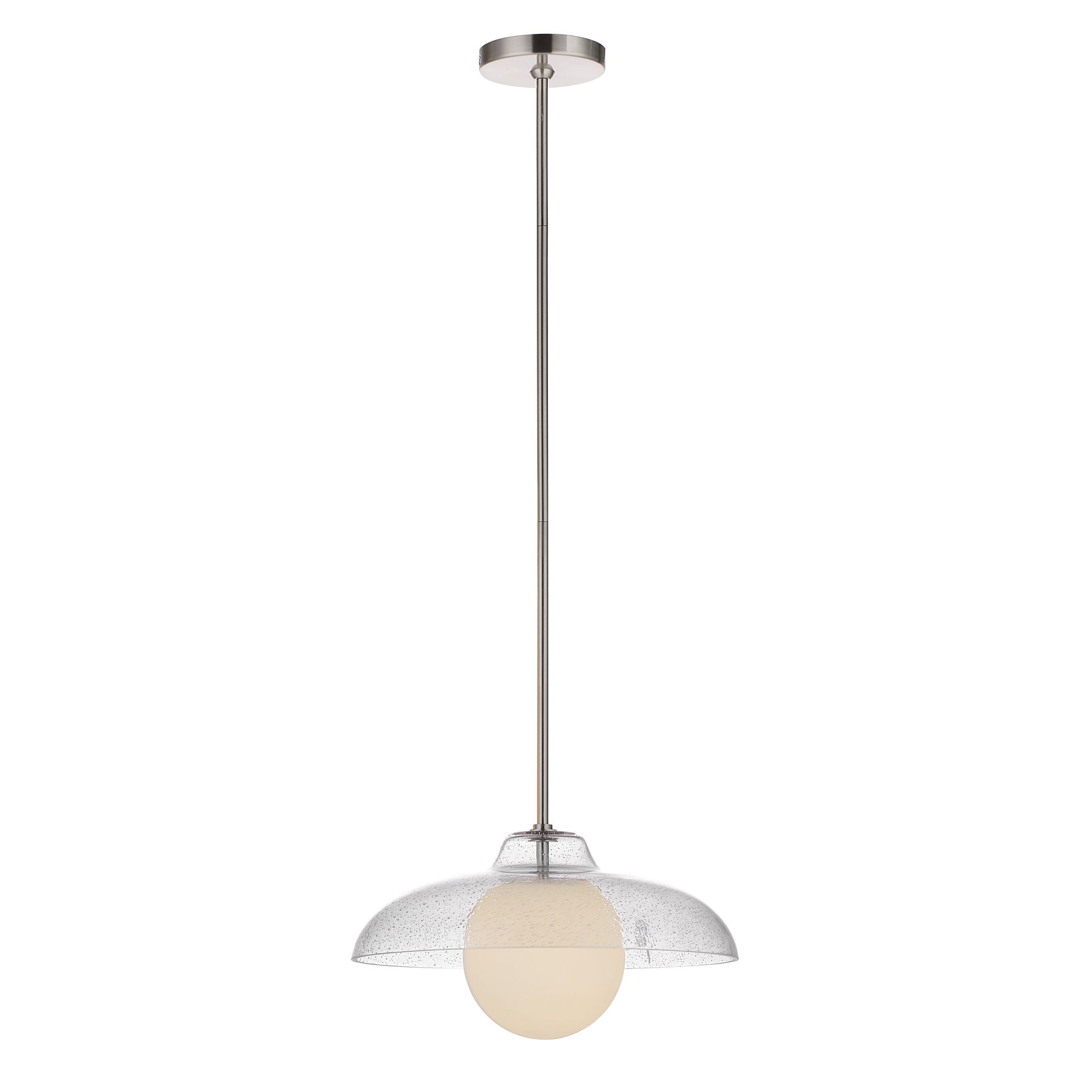 Once you lay eyes on the Dayana ceiling light fixture, you’ll know you’ve found the perfect pendant worthy your design project. It features a unique combination of two types of glass and plated satin nickel hardware that work together to deliver a beautifully balanced, timeless look in any interior. Its seeded glass shade and etched glass globe both transform light into a softly diffused ambient glow for lighting that’s just right and never too bright. Perfect for hanging solo over a kitchen table or in an entryway, or in multiples over an island, this ceiling pendant is sure to leave a lasting impression anywhere it hangs.