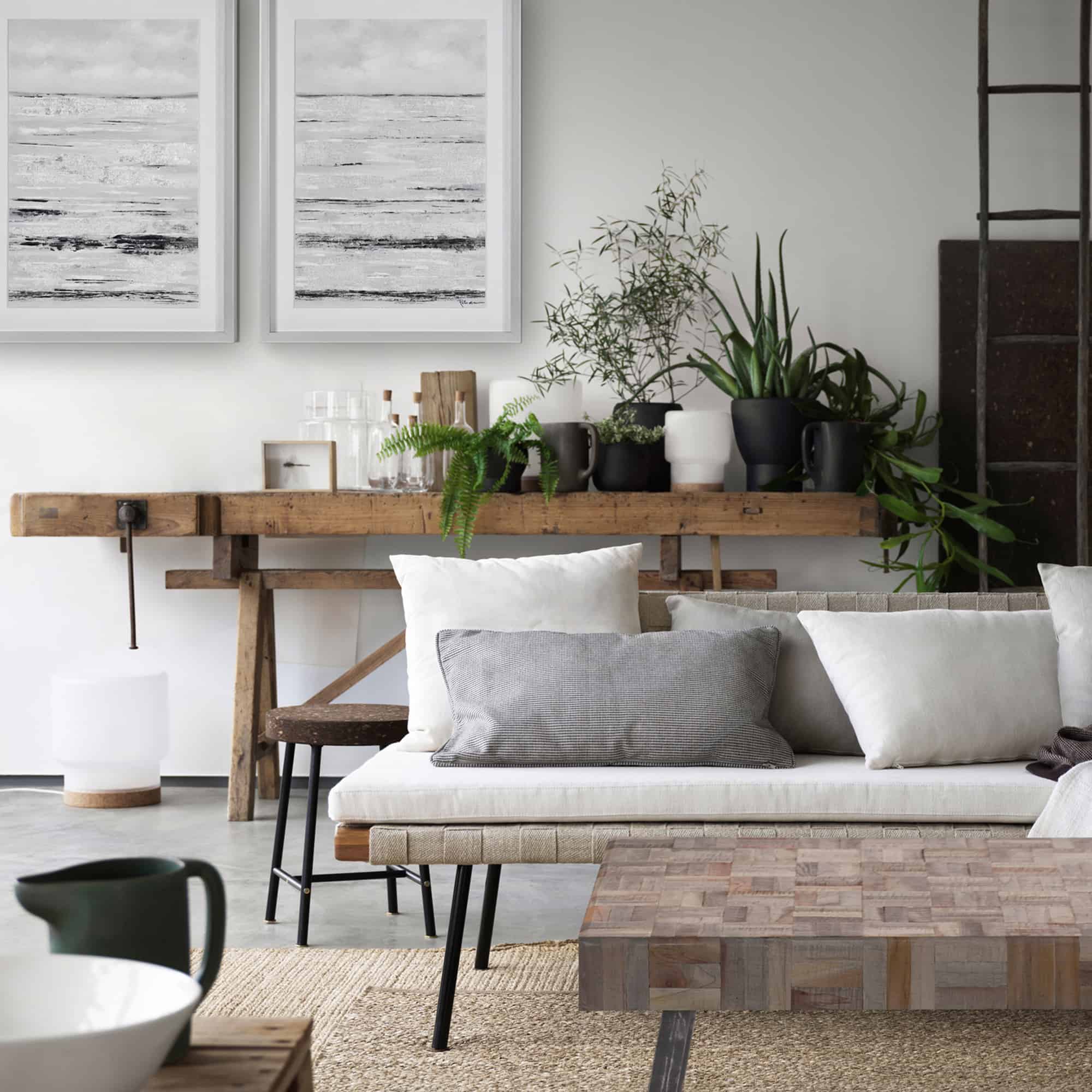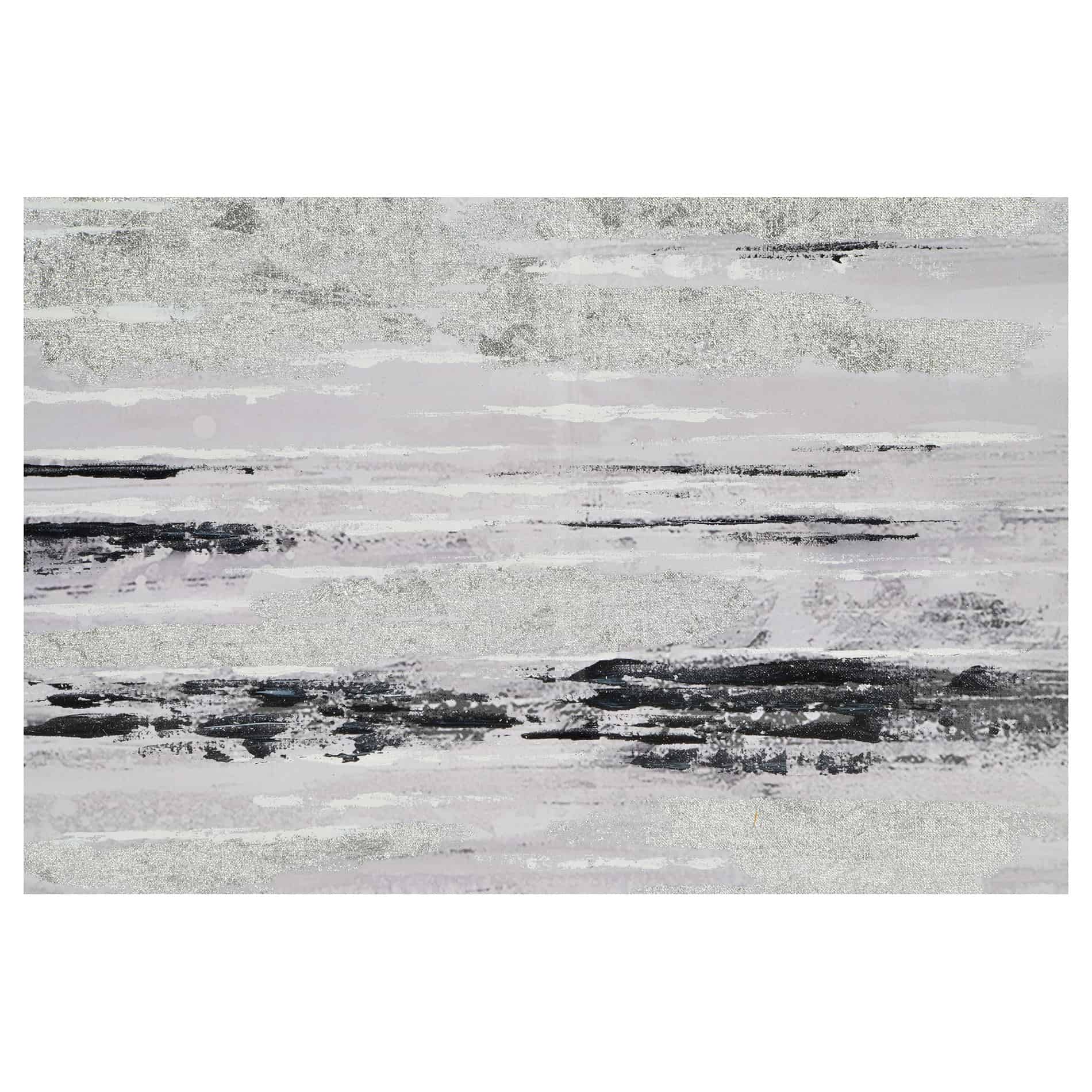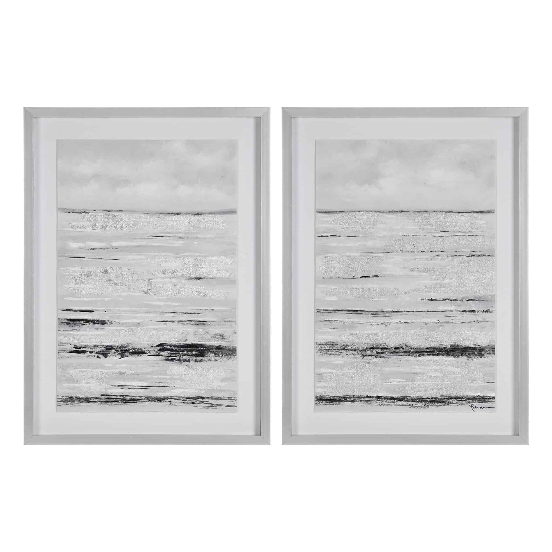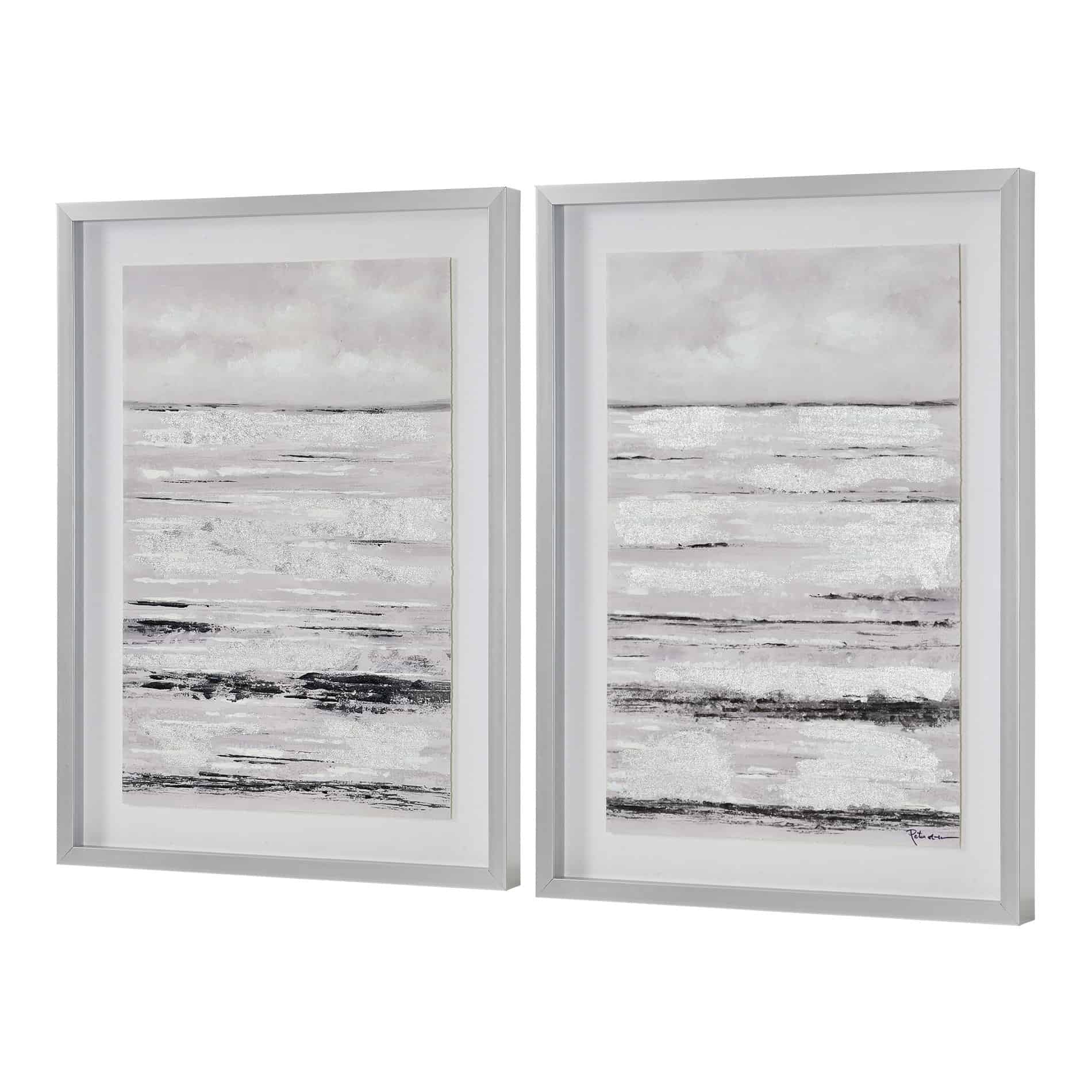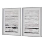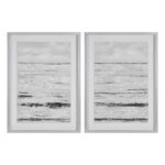 Textural touches throughout this set of two abstract paintings set the standard for Scandinavian style. A series of black and white horizontal lines adds a tactile quality to each wall decoration, centered beneath the glass of a silver leaf shadowbox frame. The grayscale color palette lends interior rooms an air of tranquility, with an atmospheric style that invites you to relax and unwind.