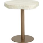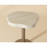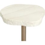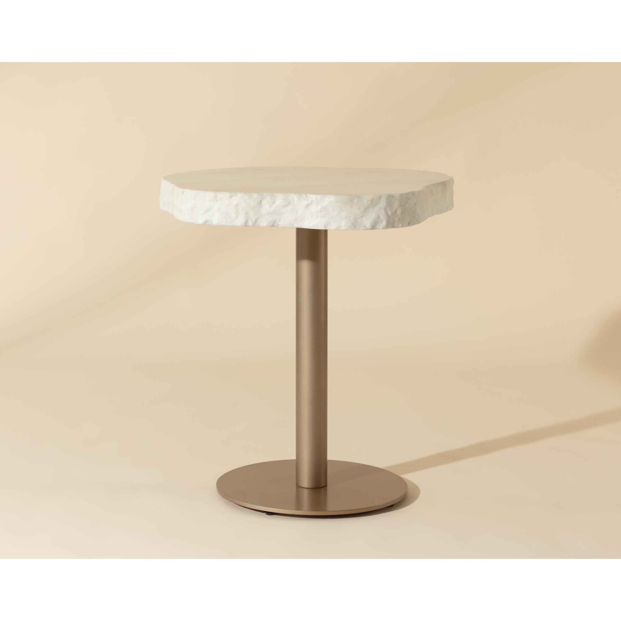 Reflecting the beauty of organic design, the Delmont Bistro Table is elegant and captivating. A curved table top with a faux travertine look rests upon a powder-coated antique brass steel base, bringing a modern contemporary look and feel that will elevate any outdoor area.