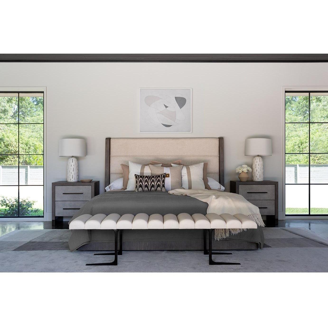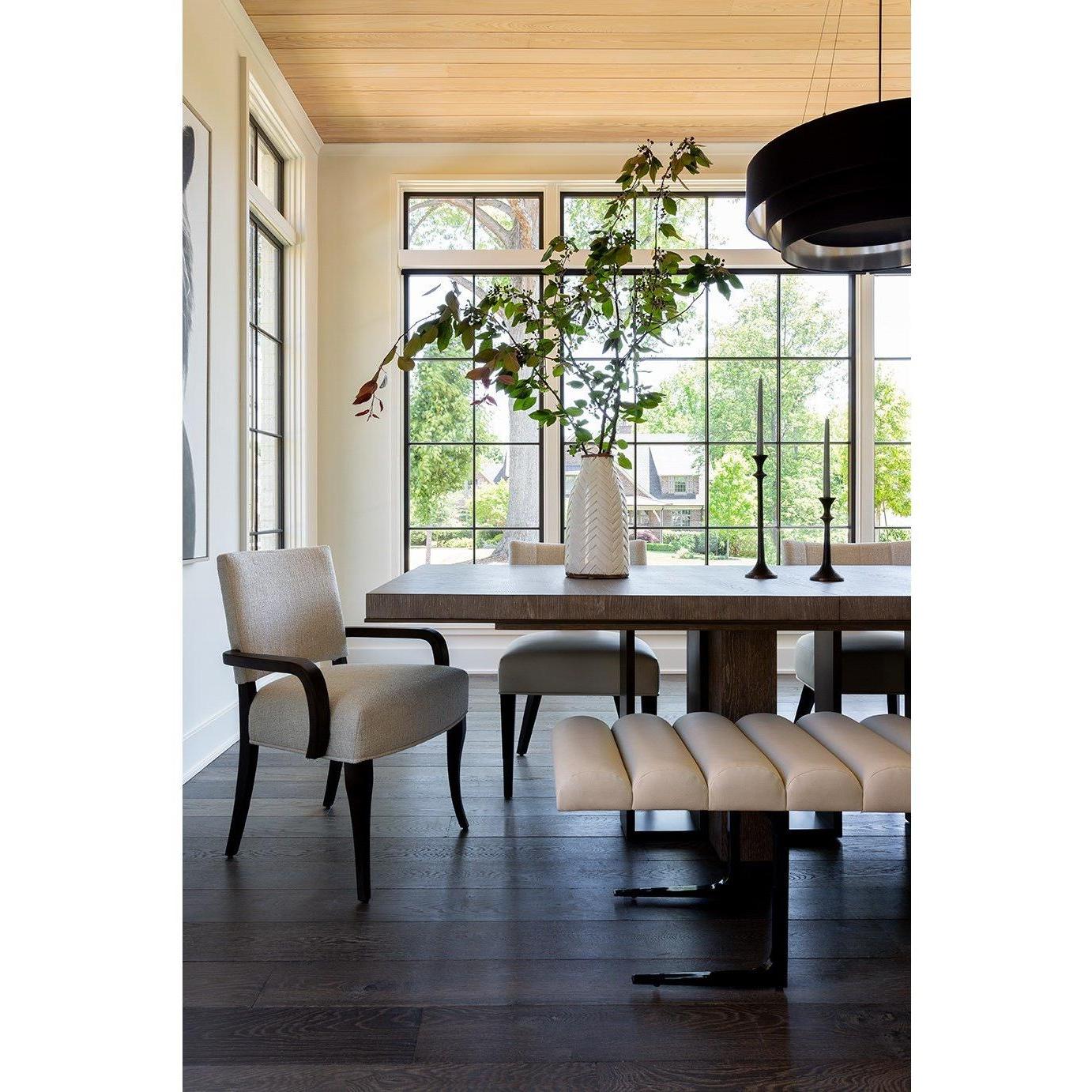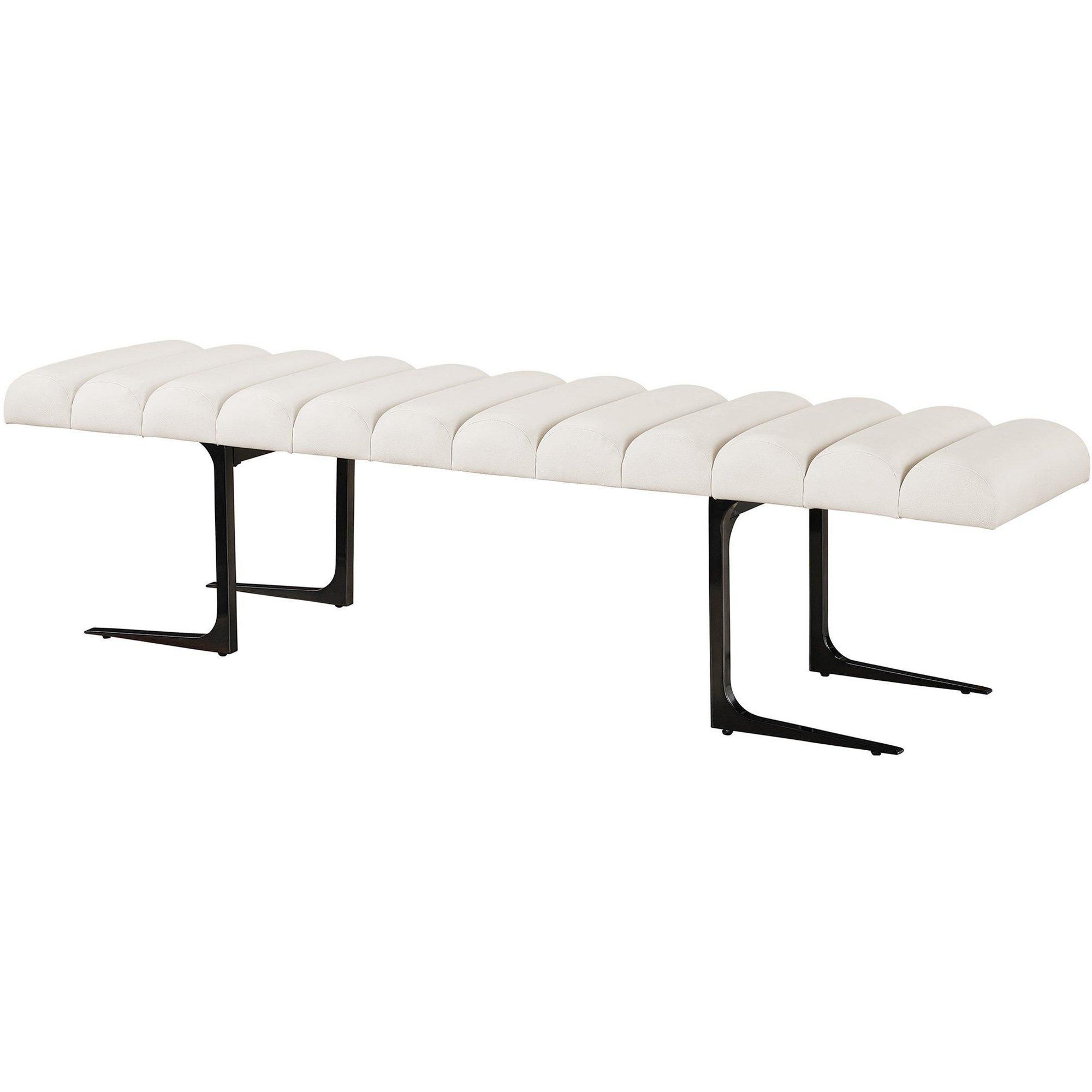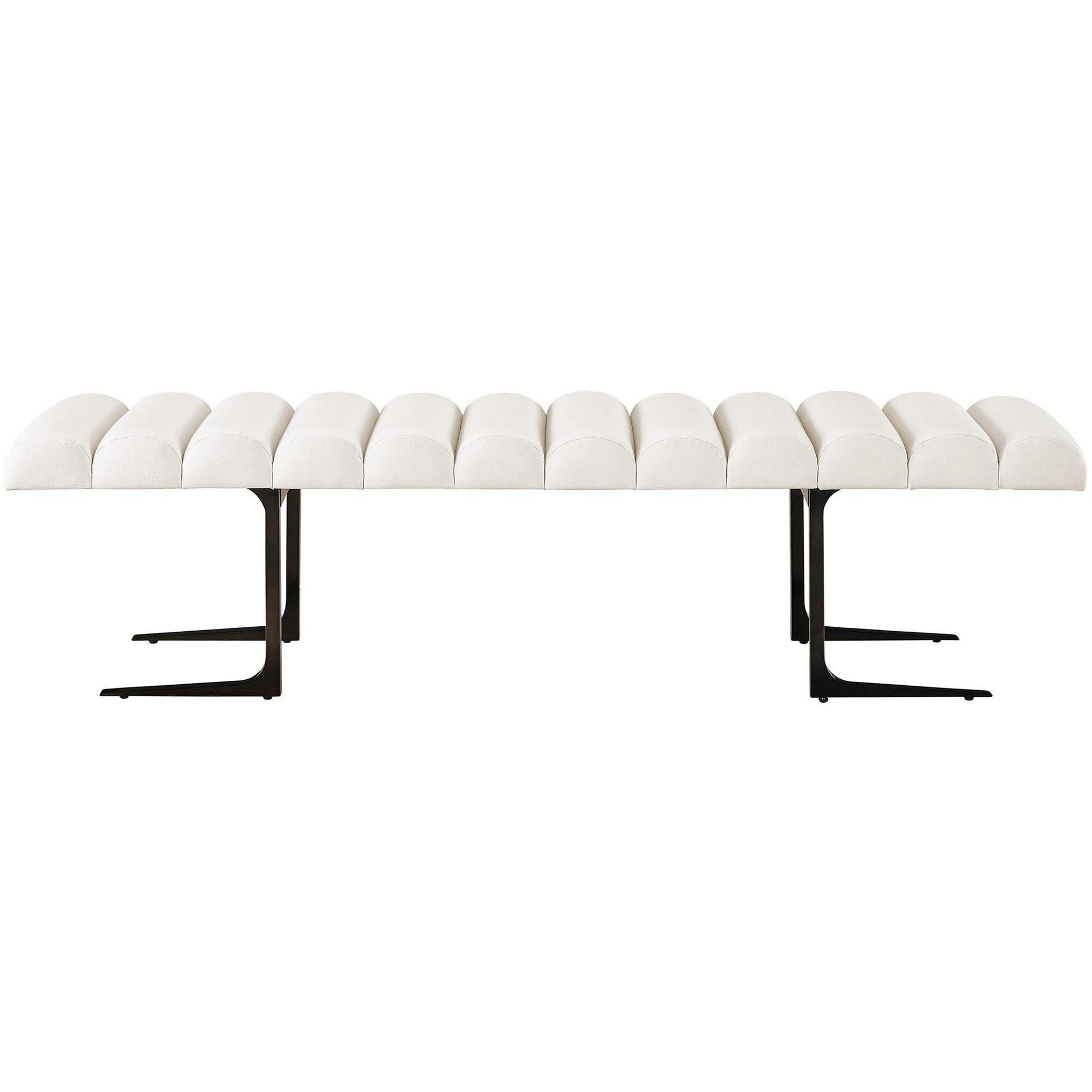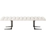 The plush, scalloped-topped bench is upholstered with Inside Out Performance Fabric, accented with a chic black nickel base combines modern style with long-lasting performance attributes.