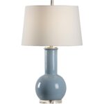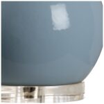 Provide accent lighting with this modern bottle style table lamp. A soothing sky blue glazed ceramic with silver leaf neck and finial is mounted on a clear acrylic base . The off white linen tapered drum shade completes the look and adds a touch of elegance to the transitional design.