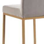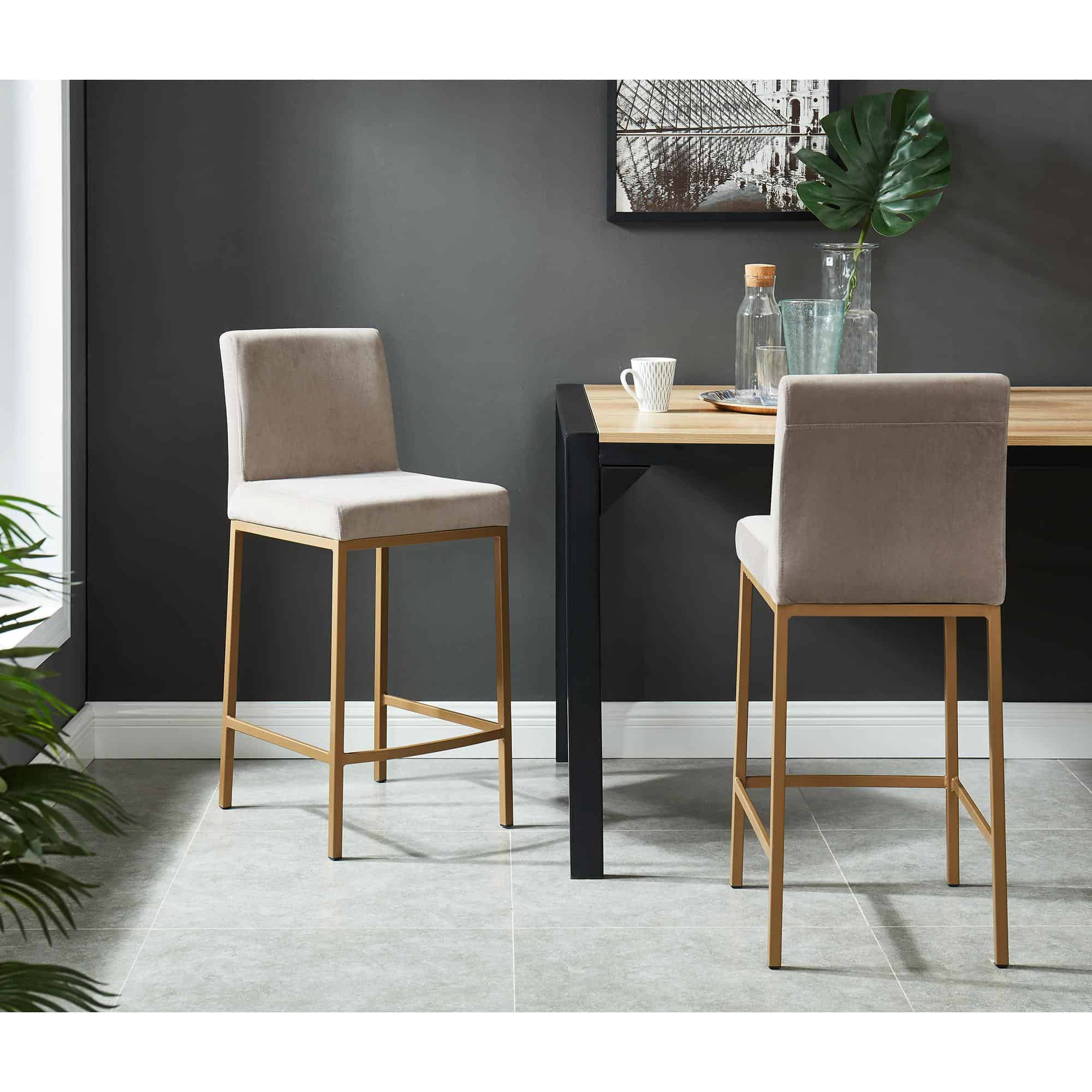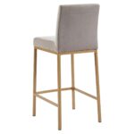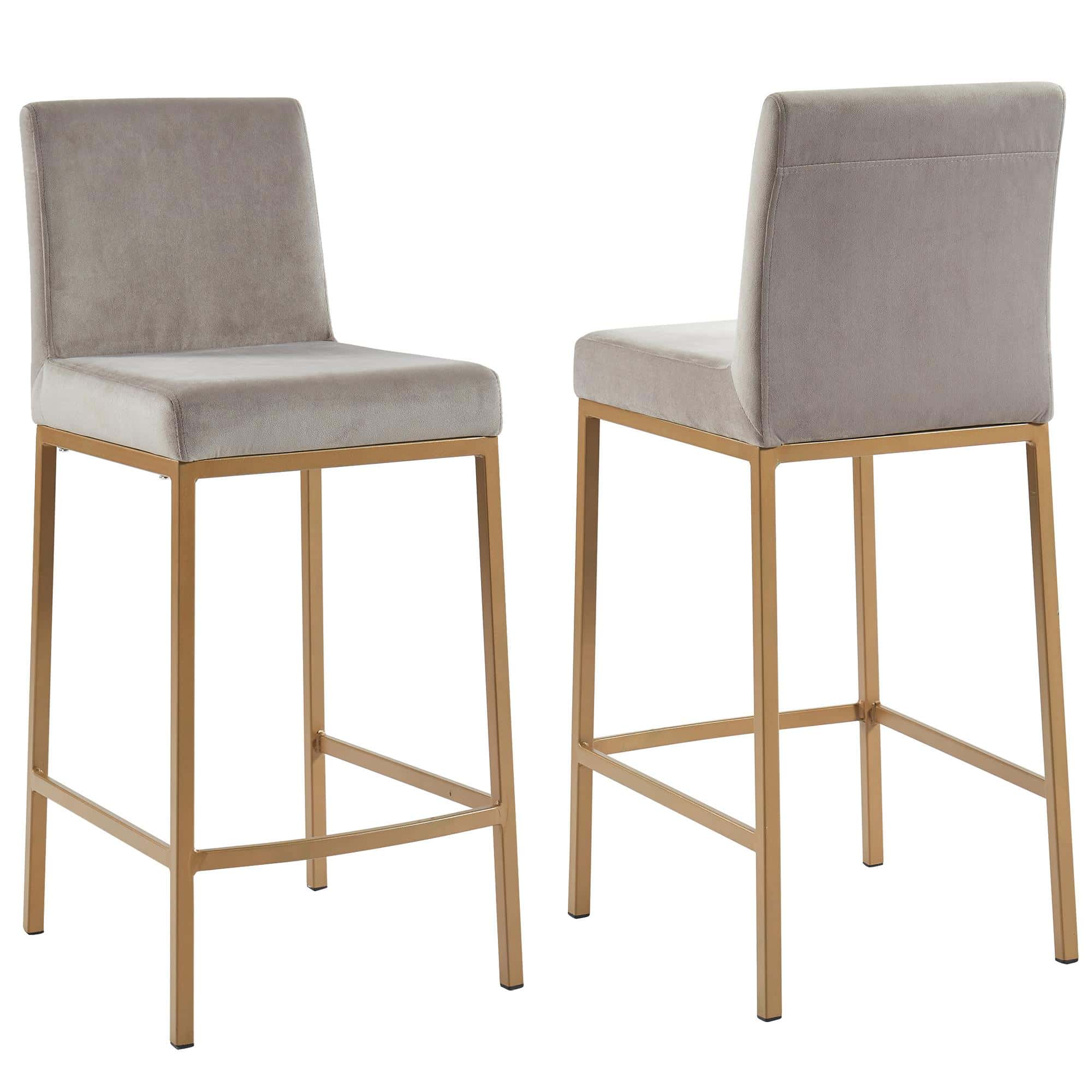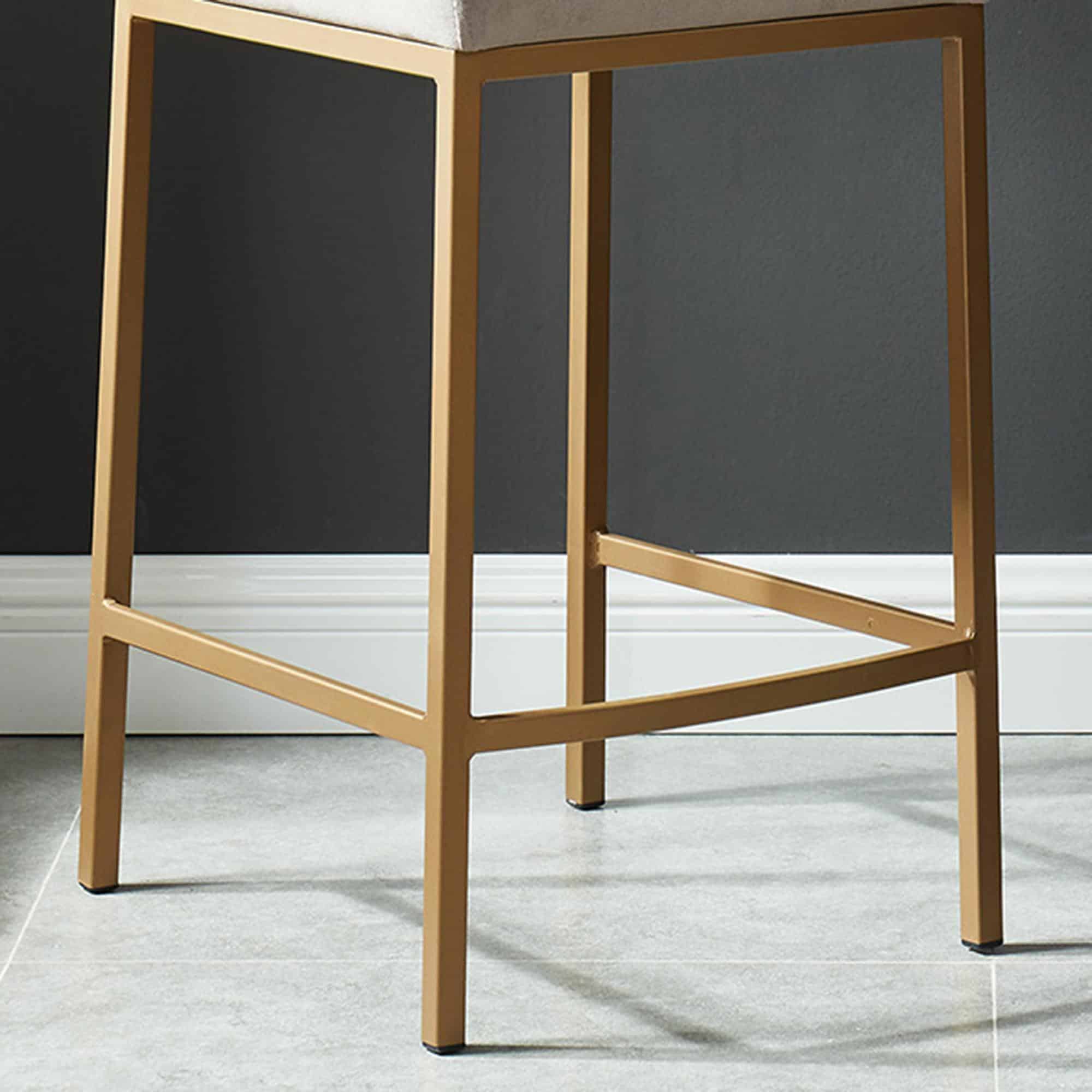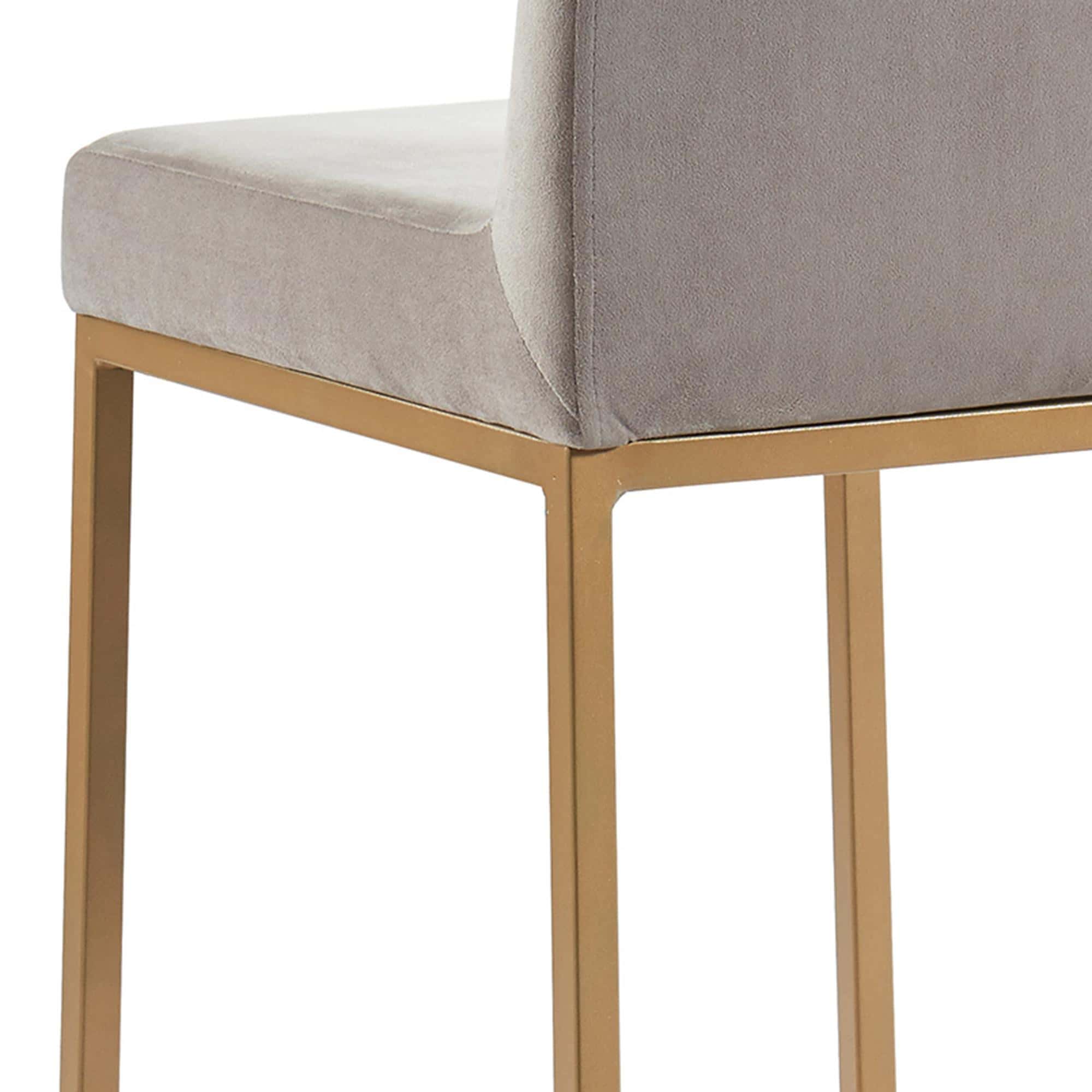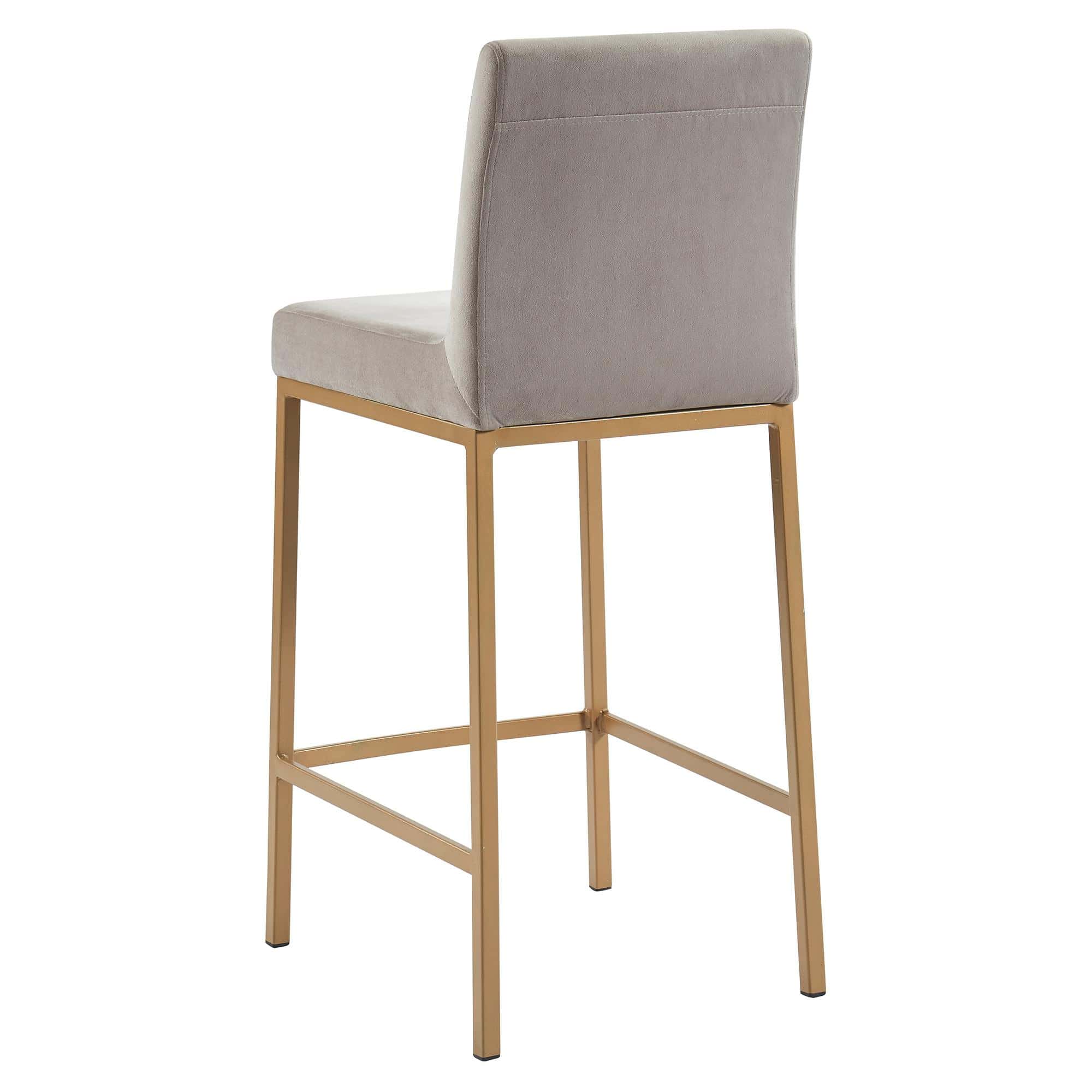 Contemporary counter height stool with a rich-looking combination of velvet upholstered seat and matte aged gold stool frame. The low back provides ample back support while giving the stool a sleek, modern look. Great for a casual breakfast bar or for the fancy basement bar where you can spend hours conversing with guests.