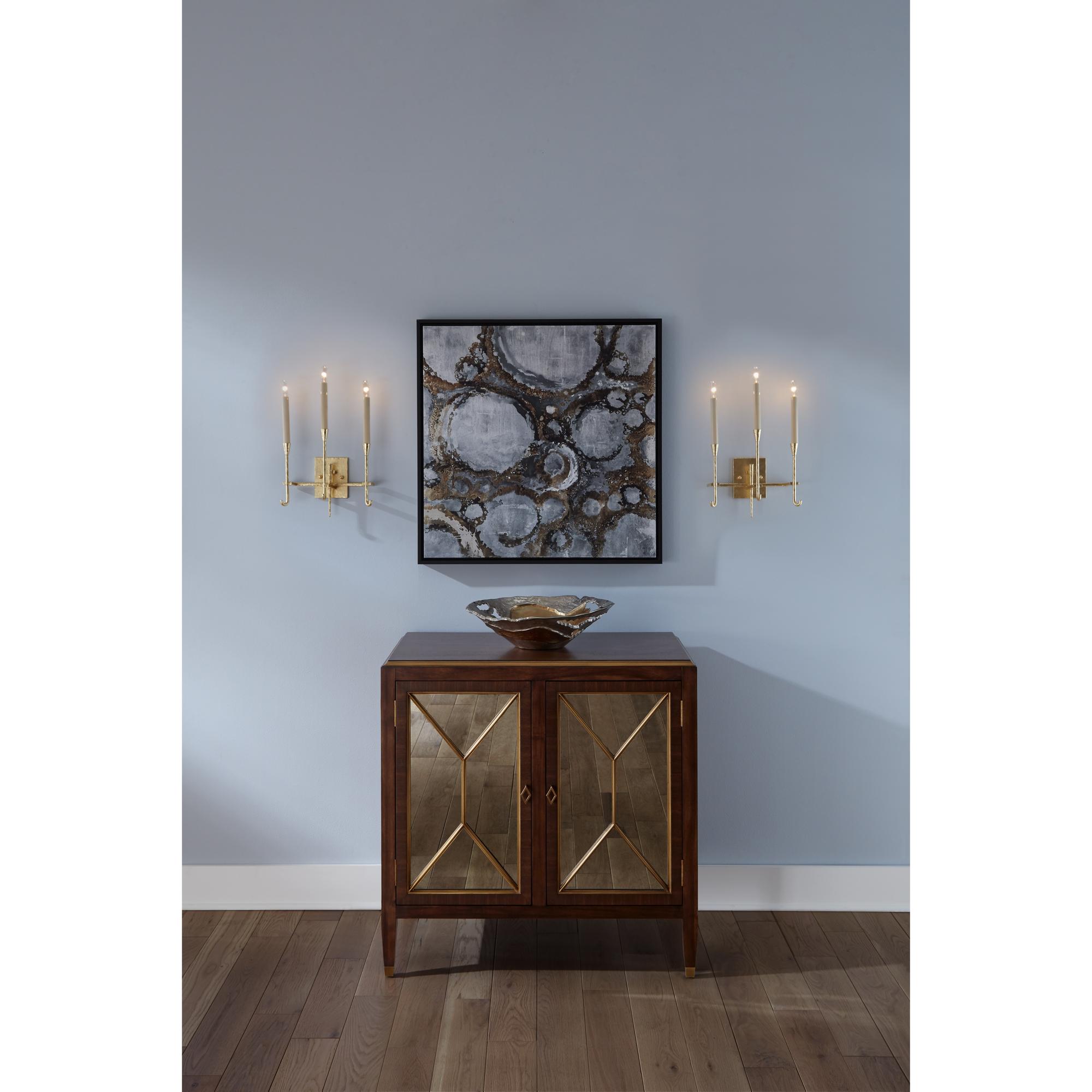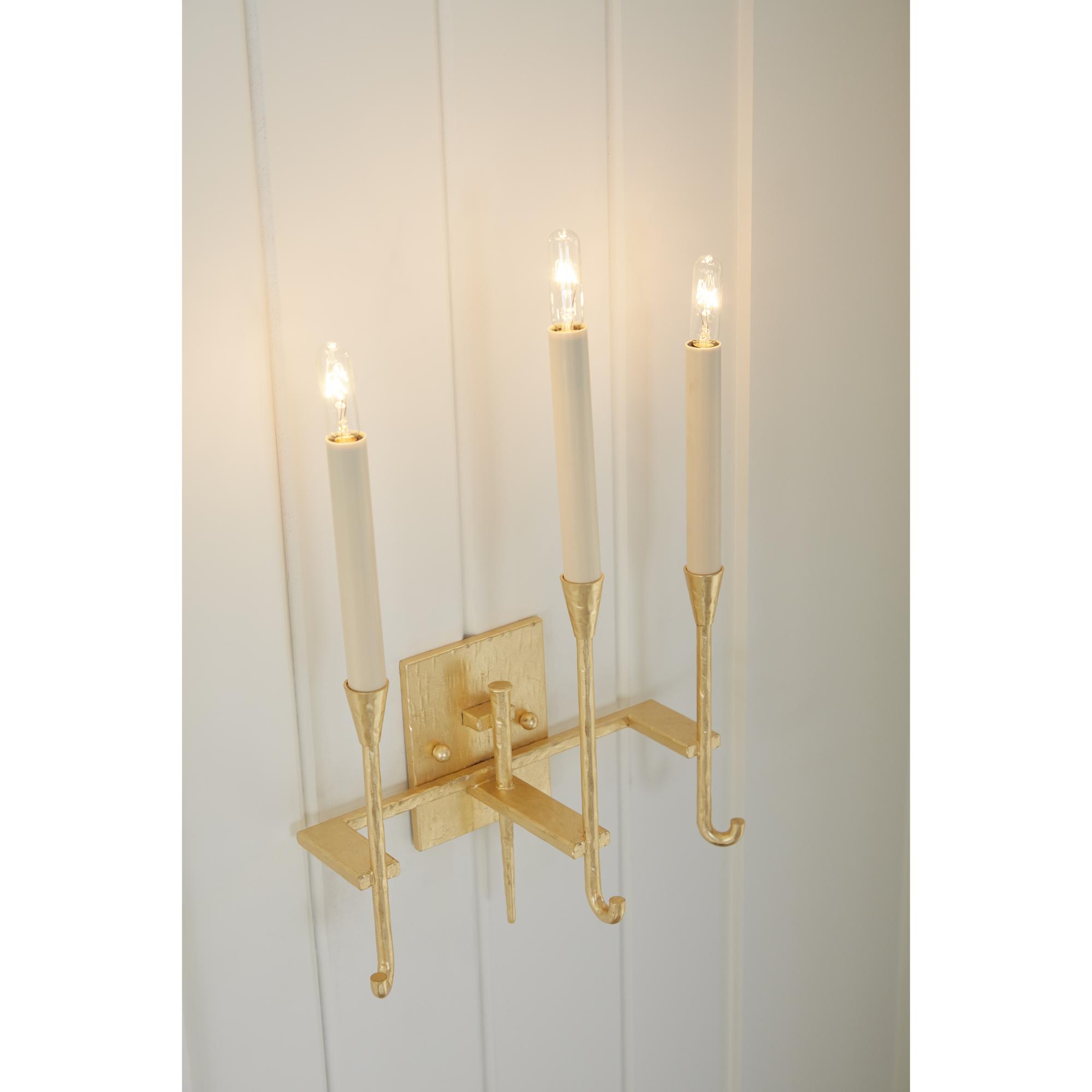 Hammered gold leaf over steel sconce with three electrified candles.