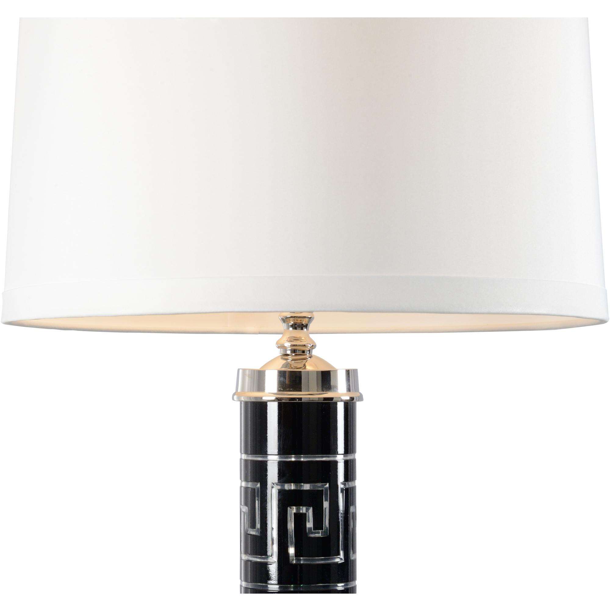 Inspired by ancient architecture, diocletian lamp features the classic greek key design etched in a column of black glass. Supported on a polished nickel mount with a three way socket, this 24″ accent lamp is ideal for an entryway, bedroom or living area. An off white silk drum shade brings a hint of elegance as it diffuses luminous light throughout your space.