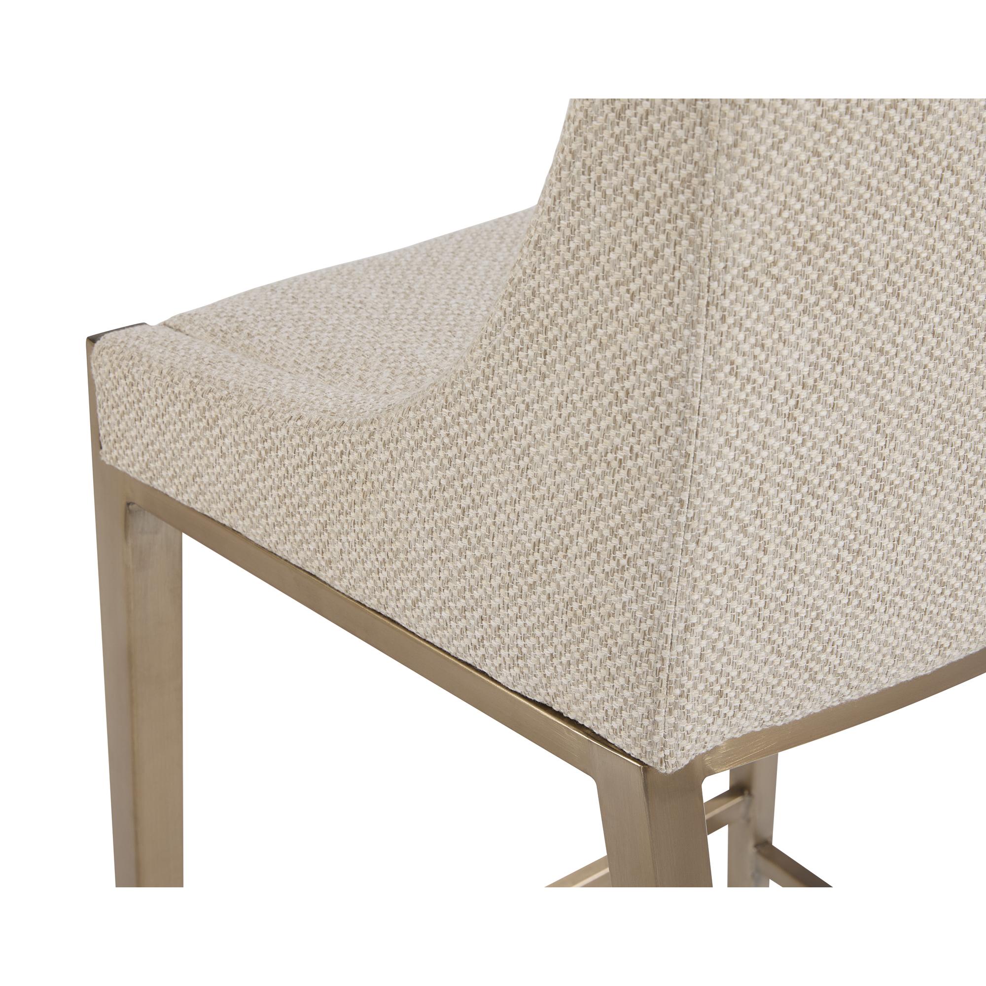 With its clean and modern design, this counter stool is a stunning addition to any dining or kitchen space. Stocked in our textured monument oatmeal fabric and completed with powder coated stainless steel legs in an antique brass finish. Also available in monument pebble fabric.
