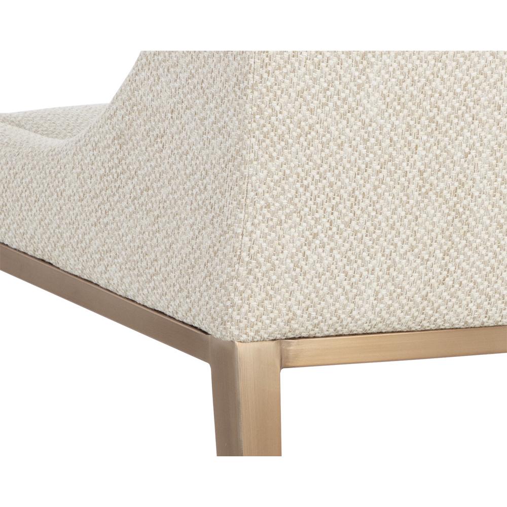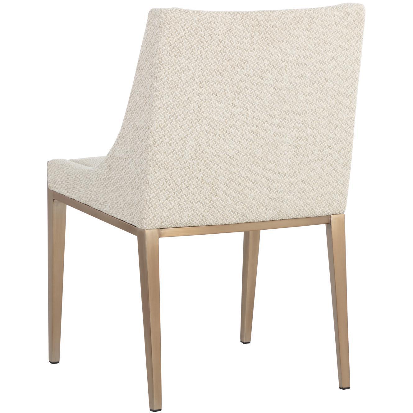 With its clean and modern design, this dining chair is a stunning addition to any dining room space. Stocked in our textured monumental oatmeal fabric and completed with powder coated stainless steel legs in an antique brass finish. Also available in monument pebble fabric.