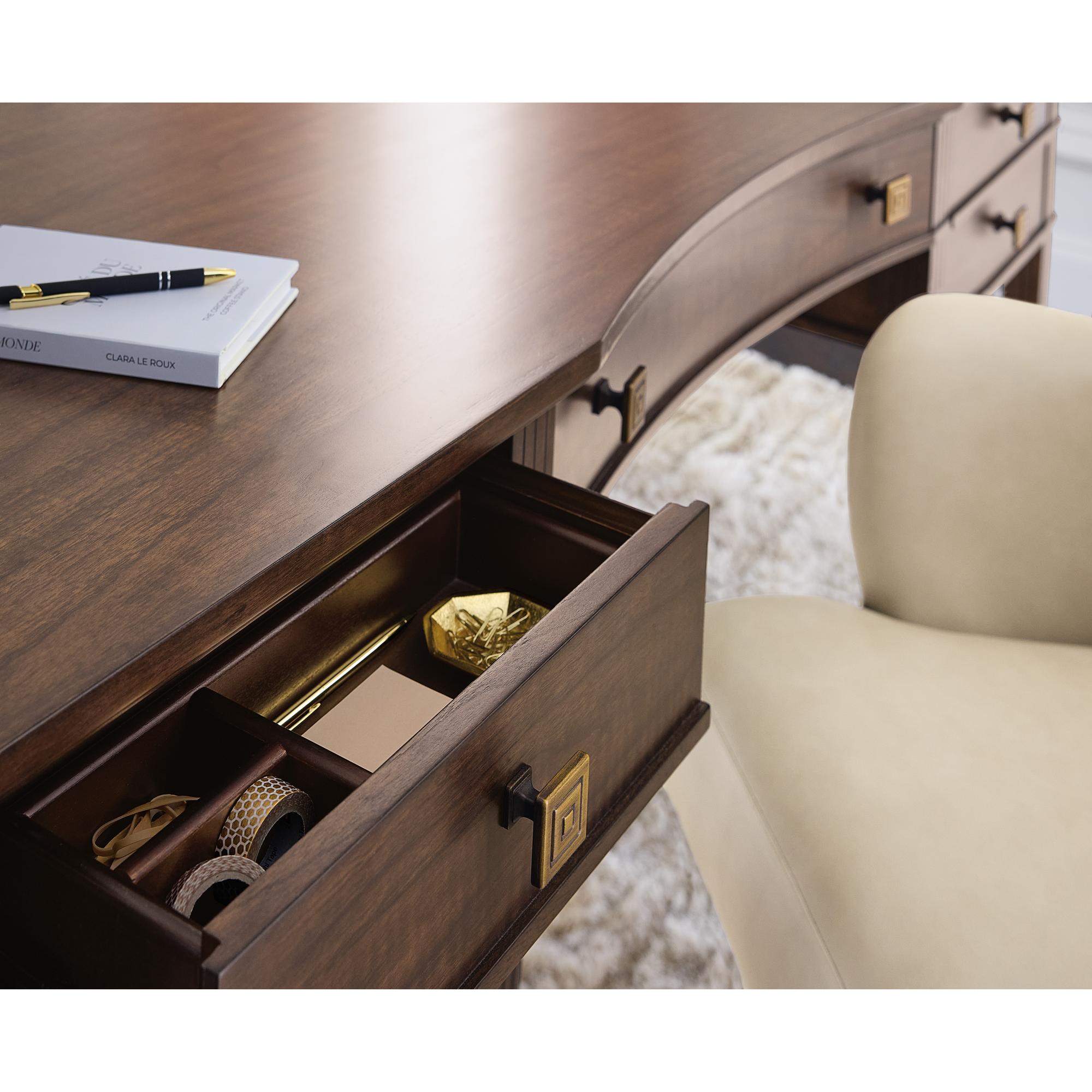 Left and right top top drawers have removable/interchangeable writing surface and pencil tray