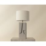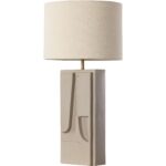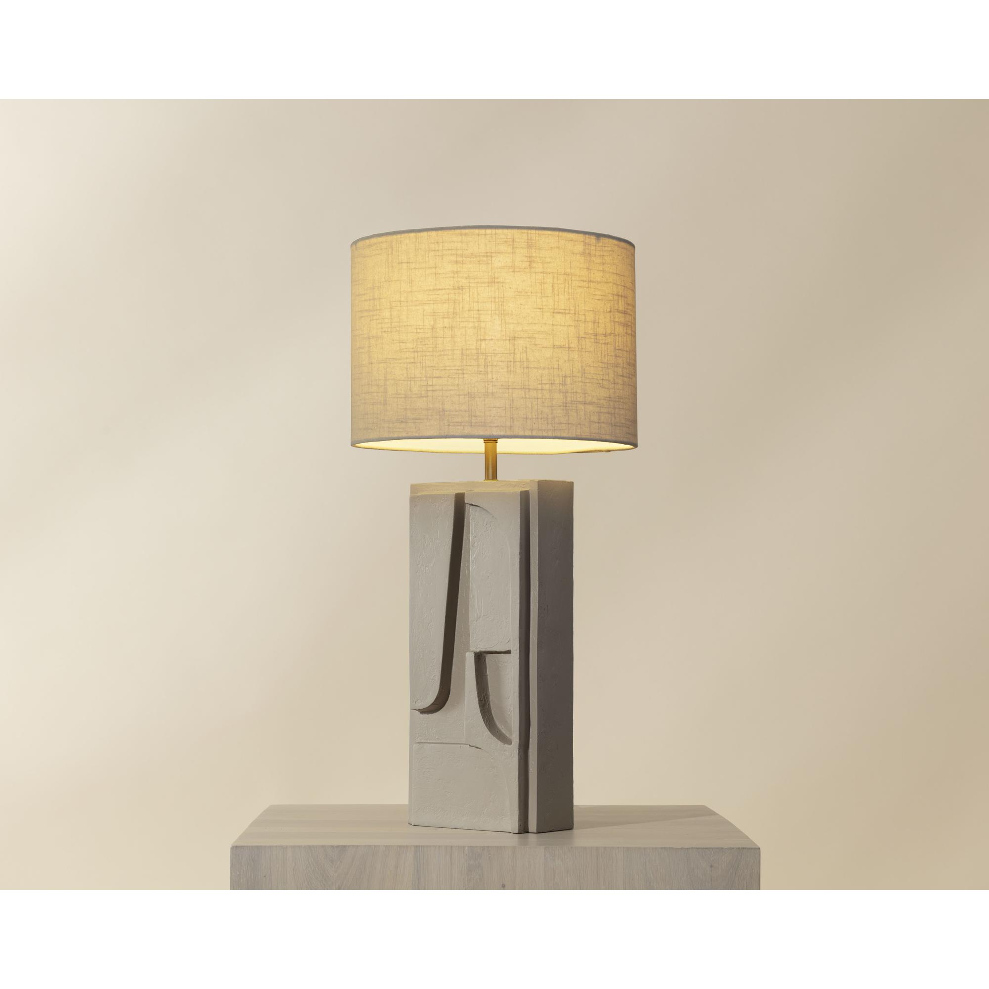 Abstract shapes carved into the base of the Dirsan Table Lamp give the design an artistic flair. Crafted from casted aluminum, this piece retains its sculptural look thanks to its taupe plaster finish.