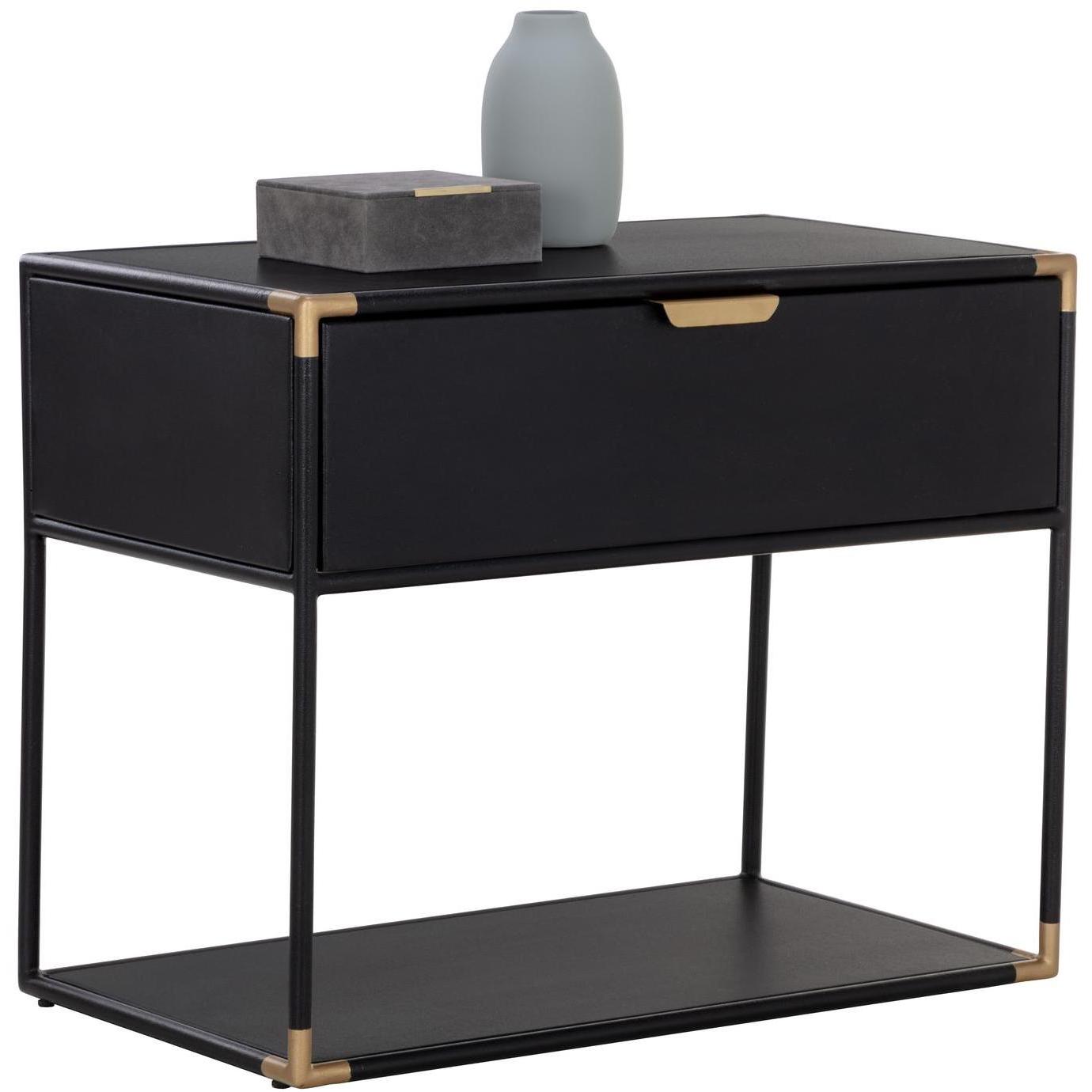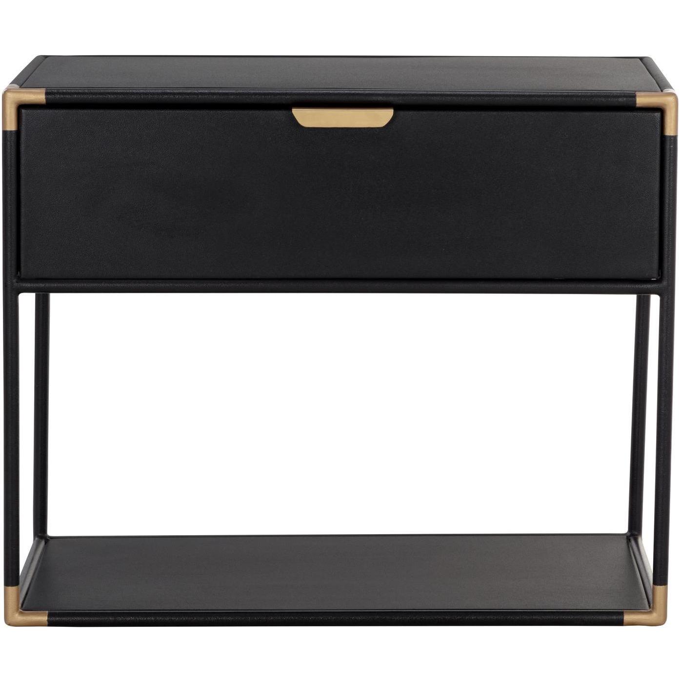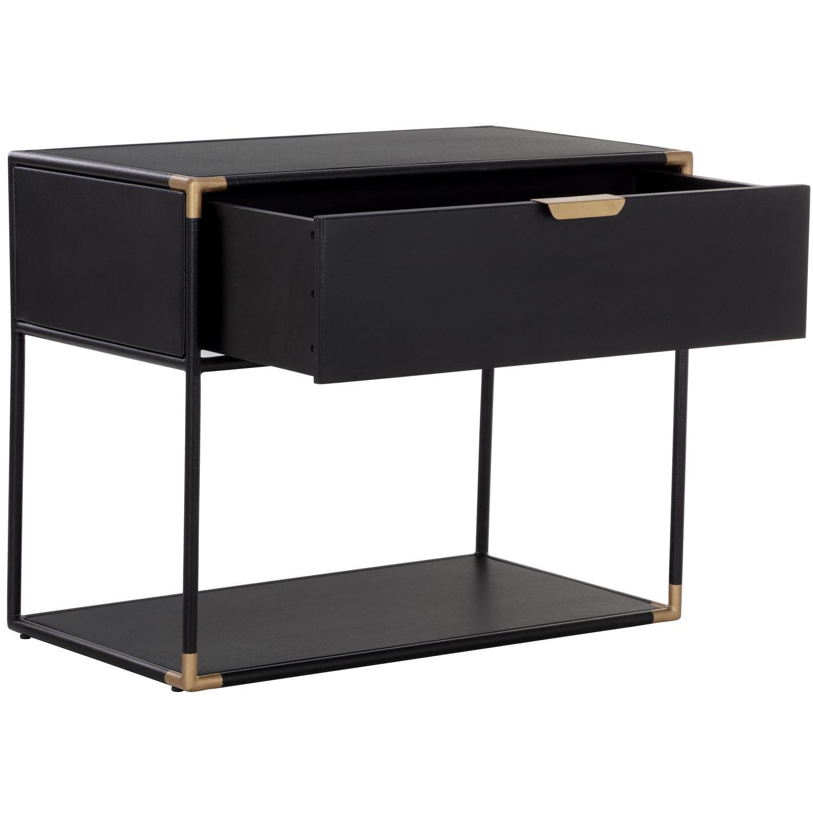 Fully constructed from matte black powder-coated metal, the Doone Nightstand exudes a commanding presence. Matching antique brass handles and hand painted corners elevates the look with complementary contrasting accents. Made in India. With refined craftsmanship, this design was brought to life by skilled local artisans. Due to the nature of handcraftsmanship, unique imperfections such as fissures, markings and variations in colour and shape are welcomed and appreciated characteristics for a truly one-of-a-kind piece.