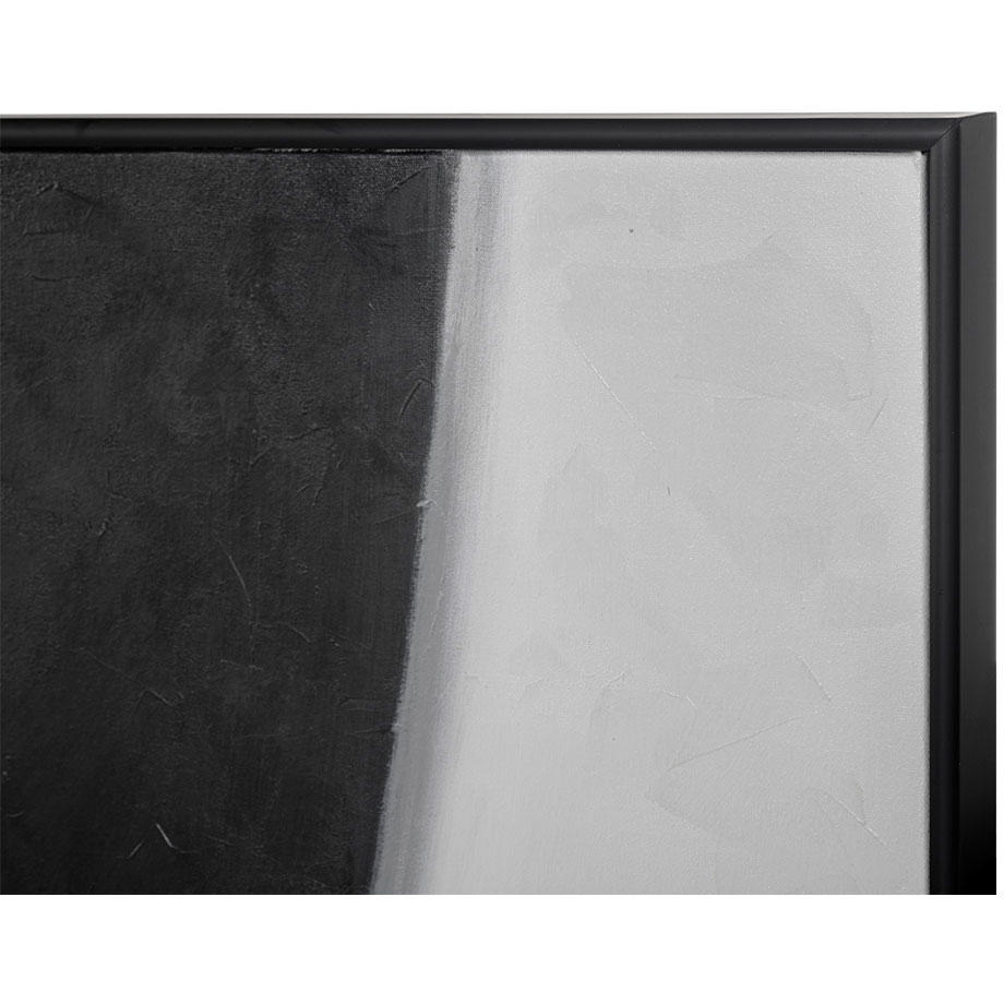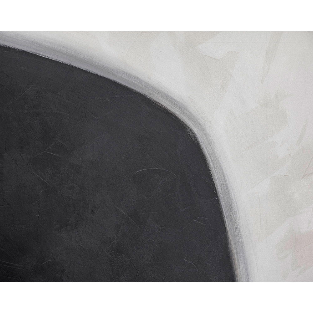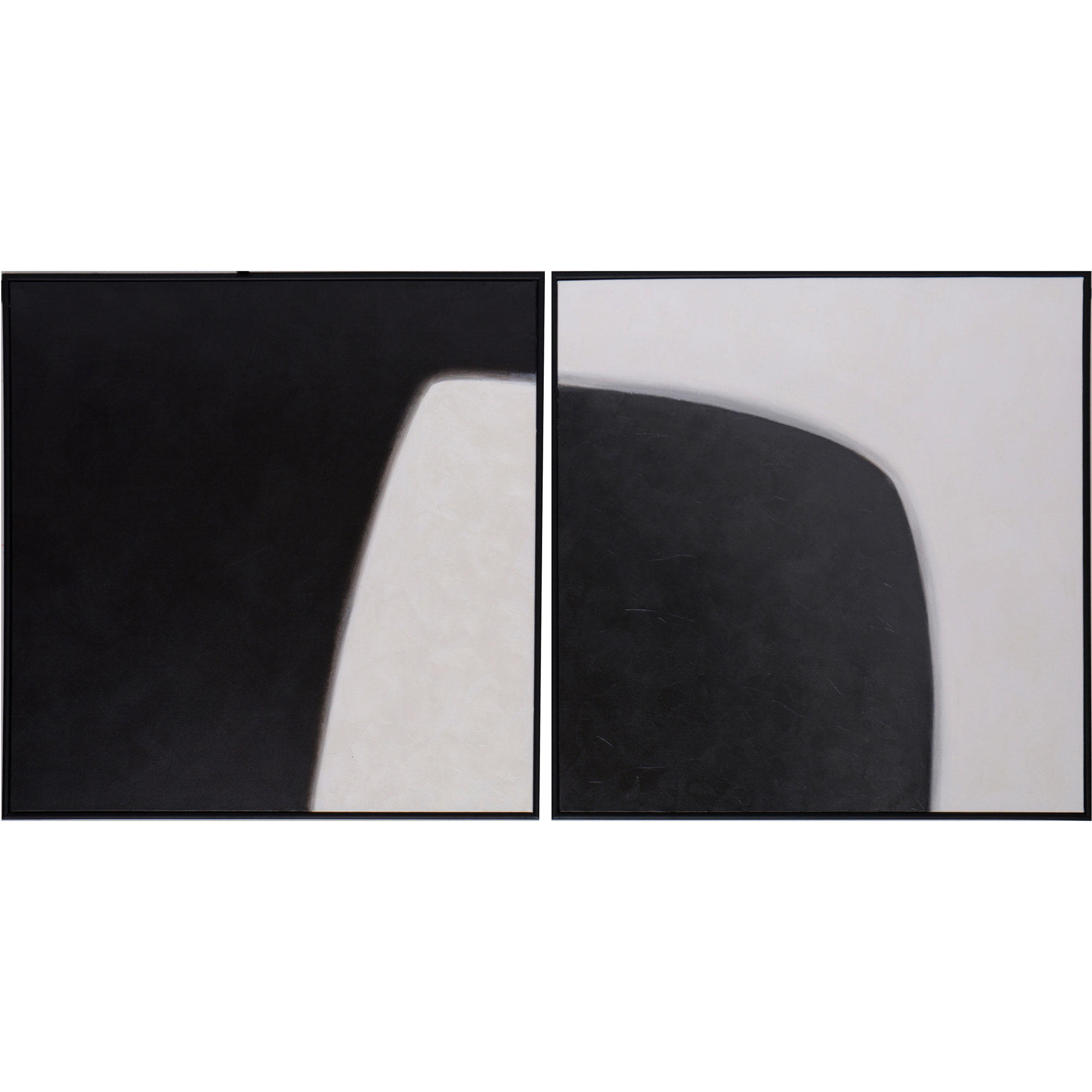 This eye-catching diptych in black and white features modern, abstract figures. A perfect addition to contemporary spaces. Features black finished wood floater frames. Each artwork is hand-painted and will feature slight variations that make every piece unique.