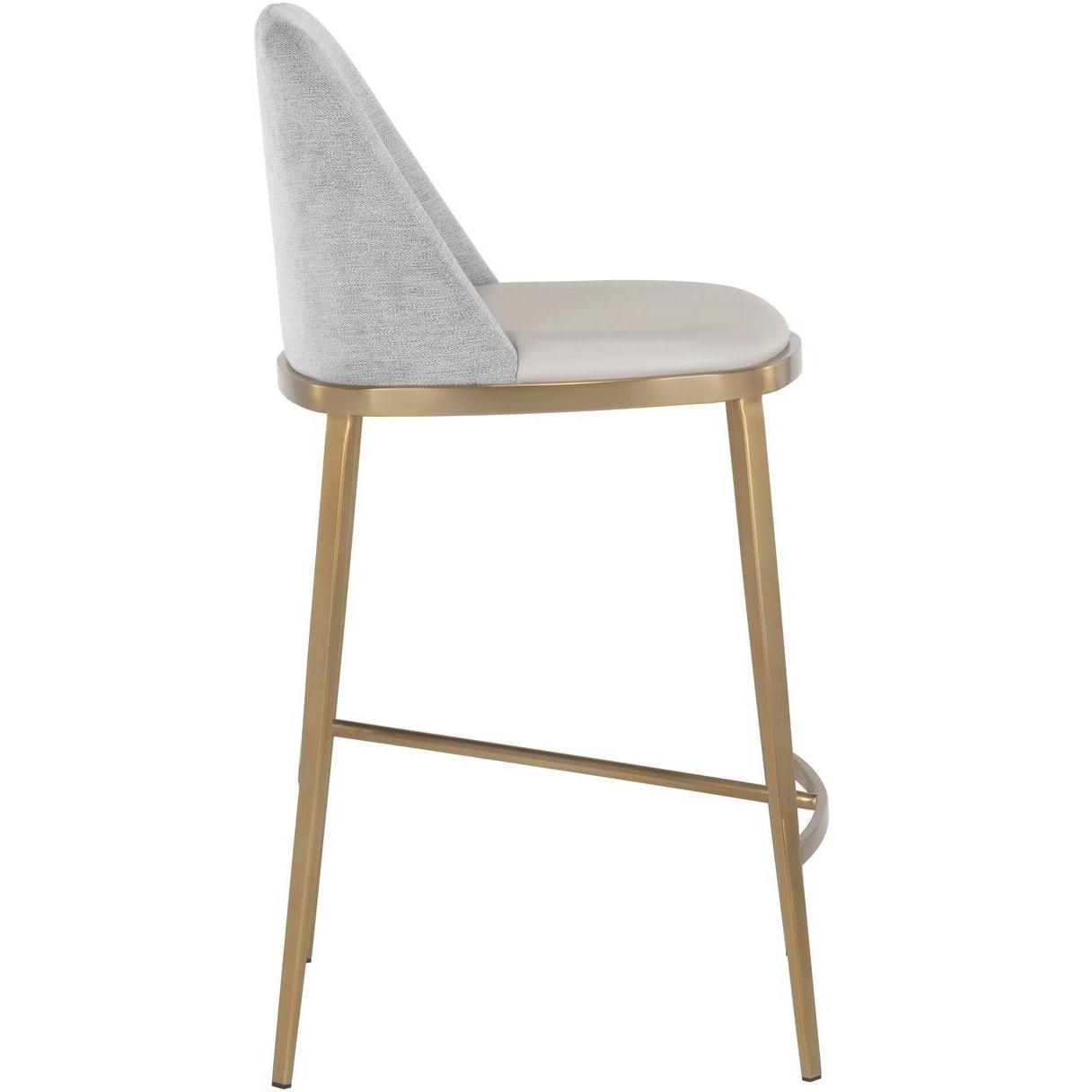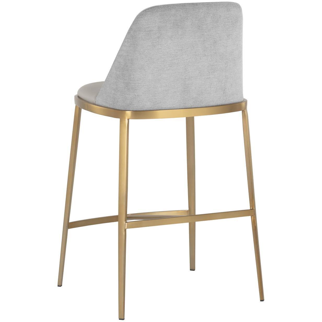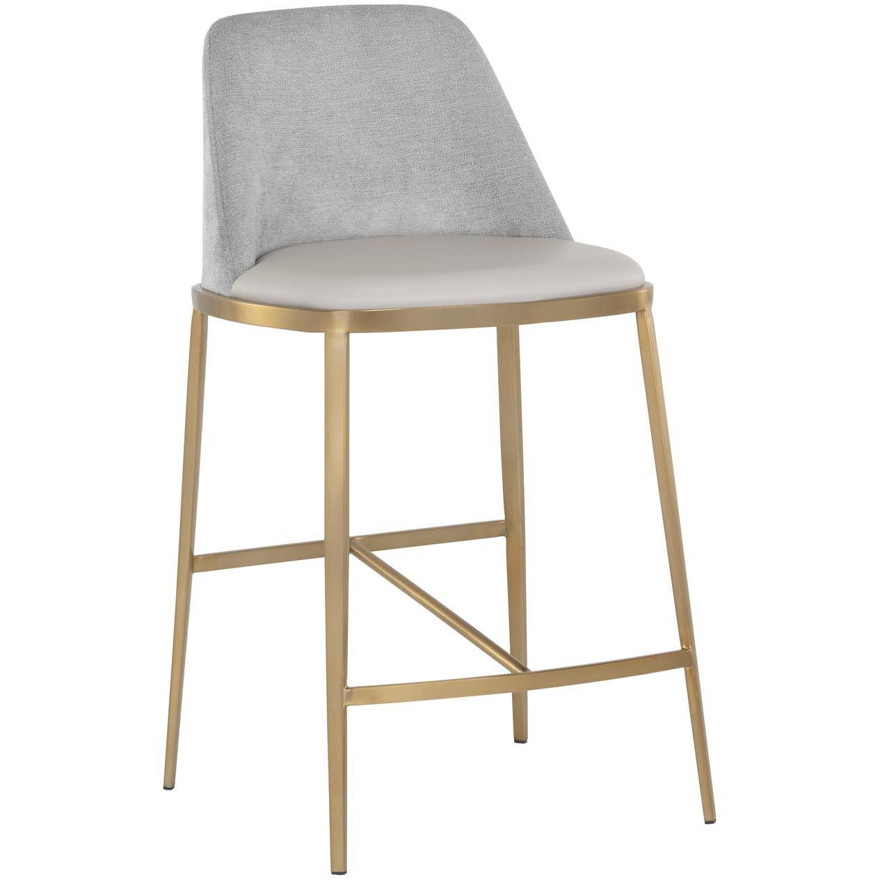 A combination of mixed materials creates a truly luxurious counter stool. The contemporary silhouette is finished with a napa stone faux leather seat, polo club stone fabric seatback and sleek brushed gold steel legs. An eye-catching piece from all angles. Handle With Care: This design has been crafted with faux leather. Faux leather is manufactured to reflect the natural characteristics of leather; as such, colour variations, markings, wrinkles, grooves, and light scratches are appreciated characteristics. No two pieces will be alike.