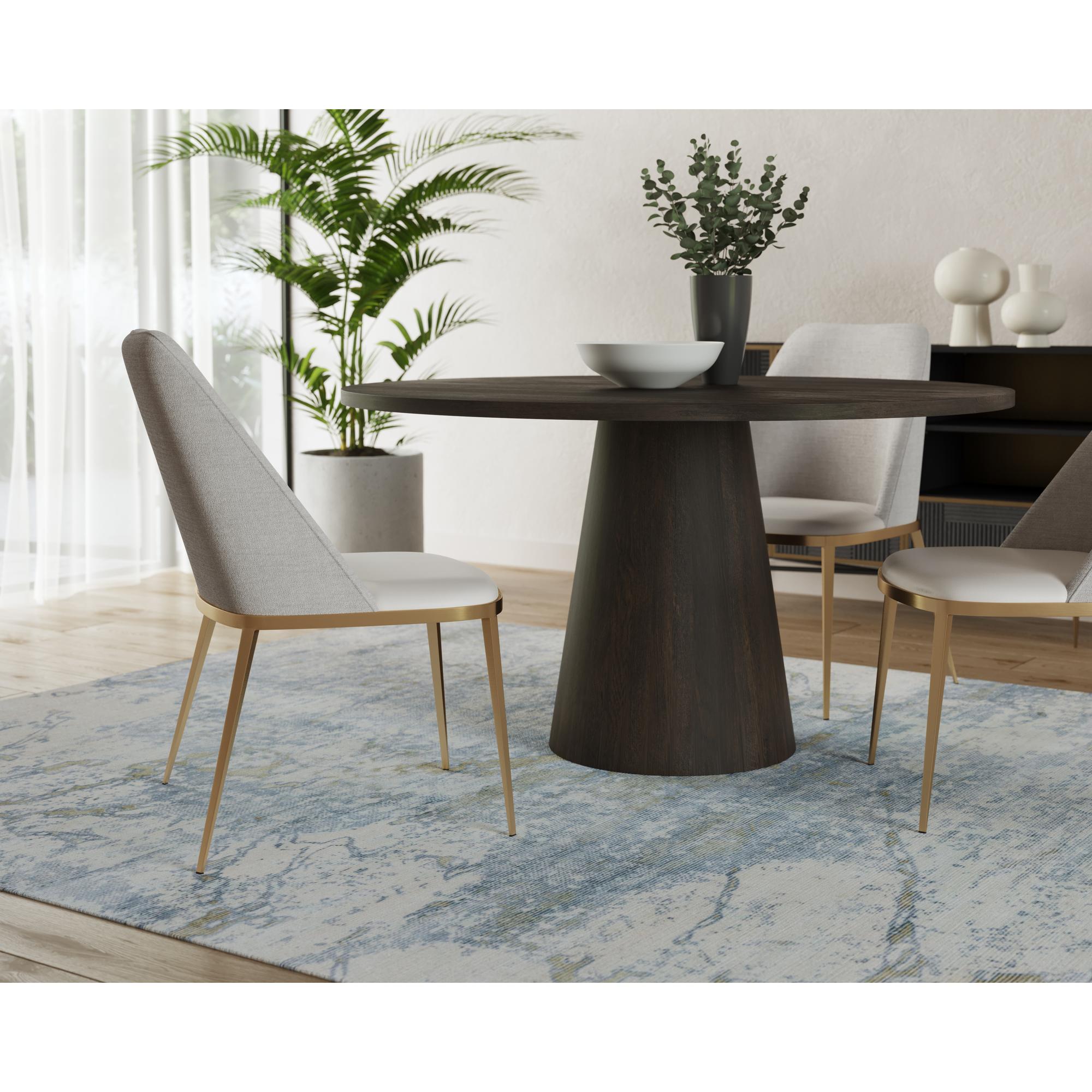 A combination of mixed materials creates a truly luxurious dining chair. The contemporary silhouette is finished with a napa stone faux leather seat, polo club stone fabric seatback and sleek brushed gold steel legs. An eye-catching piece from all angles. Handle With Care: This design has been crafted with faux leather. Faux leather is manufactured to reflect the natural characteristics of leather; as such, colour variations, markings, wrinkles, grooves, and light scratches are appreciated characteristics. No two pieces will be alike.