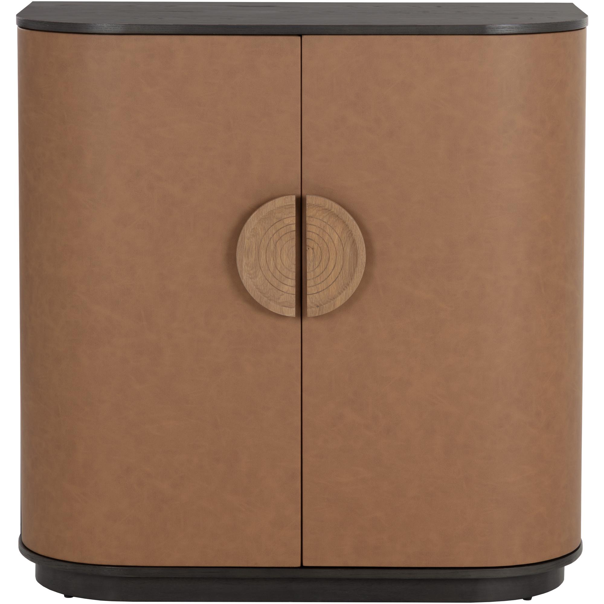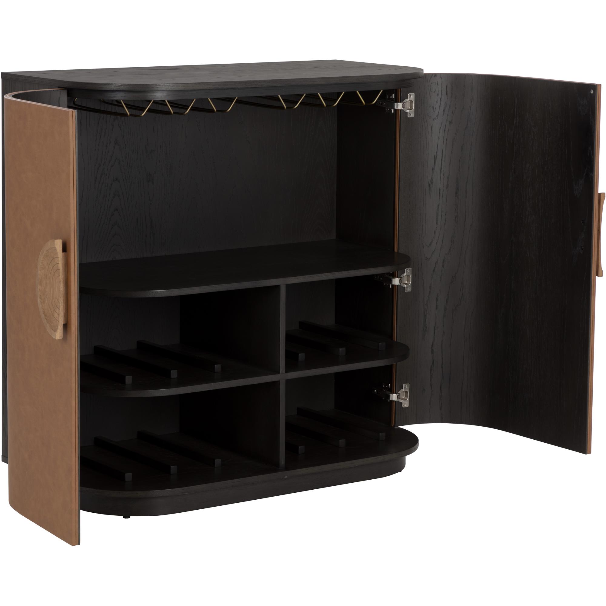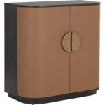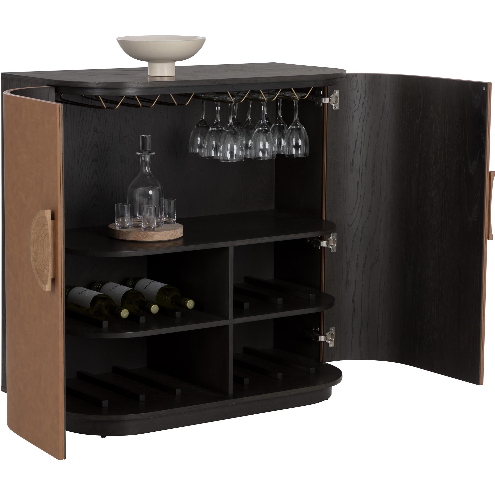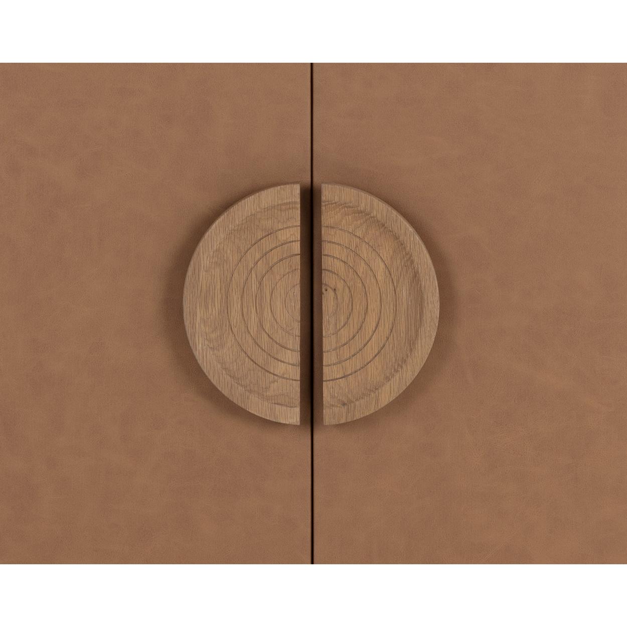 Mid-century flair and expert craftsmanship give the Dresden Bar Cabinet a handsome form. Constructed from smoke grey oak veneer and rubberwood with milliken cognac faux leather on the doors for an intriguing look. Textured circular handles in solid oak wood add a global flair. This cabinet features built-in storage for wine and stemware. As wood is an organic, porous material, these pieces will contain natural variation of texture and may also exhibit fine indentations and cracks. Wood pieces will also display a disparity of colour and grain, and visible knots and burls that add to the character of each piece.