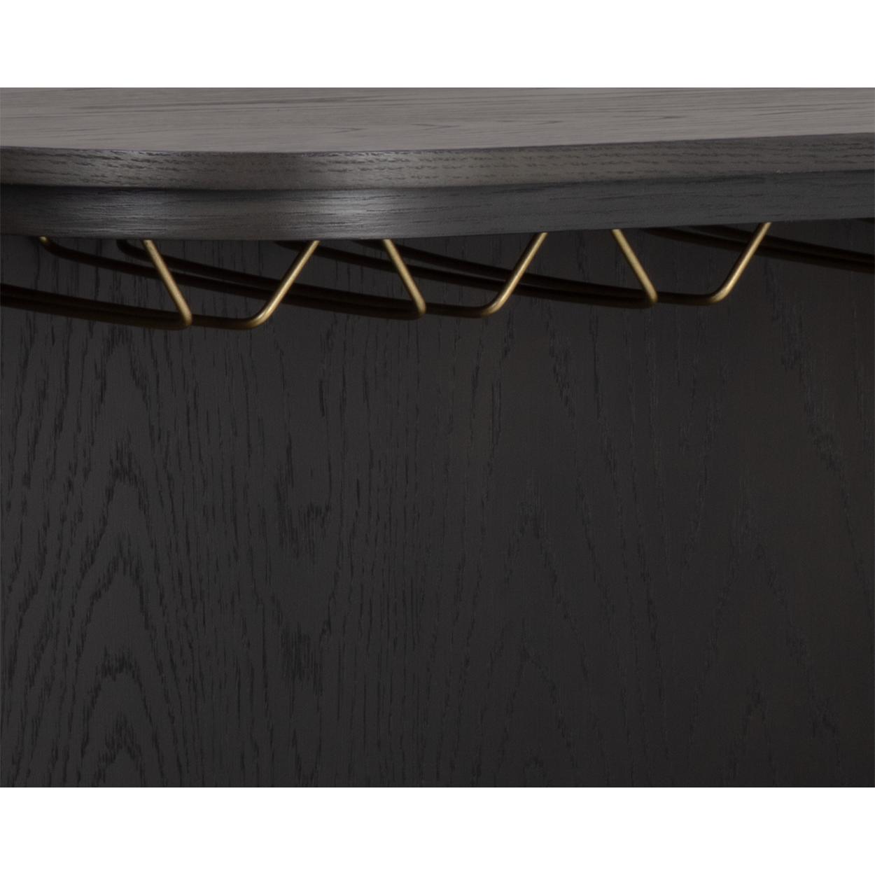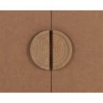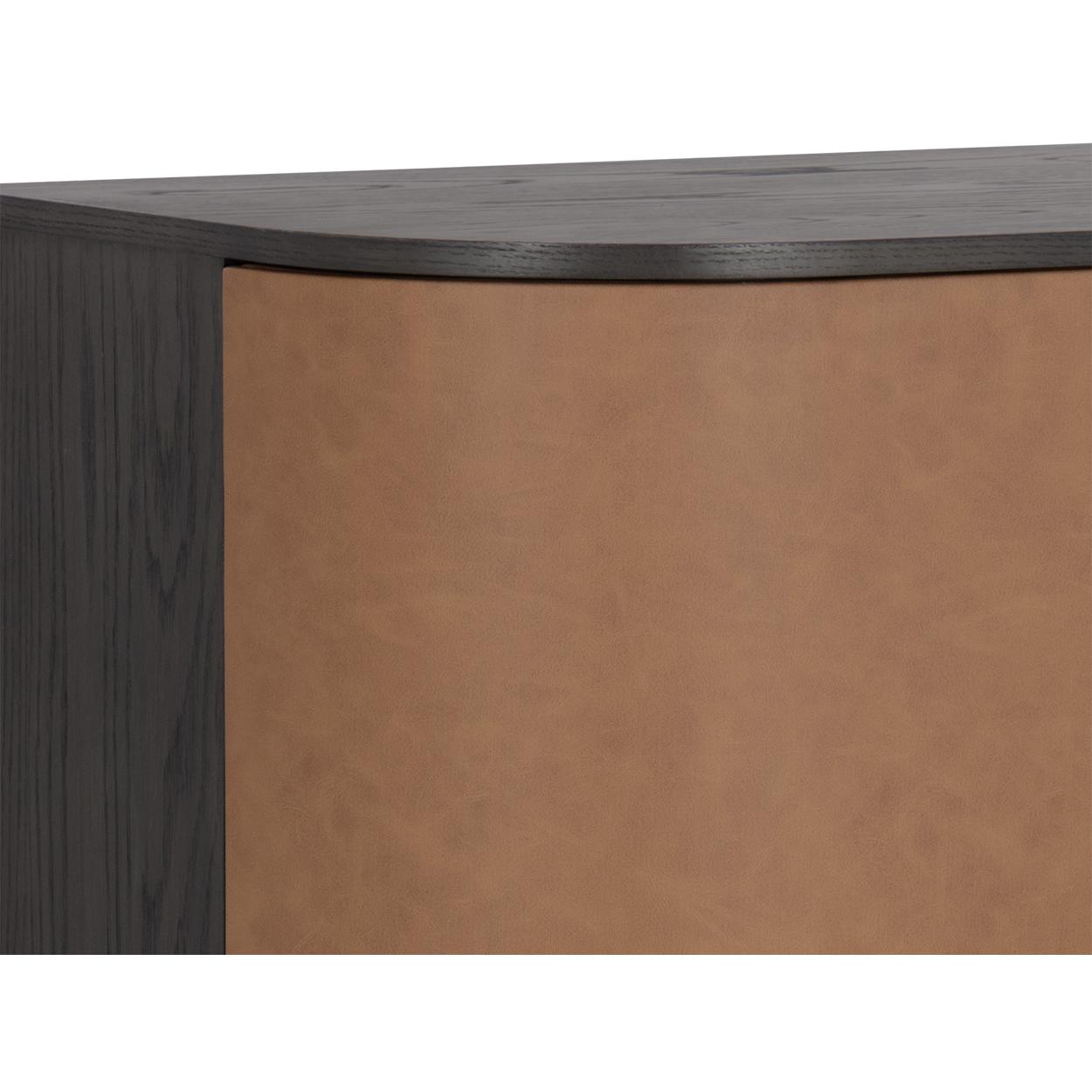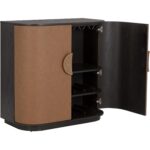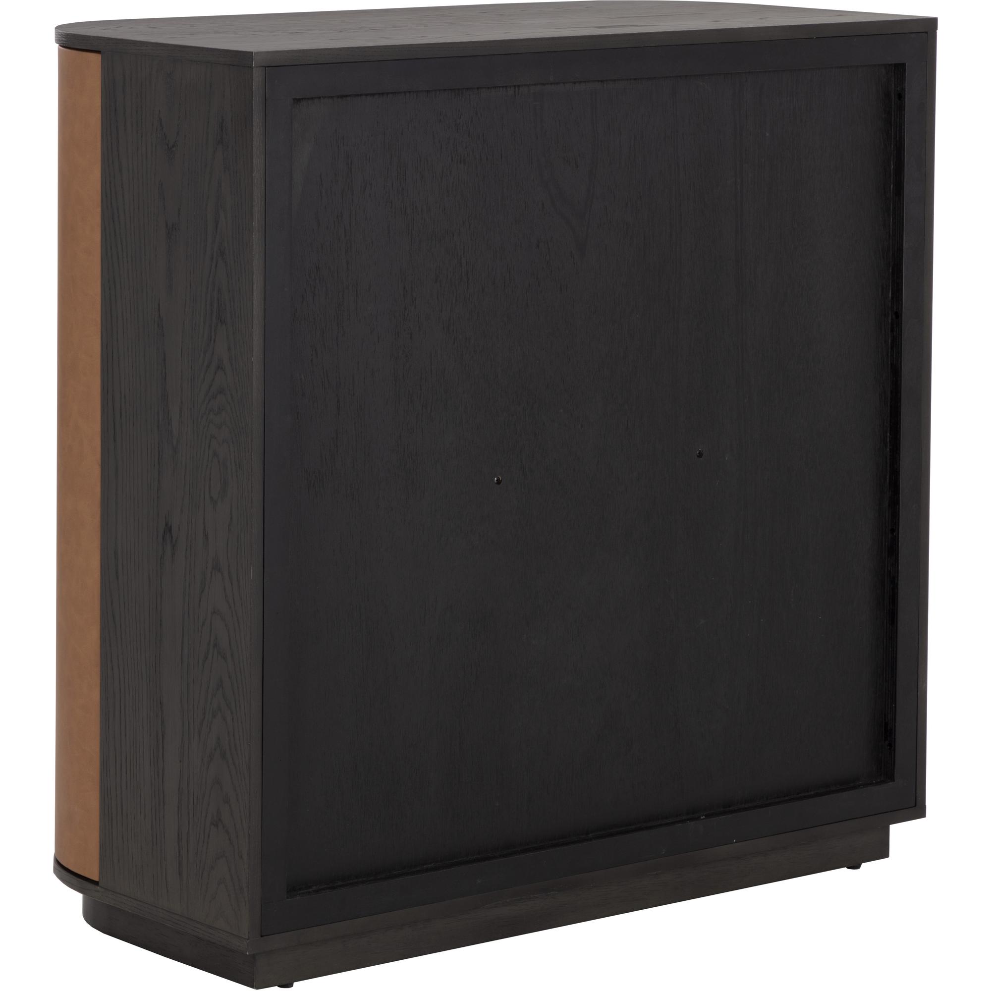 Mid-century flair and expert craftsmanship give the Dresden Bar Cabinet a handsome form. Constructed from smoke grey oak veneer and rubberwood with milliken cognac faux leather on the doors for an intriguing look. Textured circular handles in solid oak wood add a global flair. This cabinet features built-in storage for wine and stemware. As wood is an organic, porous material, these pieces will contain natural variation of texture and may also exhibit fine indentations and cracks. Wood pieces will also display a disparity of colour and grain, and visible knots and burls that add to the character of each piece.