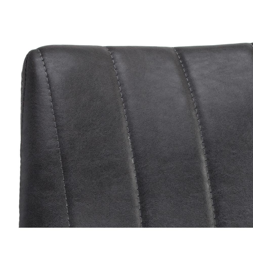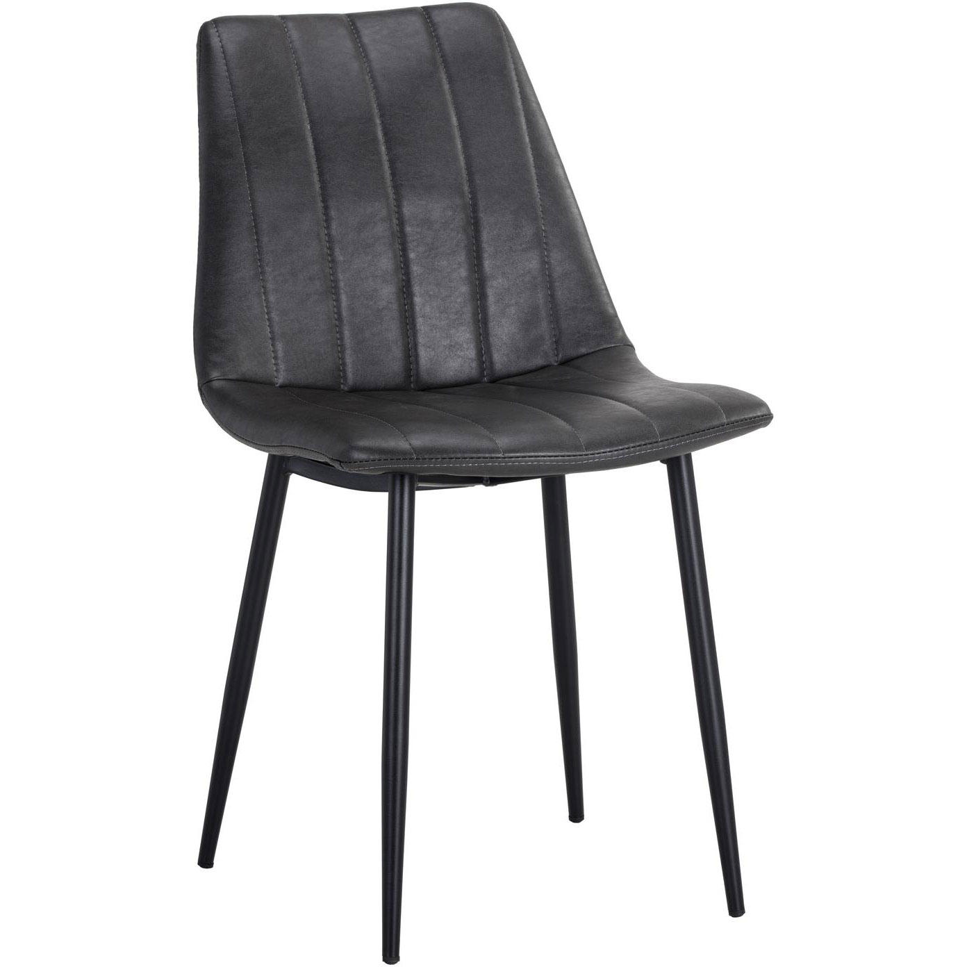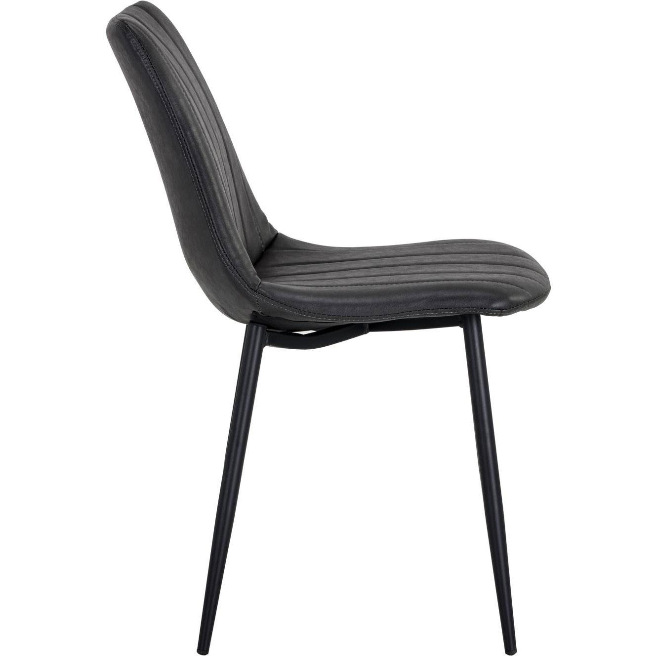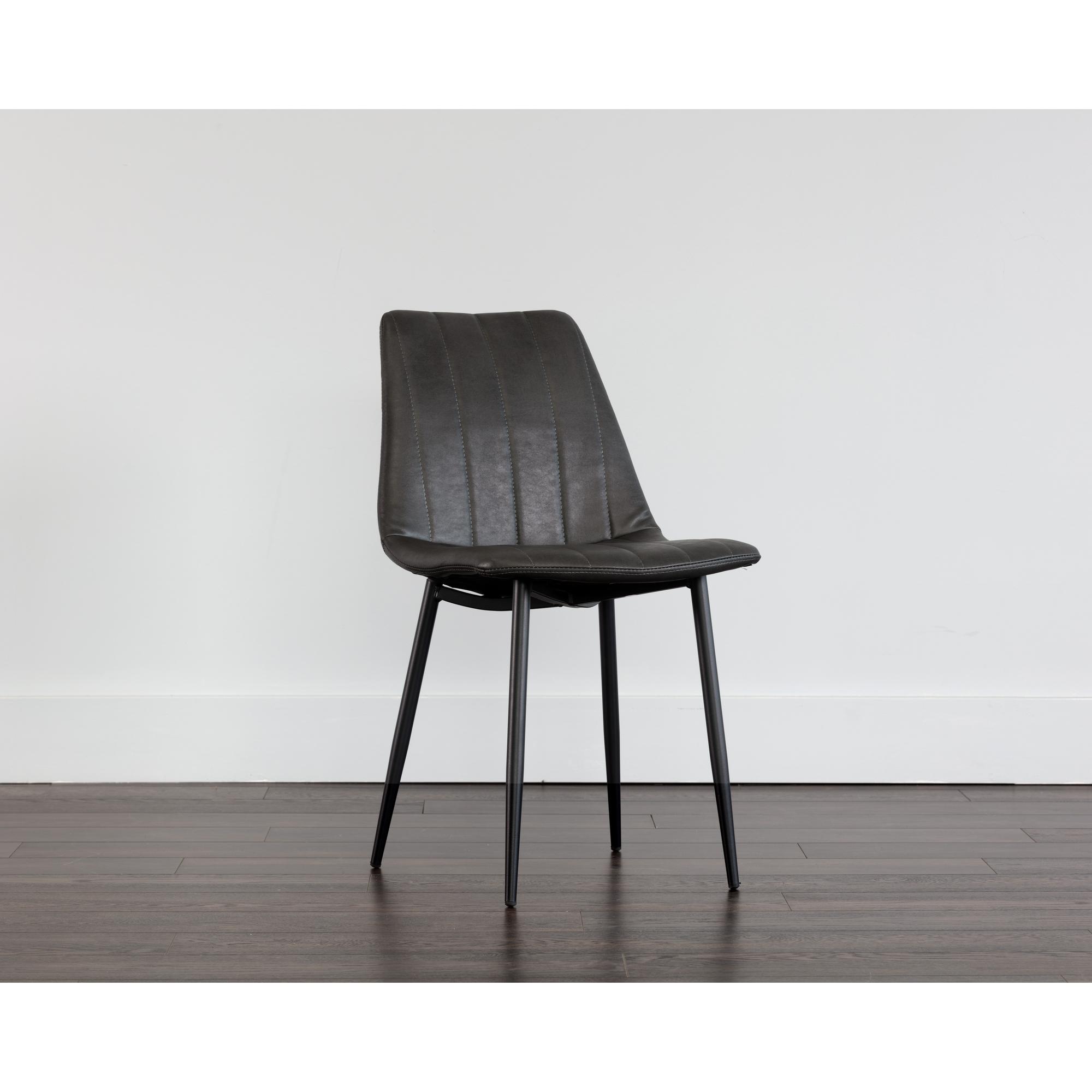 This compact dining chair creates a cool and casual mood. Features channel tufting on the seat and seatback. Stocked in bravo cognac or portabella faux leather, or light grey fabric with a black powder coated steel frame. Also available in antonio linen fabric with a brushed champagne gold steel frame. Handle With Care: This design has been crafted with faux leather. Faux leather is manufactured to reflect the natural characteristics of leather; as such, colour variations, markings, wrinkles, grooves, and light scratches are appreciated characteristics. No two pieces will be alike.