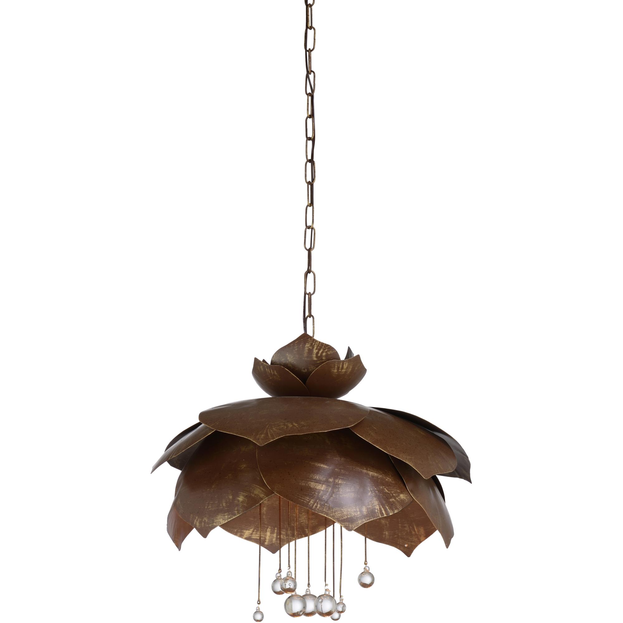 Brown finish with gold highlights on flower petal 6 light pendant, clear crystal teardrops, comes with 6 foot chain
