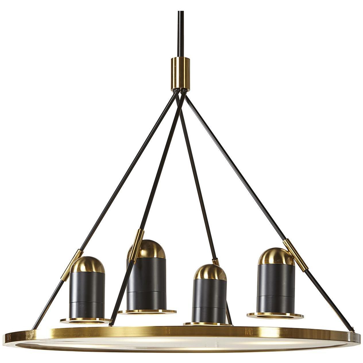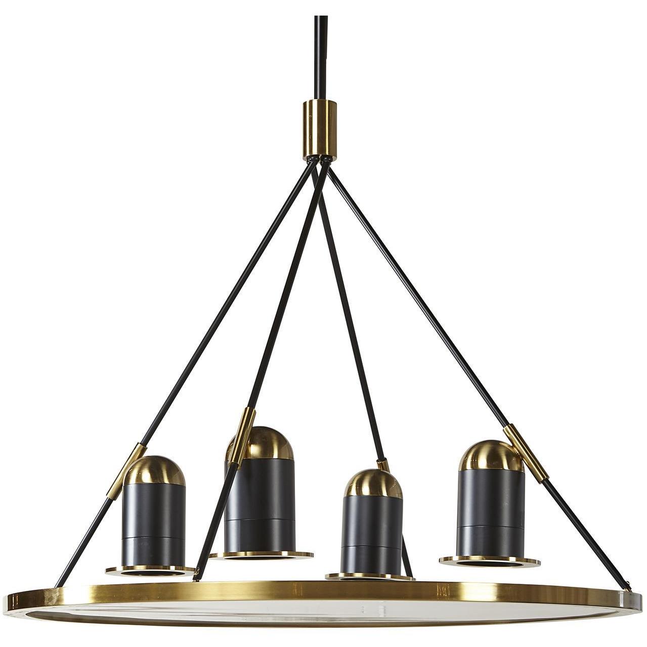 Add drama to any space with this spectacular chandelier. Features four light shades in matte black with antique brass plating, and completed with a large, clear round glass lens.
