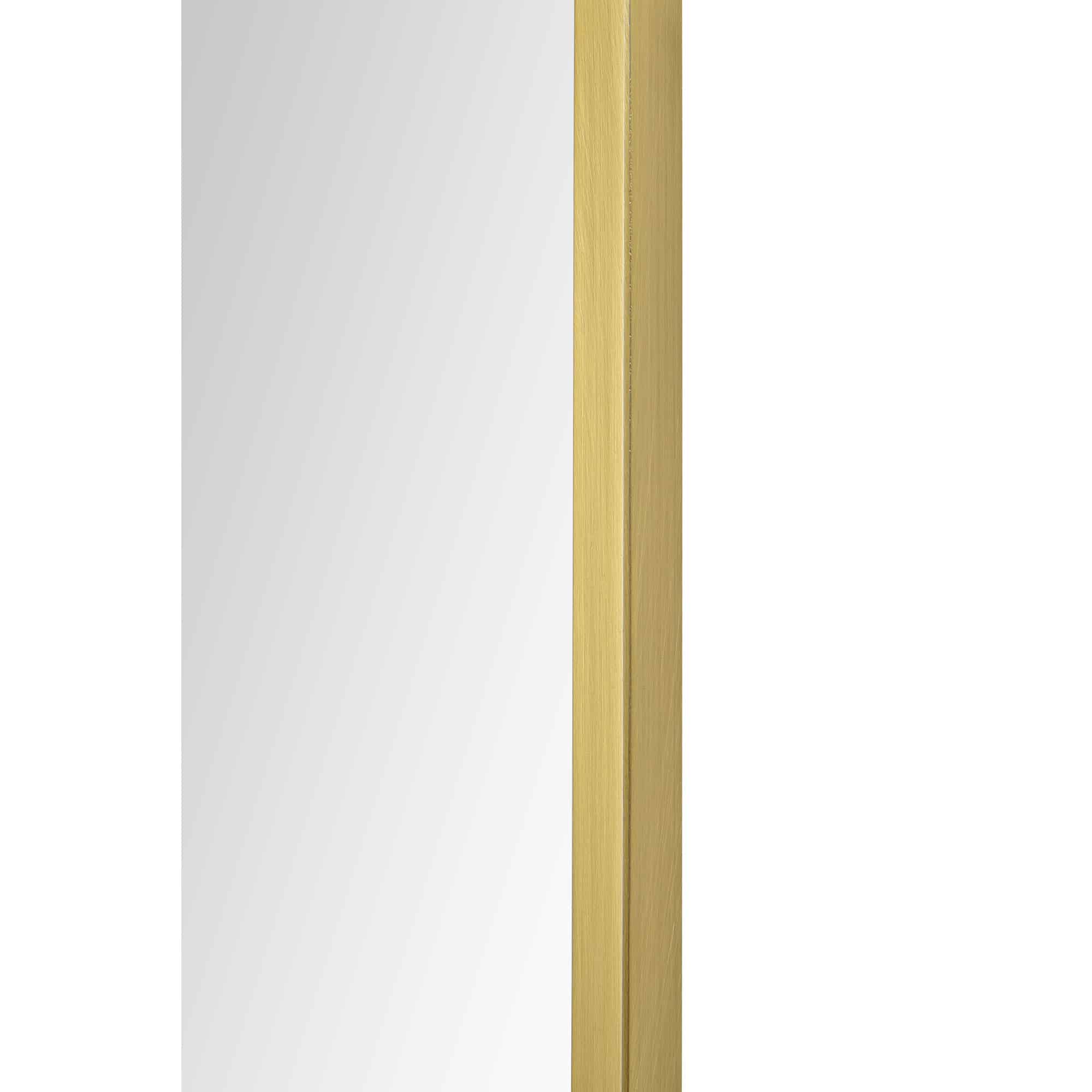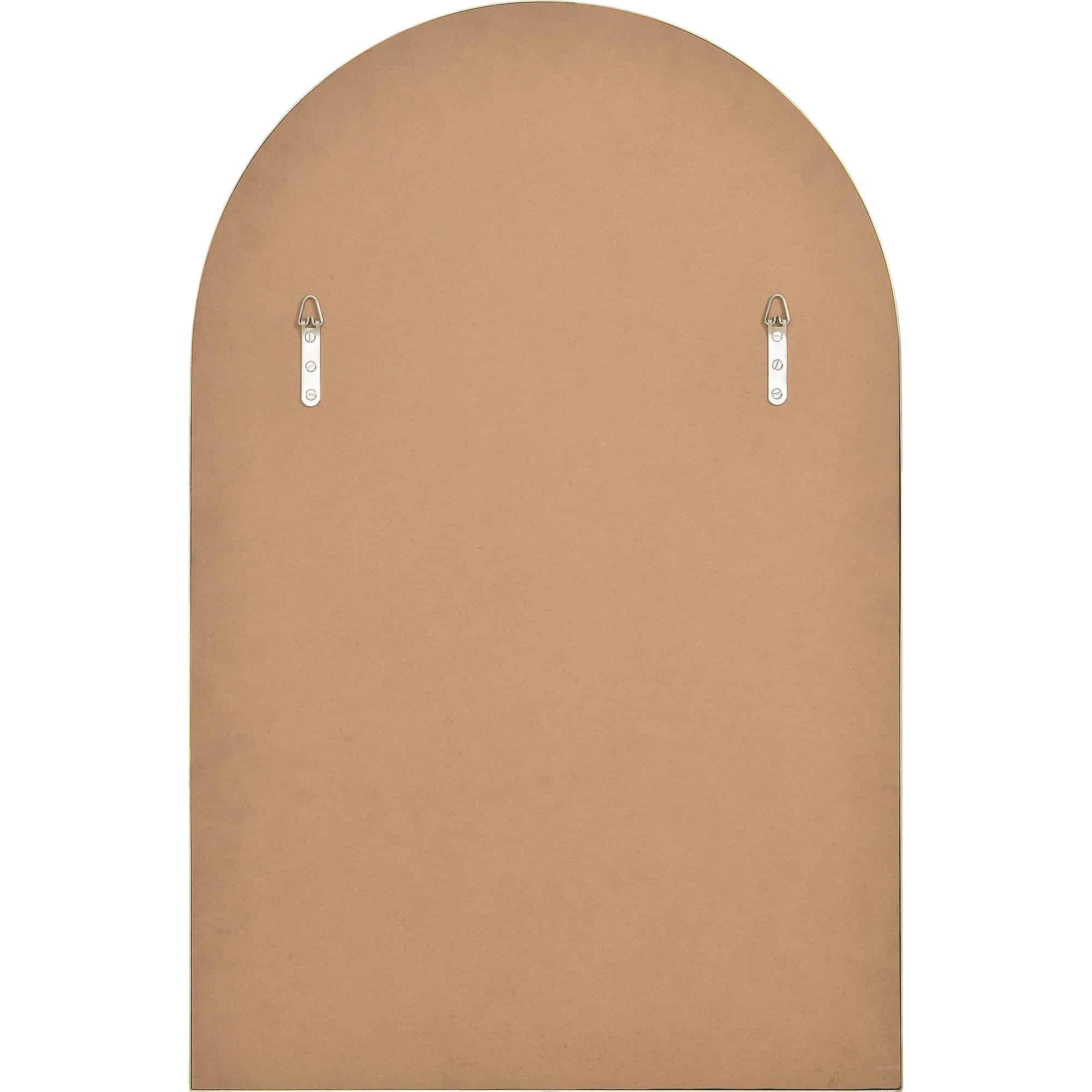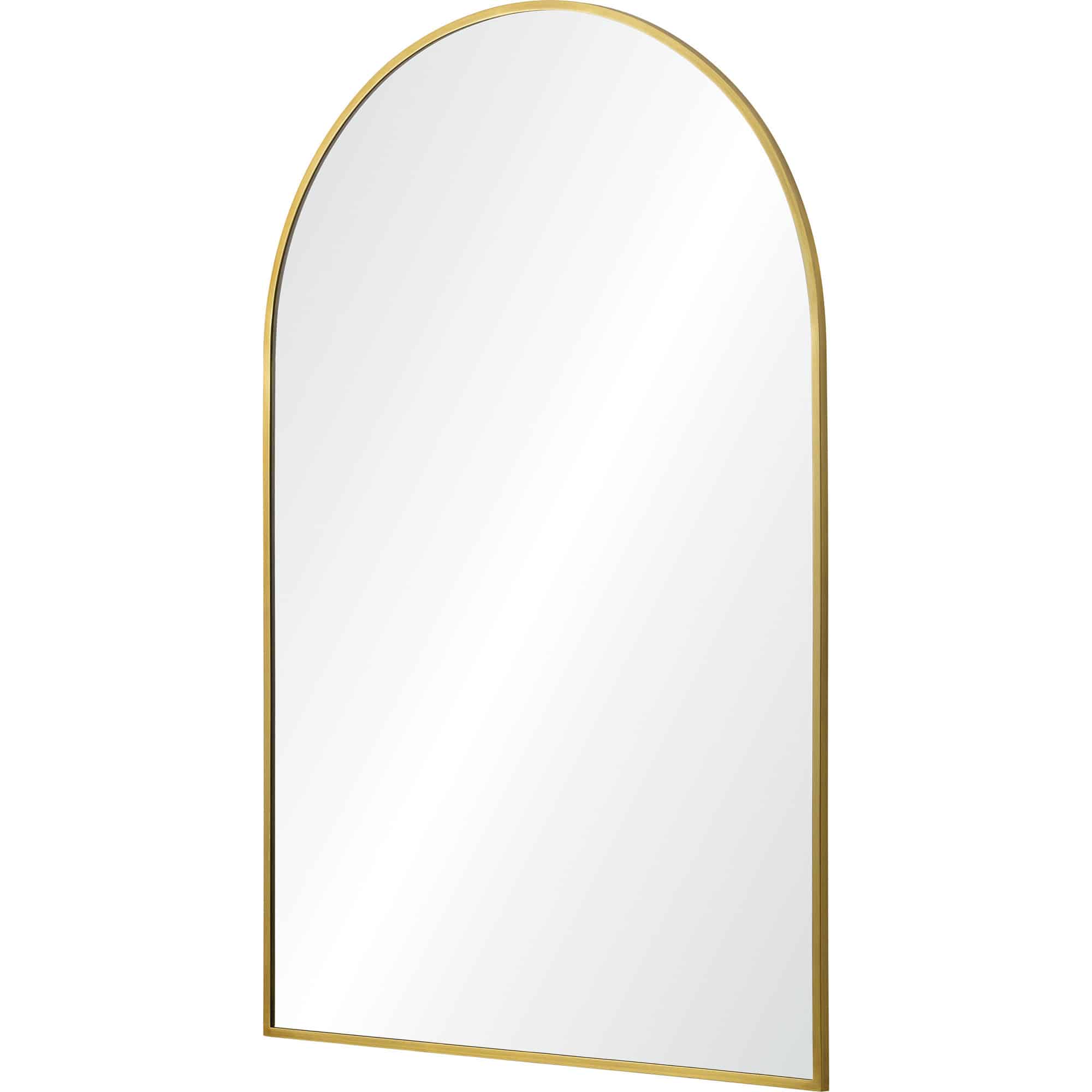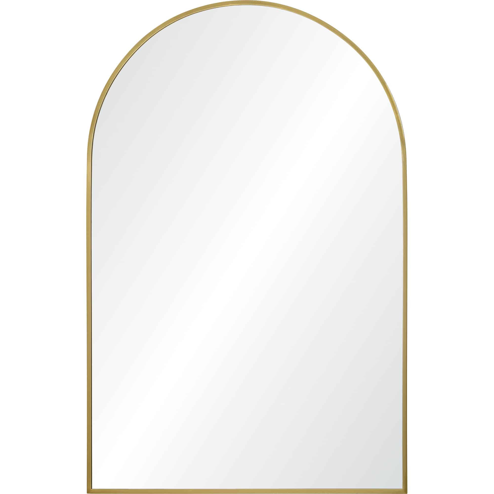 A curving structure adds a formality to the form of this minimal mirror design. With a 24-inch width and 36-inch height, it allows for both hanging and resting above furnishing arrangements. The gleaming satin brass plated iron frame provides a dazzling detail and creates compatibility with contemporary, classic and mid-century modern interiors.