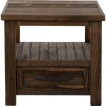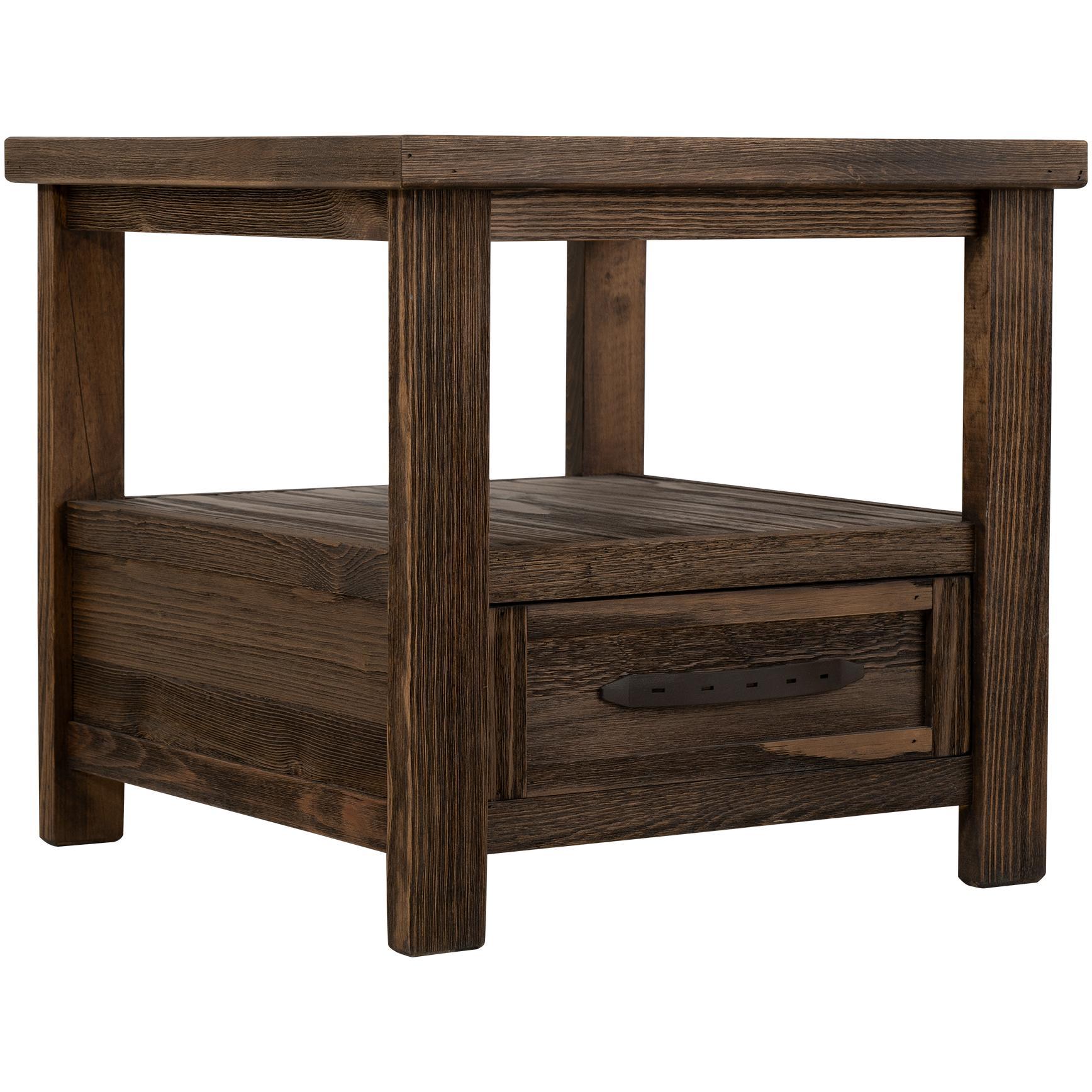 The Dutton Occasional Tables Collection is a masterpiece of country cottage style, symbolizing stability and rootedness in an ever-changing world. Designed with both style and utility in mind, these tables feature visible wood grain and natural knots that add texture and authenticity to each piece. The rich brown stain highlights the beauty of the wood while enhancing its rustic and timeless appeal. The end table features one drawer and one open shelf. This clever design enhances functionality while keeping the space organized. The Dutton Occasional Tables Collection complements a range of interior styles, bringing a touch of rustic sophistication to any setting.