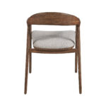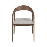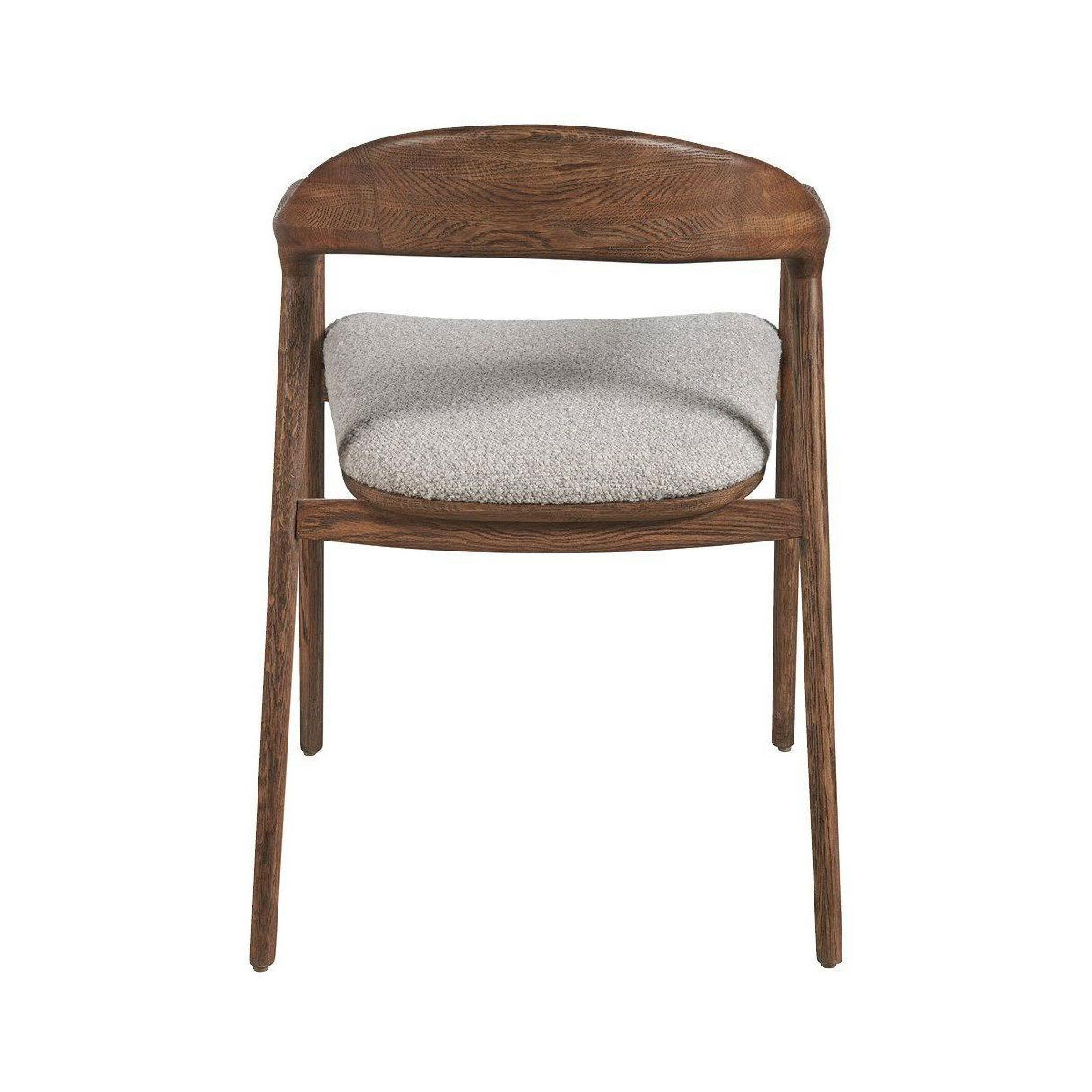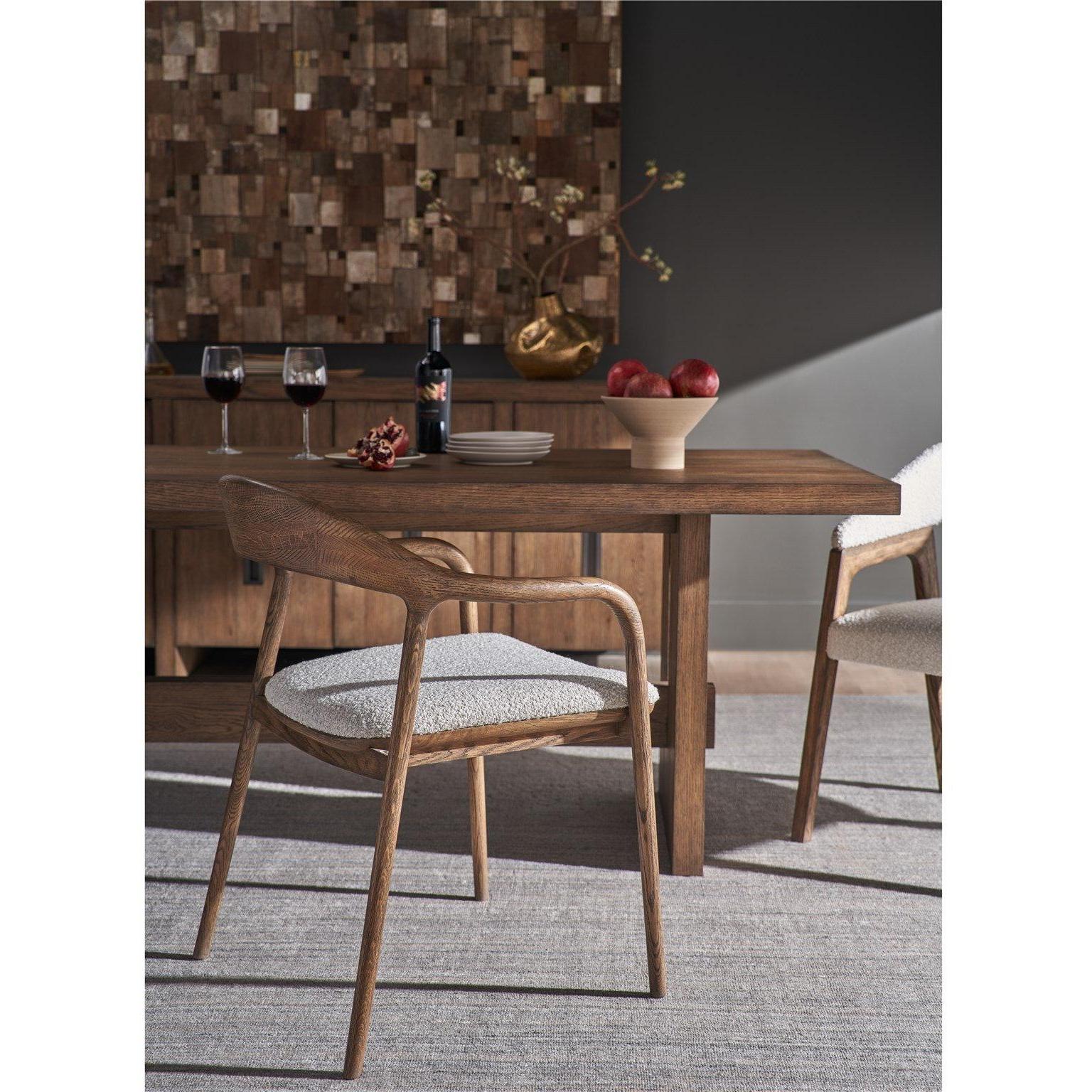 The Echo Dining Arm Chair, available in several finishes and upholstered in the refined Medina Pebble fabric, encapsulates elegance with its rounded, open-air back design. Its lithe, straight legs and gently curved back exude a sleek, streamlined form, imparting an aura of sophisticated airiness to the modern dining ensemble.