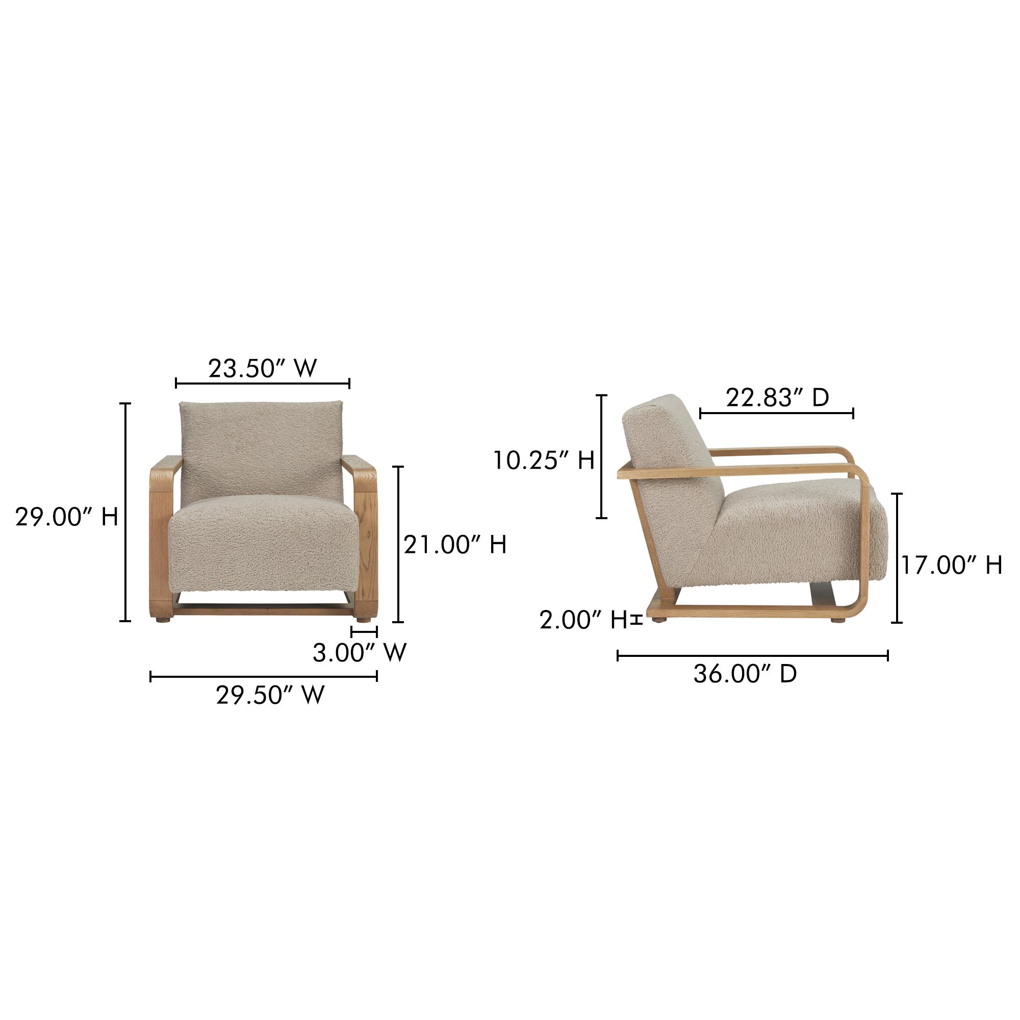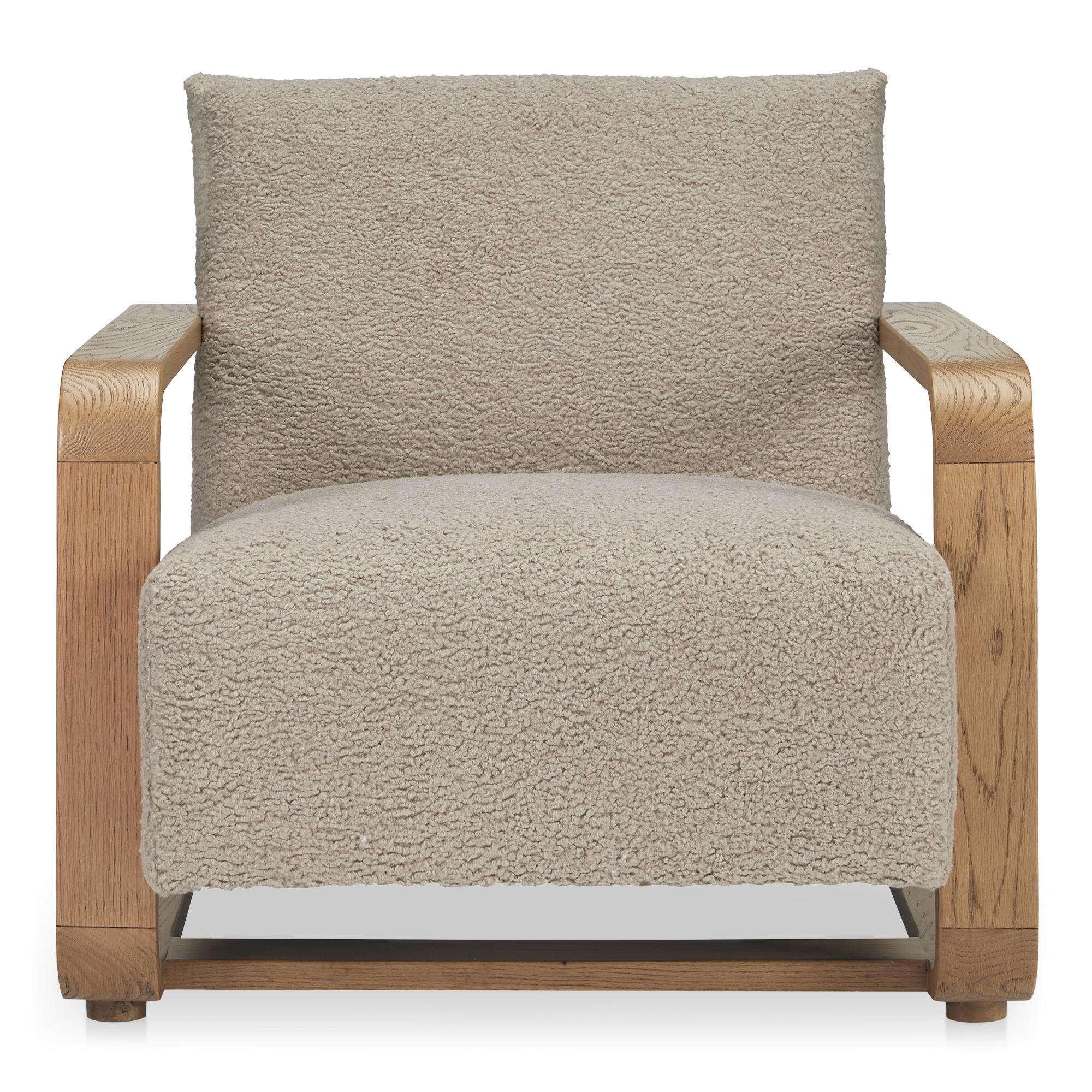 Featuring a solid oak frame finished in a warm vintage stain that highlights the natural beauty and graining of the wood, the Eckersley lounge chair draws inspiration from the past, infusing any space with rustic warmth and sumptuous comfort. While generous in its proportions, the wide, sturdy arm profile is perfectly complemented by the plush softness of faux shearling upholstery, offering an irresistibly inviting tactile experience.