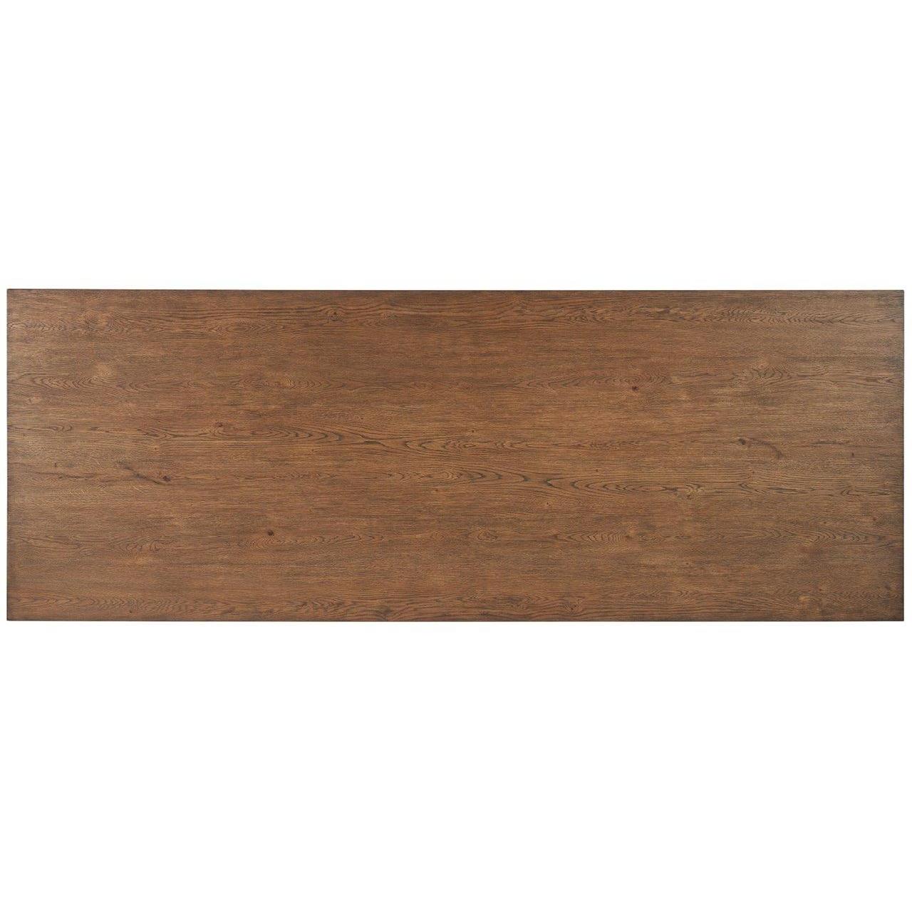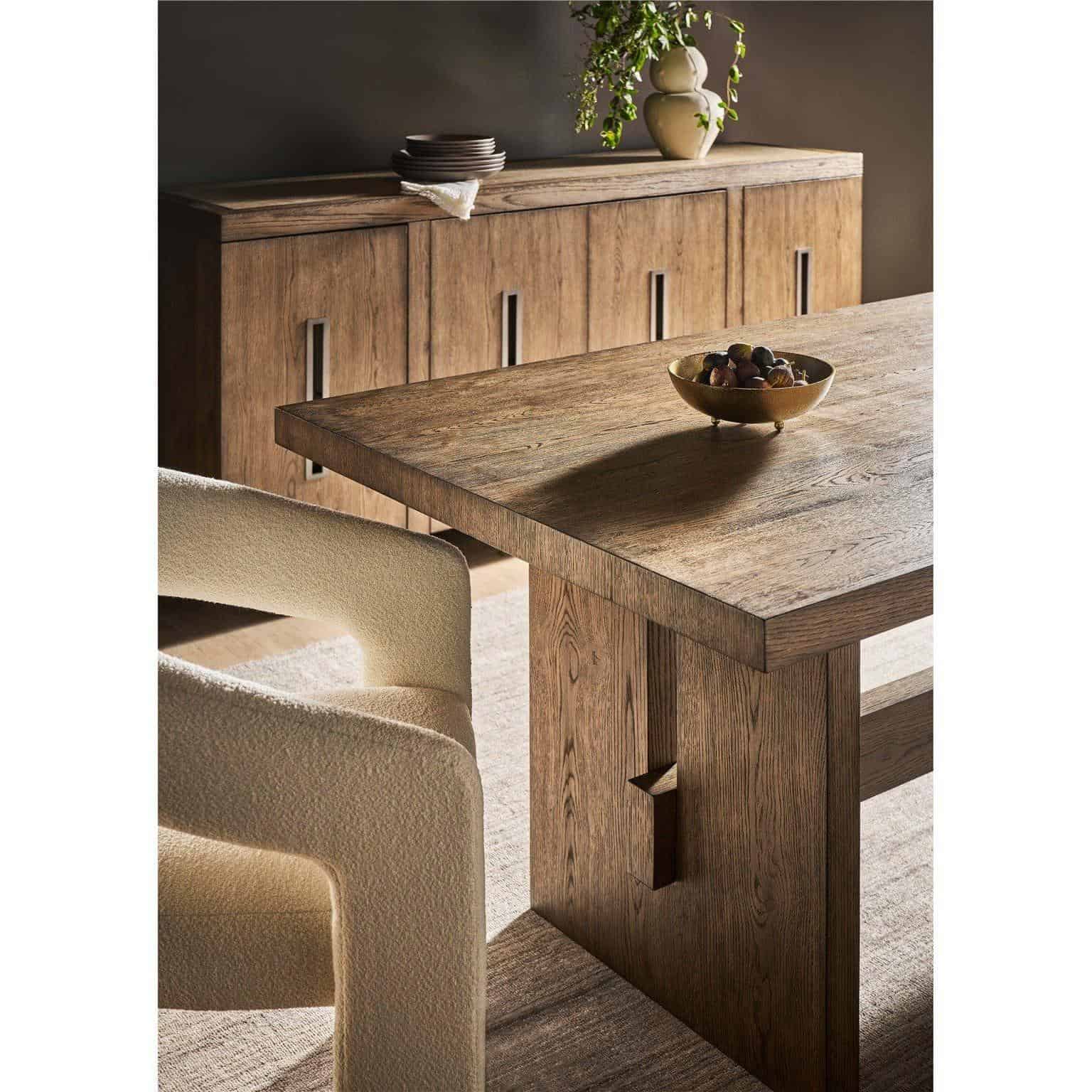 The Eden Dining Table captures the essence of mid-century design with its geometric angles and clean lines, all finished in a warm medium brown. Its subtle wooden detailing adds a layer of sophistication, making this table a timeless centerpiece that effortlessly marries retro flair with modern simplicity.