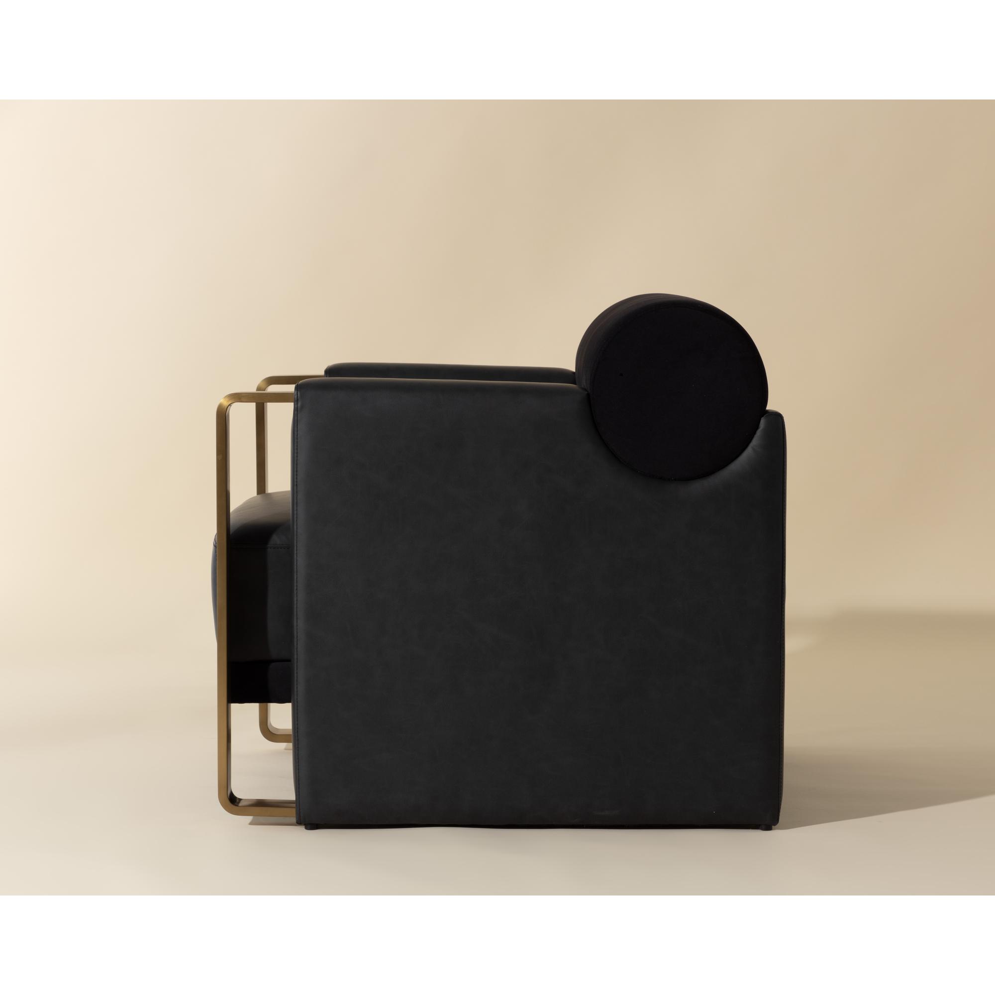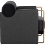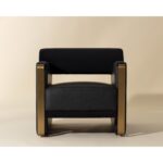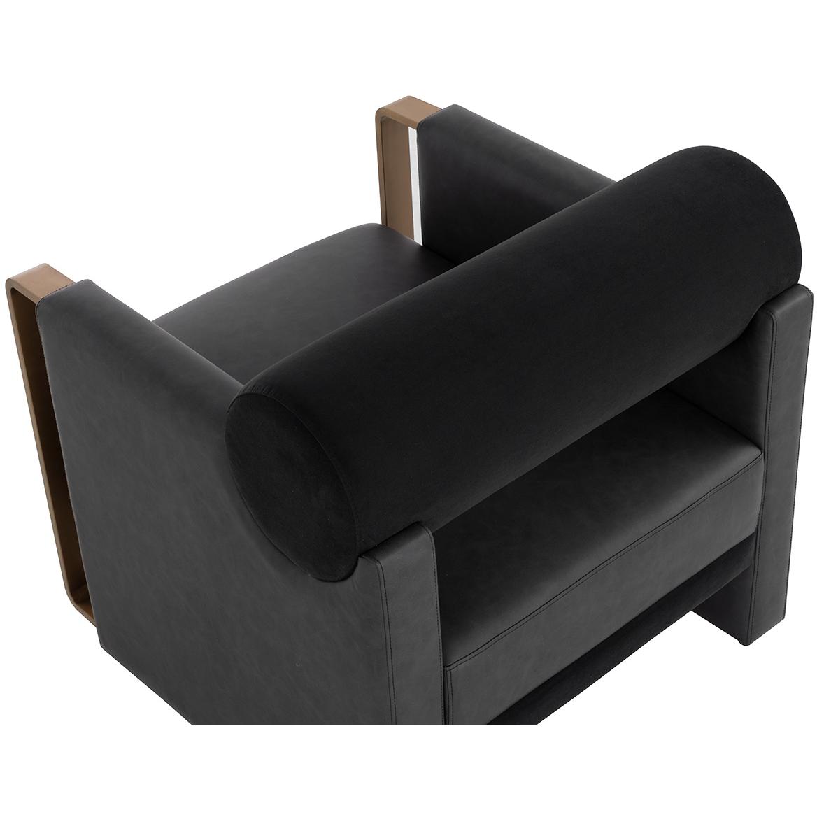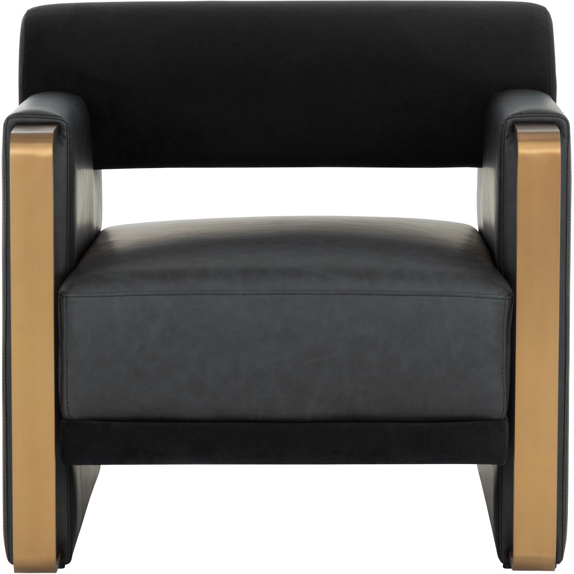 The Edgar Lounge Chair strikes a perfect match between prime visual appeal and satisfying comfort. Elegantly crafted in contrasting abbington black fabric and bravo black faux leather with a supportive bolster back cushion nestled between the chair’s large arms with exposed gold stainless steel.