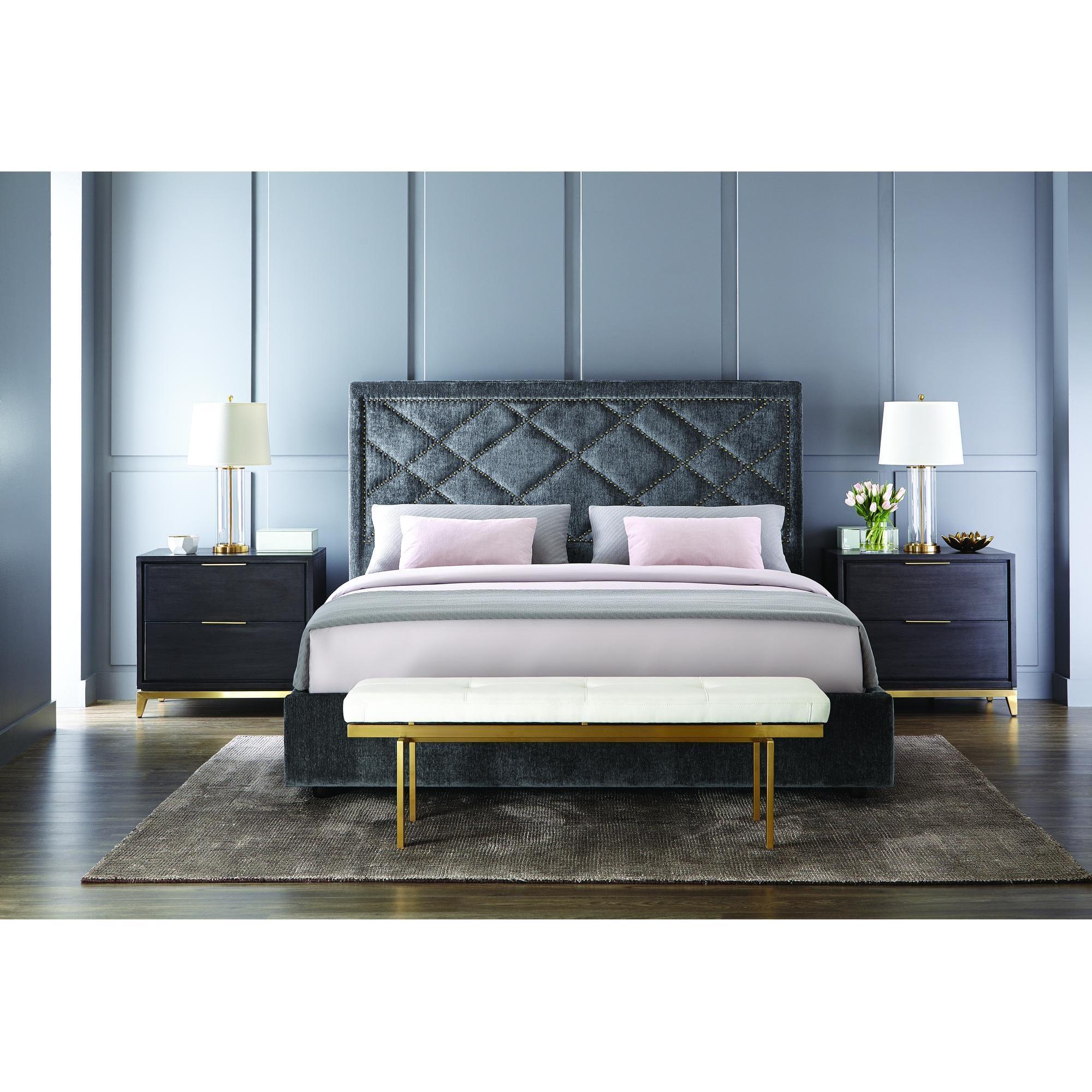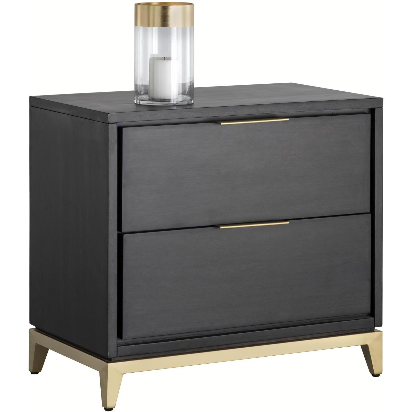 This nightstand will add warmth and allure to any bedroom space. Made of acacia wood veneer in a smoked grey-brown finish with two deep soft-close drawers. Brushed yellow gold steel handles and base complete the look. As wood is an organic, porous material, these pieces will contain natural variation of texture and may also exhibit fine indentations and cracks. Wood pieces will also display a disparity of colour and grain, and visible knots and burls that add to the character of each piece.