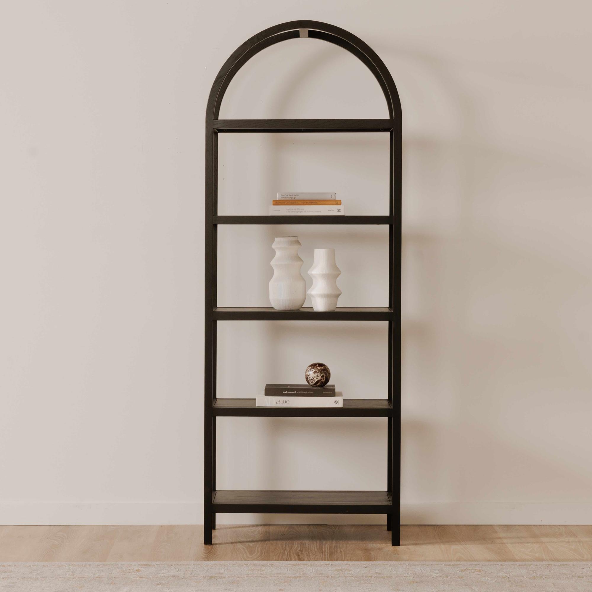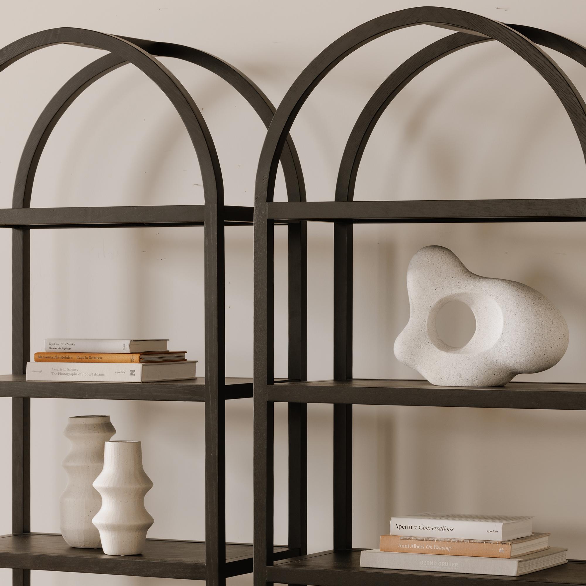 Some bookcases just hold stuff—Eero holds a point of view. Designed to feel light but grounded, its arched support brings a quiet architectural moment to everyday storage. A solid oak frame pairs with oak-veneered shelves to keep your books, keepsakes, and collectibles beautifully organized without feeling precious. Finished in black for a moodier look that still plays nice with modern spaces, Eero turns “storage” into a statement you’ll actually live with.