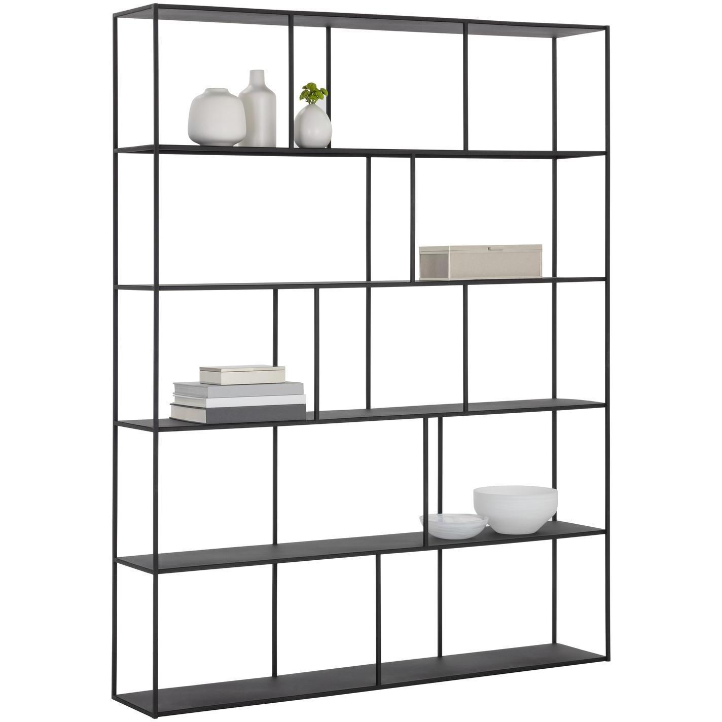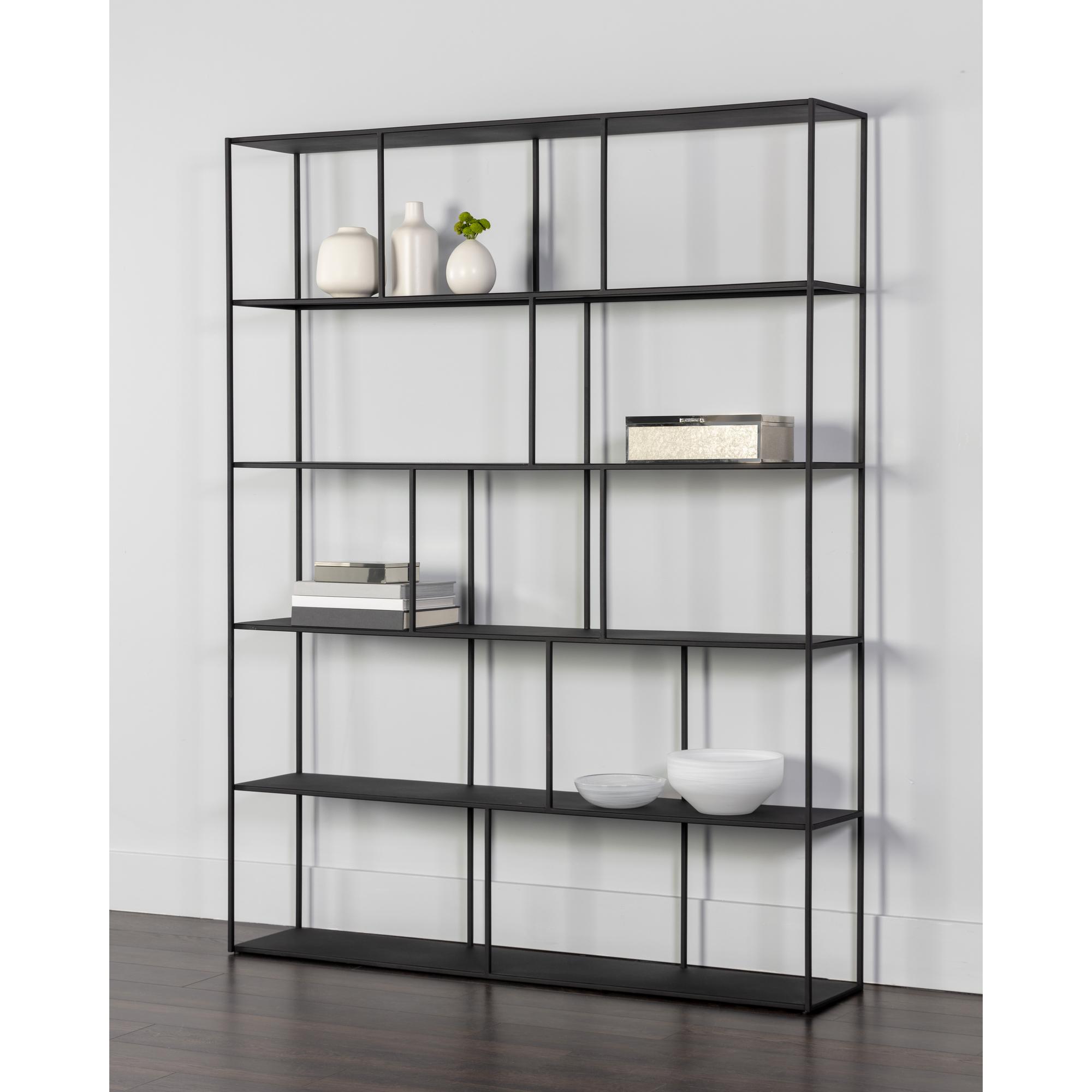 Add style and warmth to living and office spaces with this well-designed iron bookcase in a matte black finish. Can be placed in pairs or multiples for added impact and functionality. Also available in a smaller size. Anti-tipping kit included.