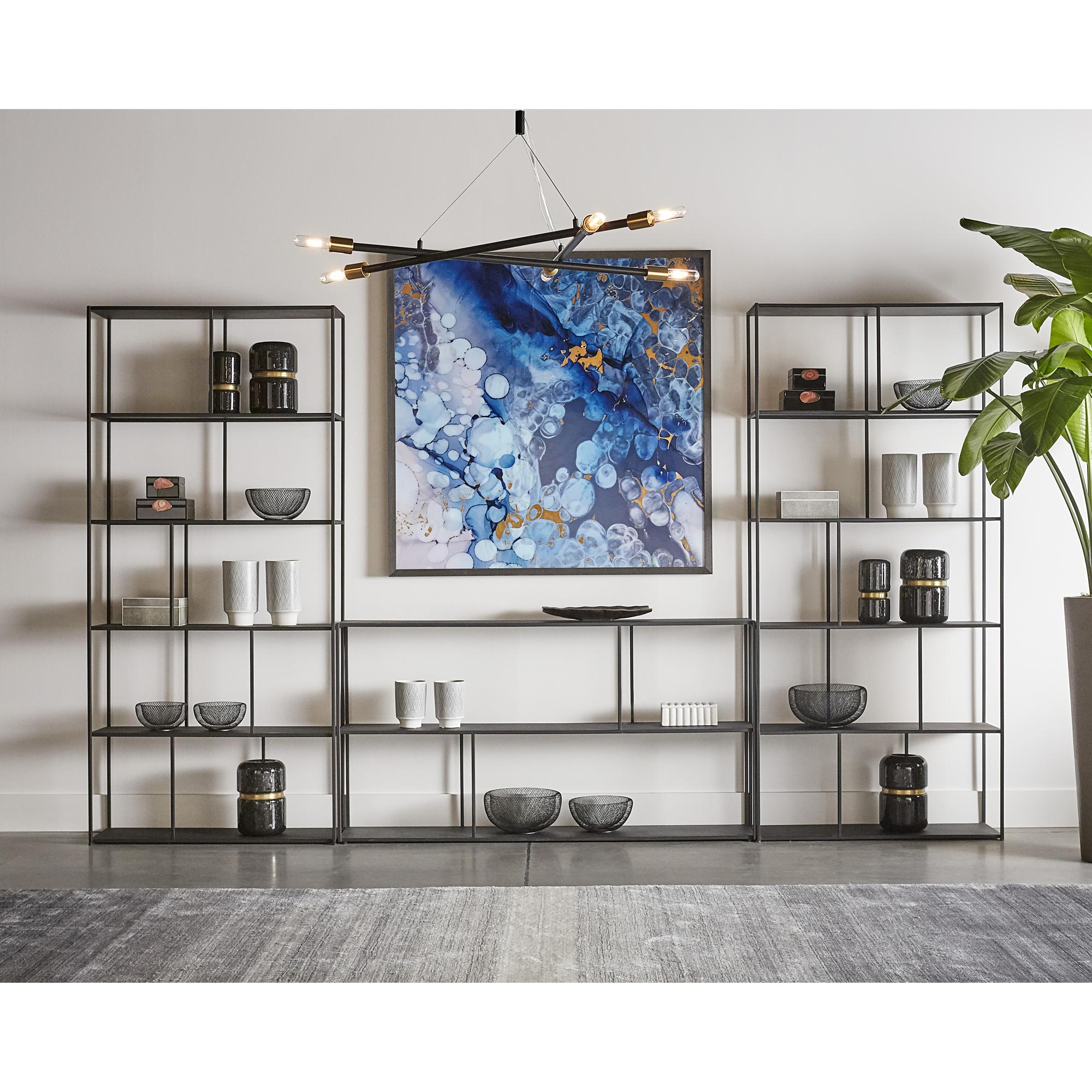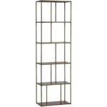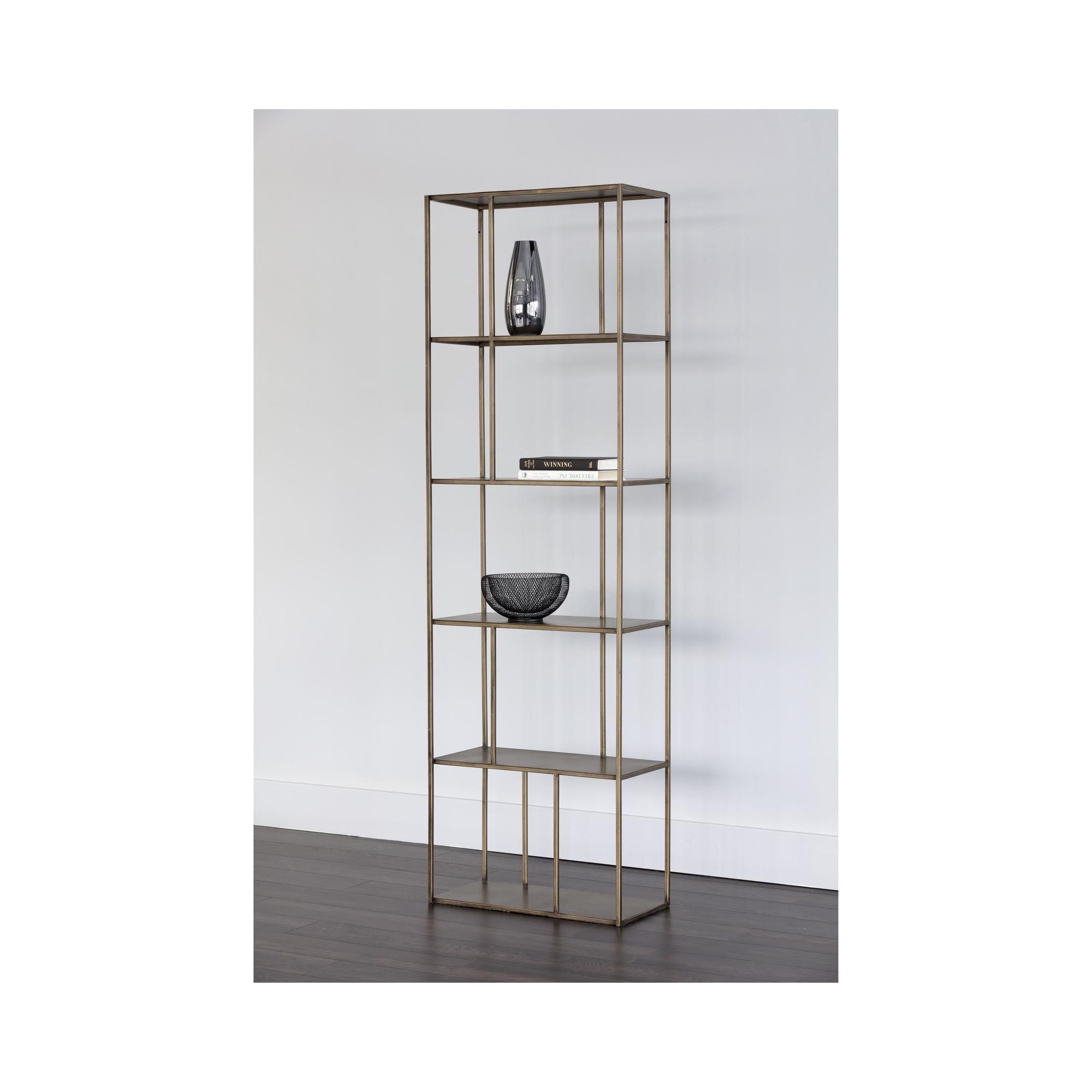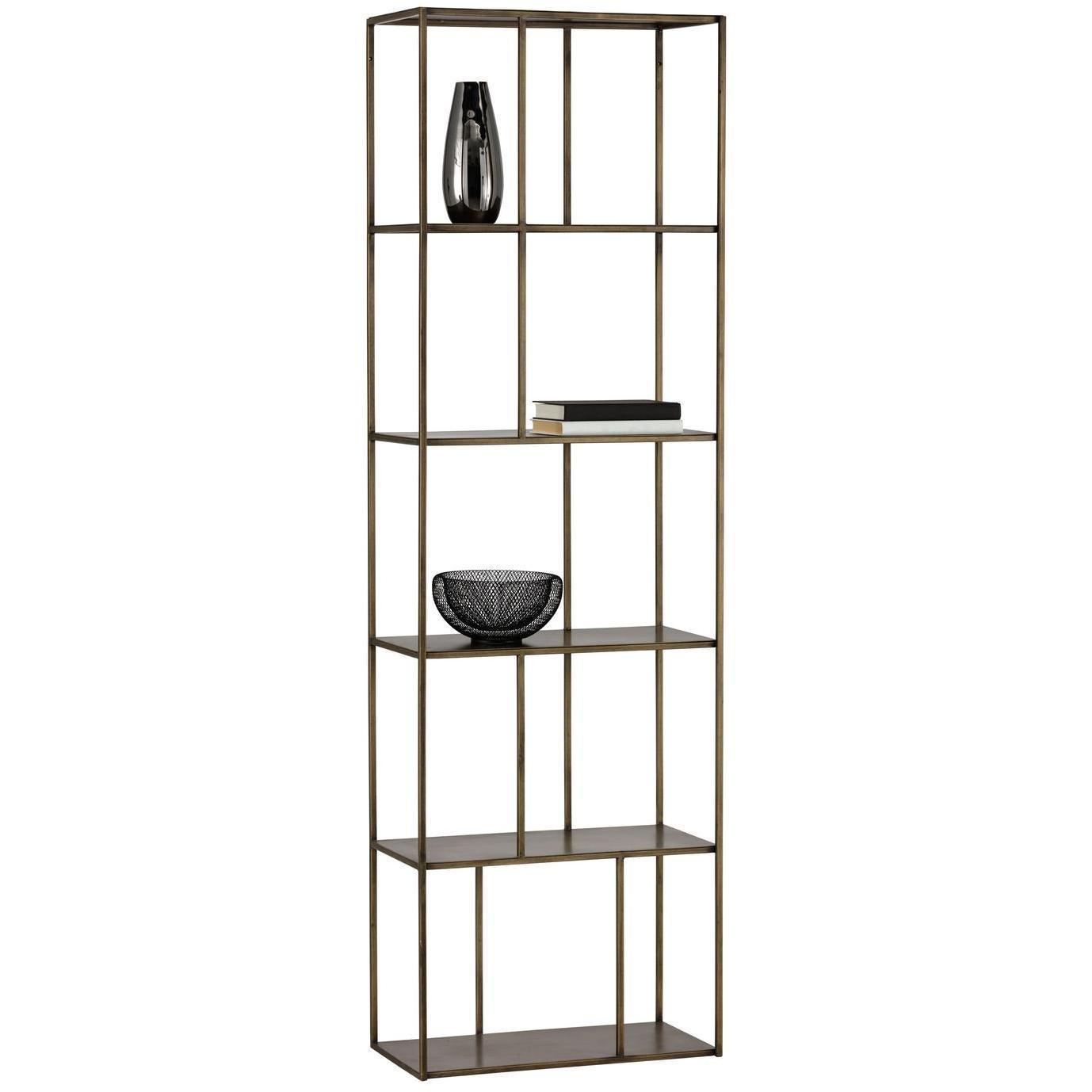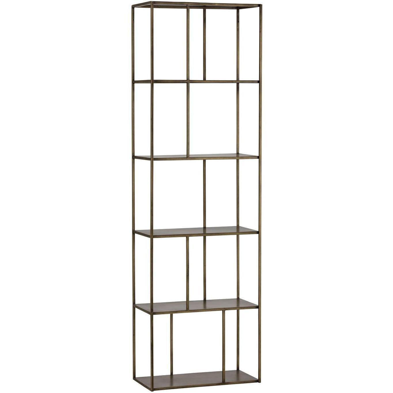 Add style and warmth to living and office spaces with this well-designed iron bookcase in a brushed antique brass finish. Can be placed in pairs or multiples for added impact and functionality. Also available in a larger size. Anti-tipping kit included.