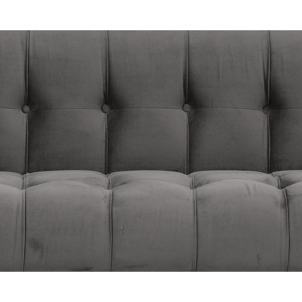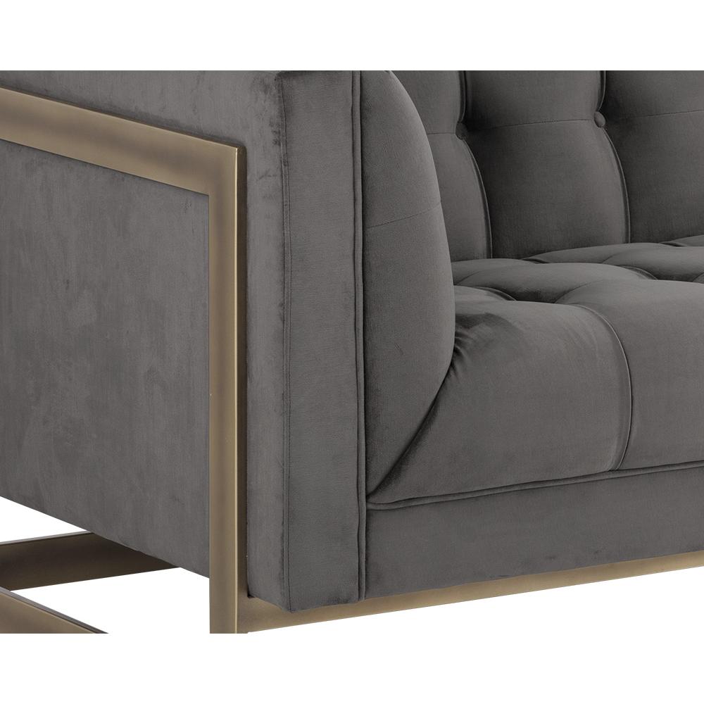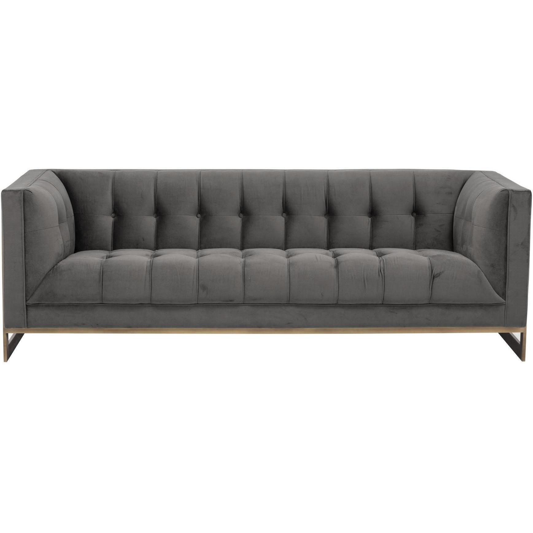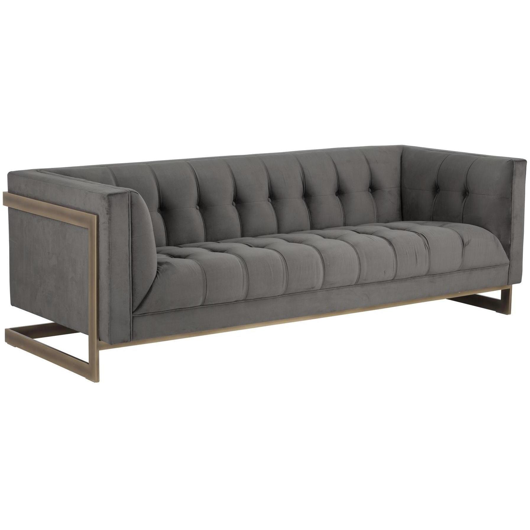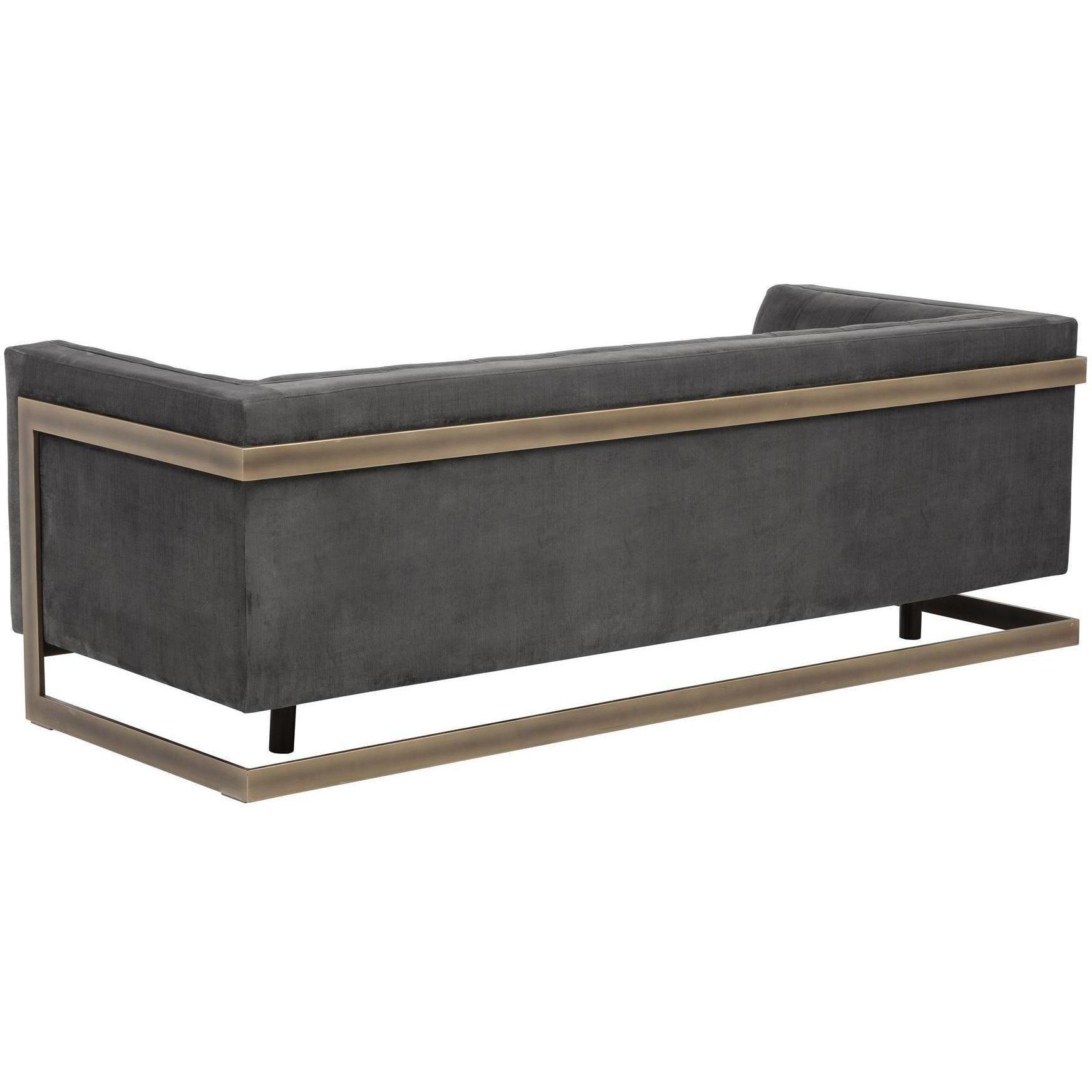 The streamlined design of this sofa is bold yet refined. Features beautiful deep button tufting, piping, and an exposed rustic bronze steel frame. Stocked in piccolo pebble performance fabric. Perfect for residential and commercial settings. Performance fabric is moisture repellent, durable and easy to clean.