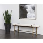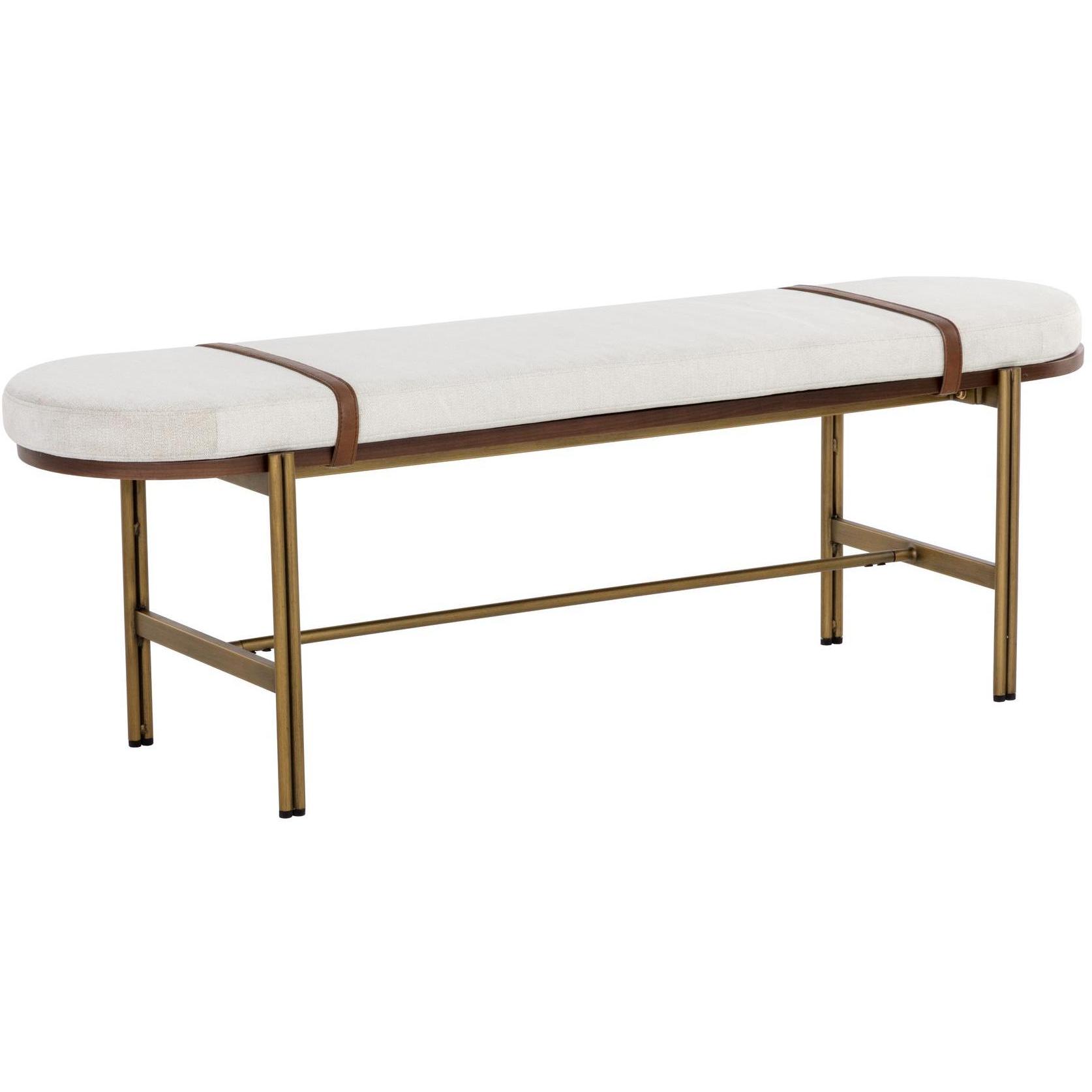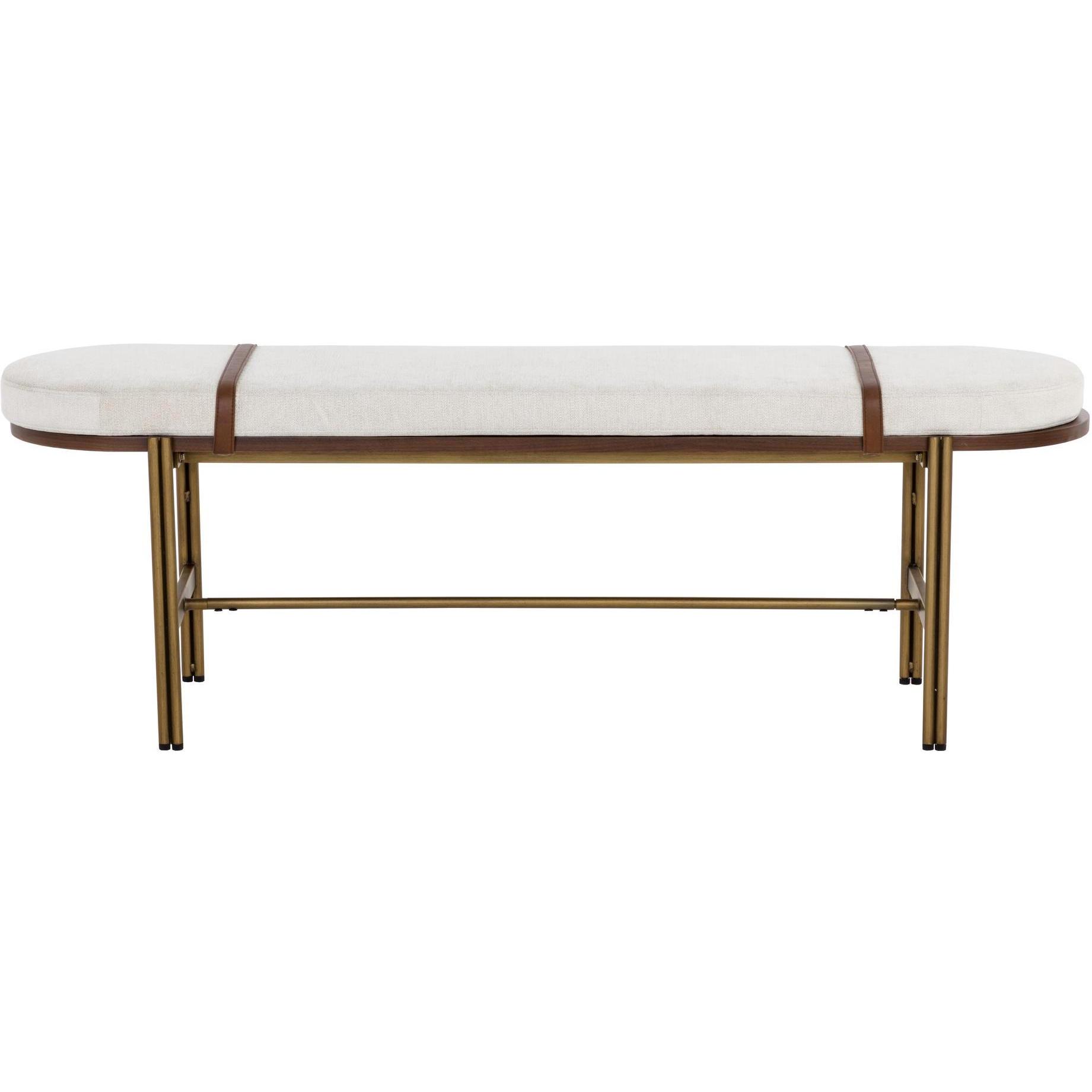With a curved silhouette that features a rich mix of materials, this spectacular bench is a great addition to any space. Stocked in polo club muslin performance fabric with a walnut veener frame. Includes removable bravo cognac faux leather straps and completed with an antique brass steel base.