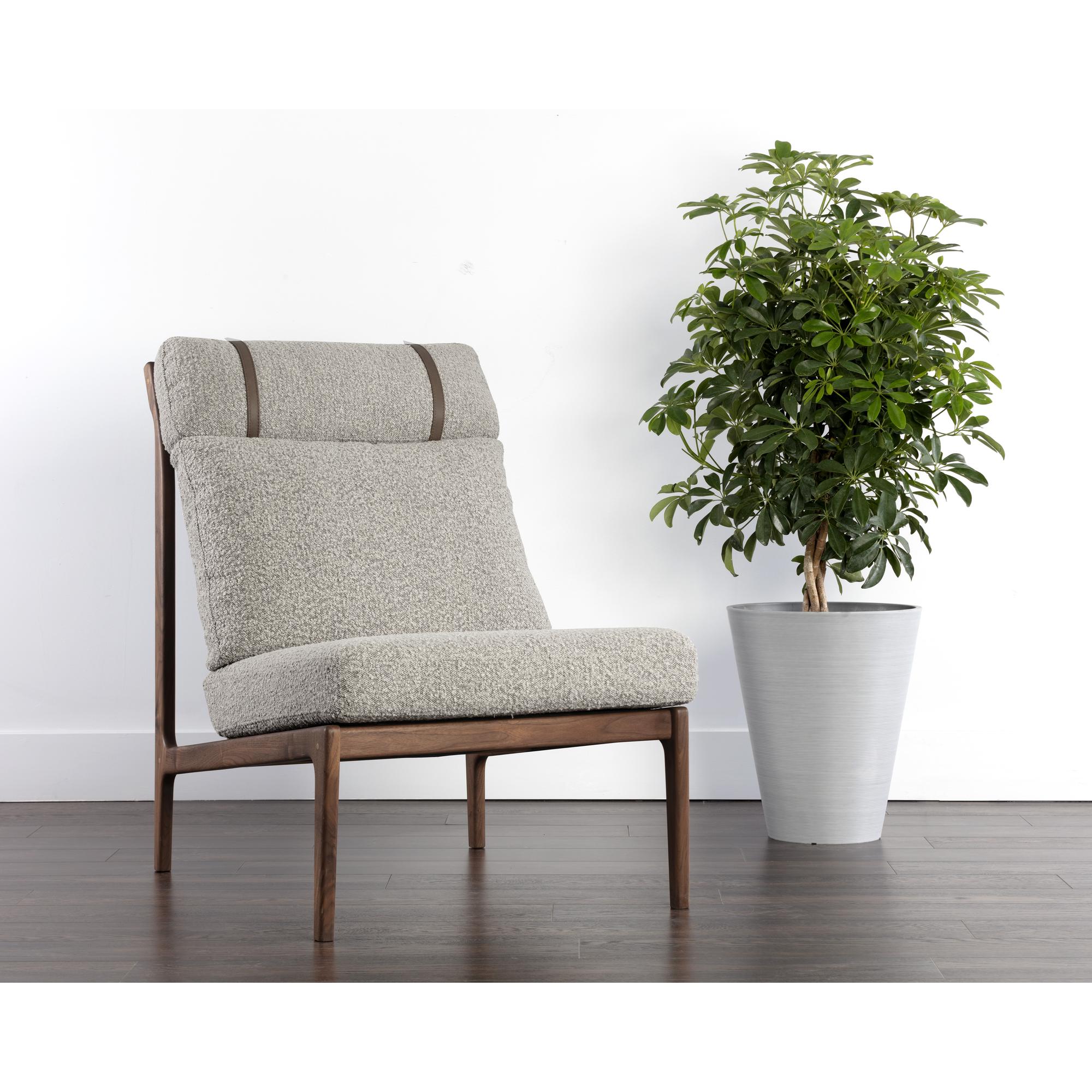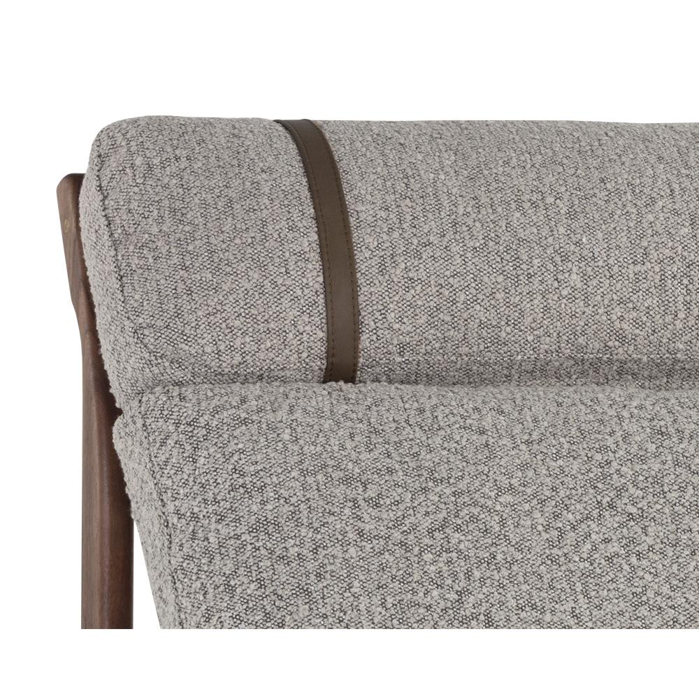 Find a moment to relax in this handsome armless lounge chair. The design combines eye catching elements like altro cappuccino boucle fabric, leather straps and a slatted seatback crafted with solid brown walnut wood for a contemporary look. Altro cappuccino features a warm grey undertone.