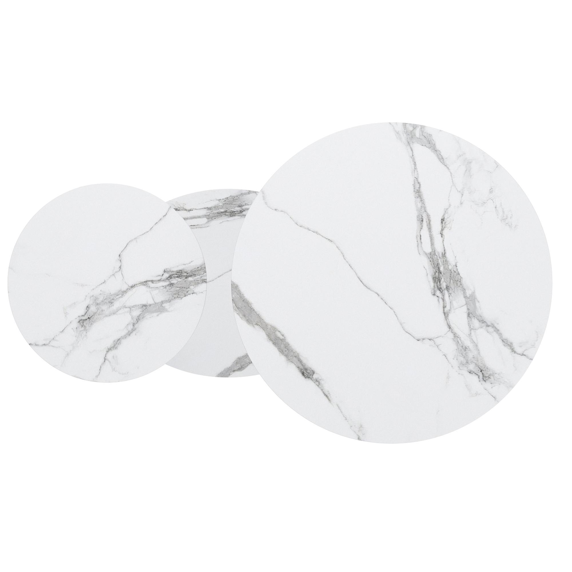 - Sintered stone table tops and base in a white marble finish