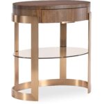 Finish: Light Caramel finish featured on split-heart and quartered walnut veneers. Base and hardware featured in plated Sunlit Bronze metal finish. Glass shelf is a solar-bronze tinted glass