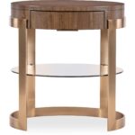 Features: One self-closing drawer with metal tab Plated metal base in a bent-metal base design Floating solar-bronze glass shelf