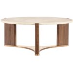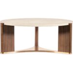 Finish: Light Caramel finish featured on split-heart and quartered walnut veneers. Metal base is featured in plated Sunlit Bronze metal finish. Marble top features white and beige coloring.