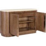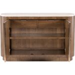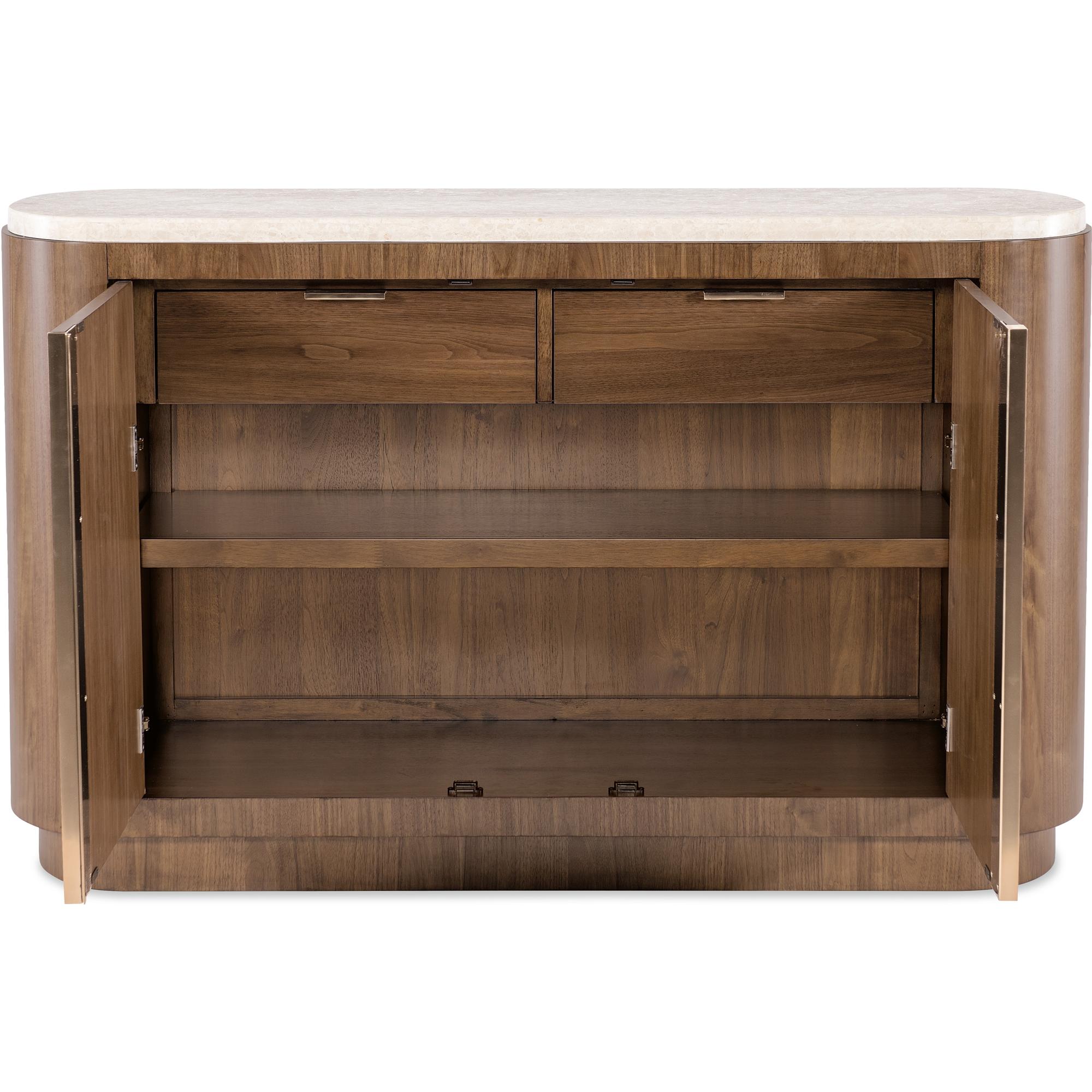 Features: Honed marble top Two wood doors with inset hardware, soft-close hinges and magnetic catches Two self-closing drawers with metal tab pulls behind doors Right drawer has a drop-in silverware tray One adjustable wood shelf Plinth base