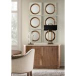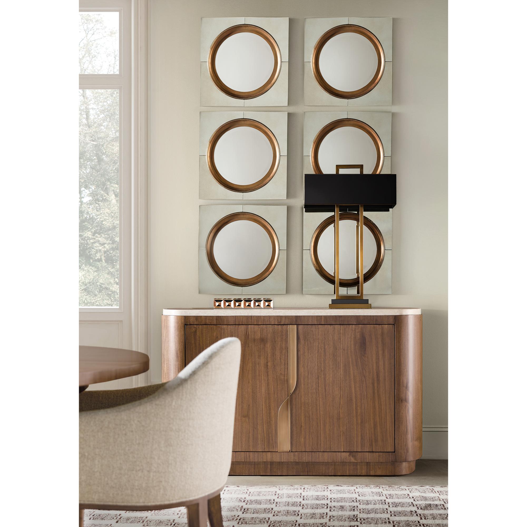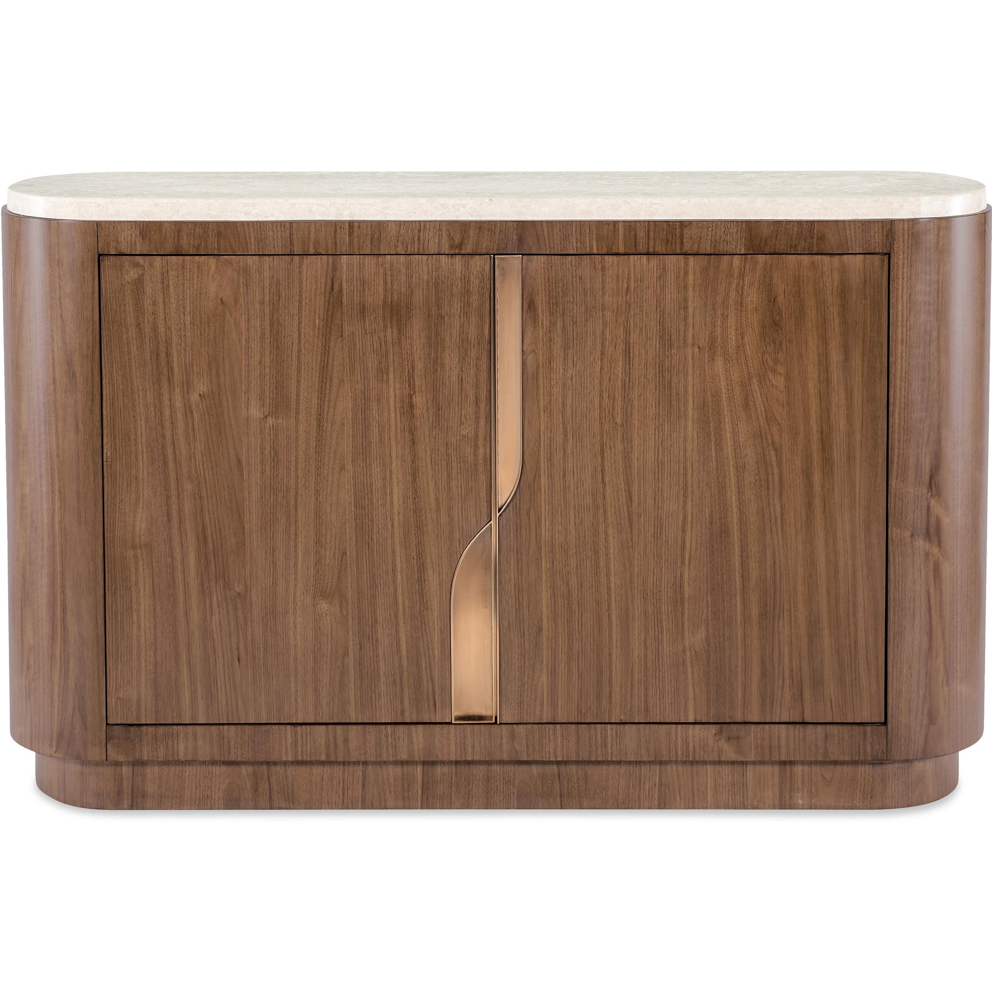 Finish: Light Caramel finish featured on split-heart and quartered walnut veneers. Hardware featured in plated Sunlit Bronze metal finish. Marble top features white and beige coloring.